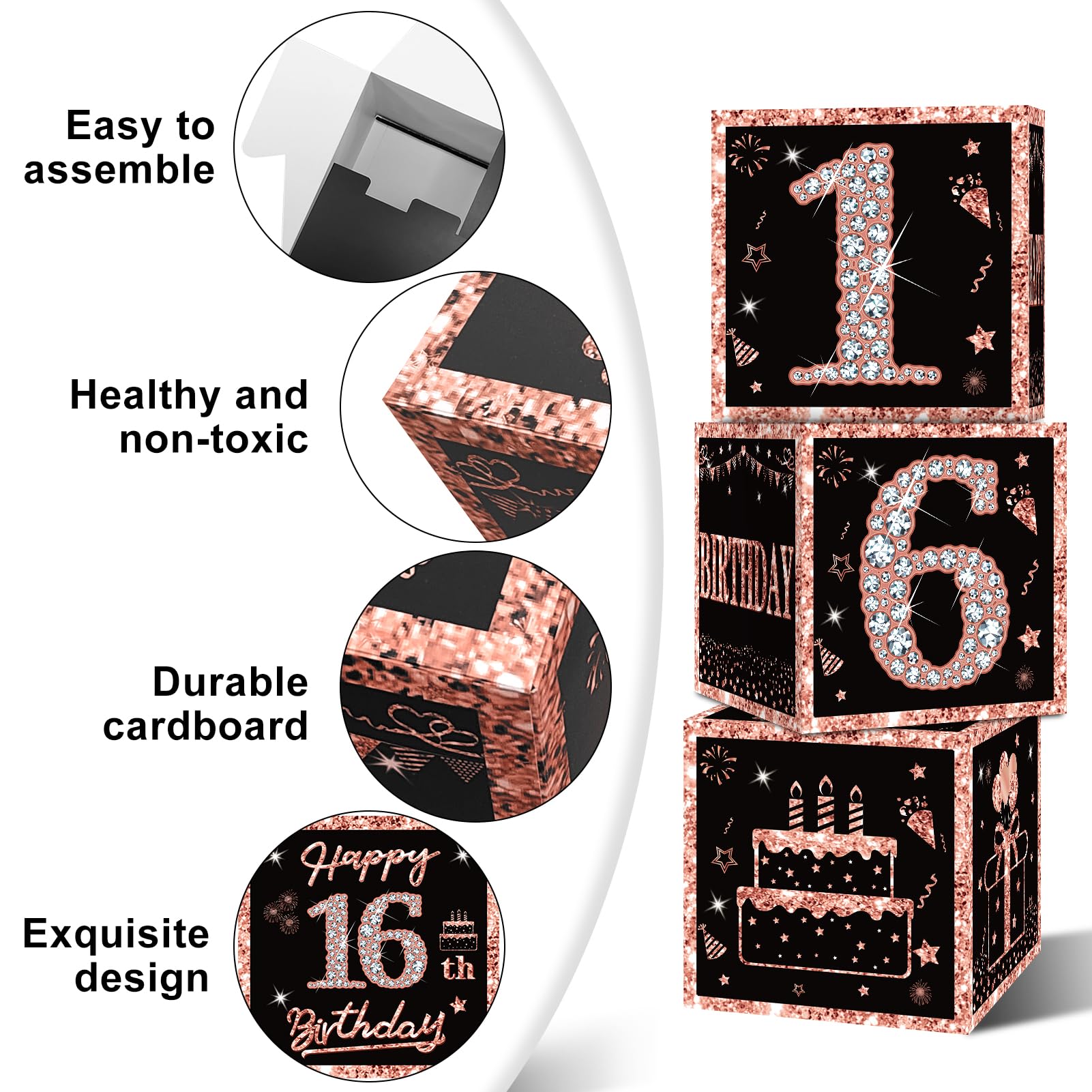 [You Will Receive] -3pcs rose gold 16th birthday balloon boxes decorations, the size of each box is 11.8×11.8×11.8inch. This set of great 16th birthday party display decorations. (Note: This set of decorations does not include balloons).