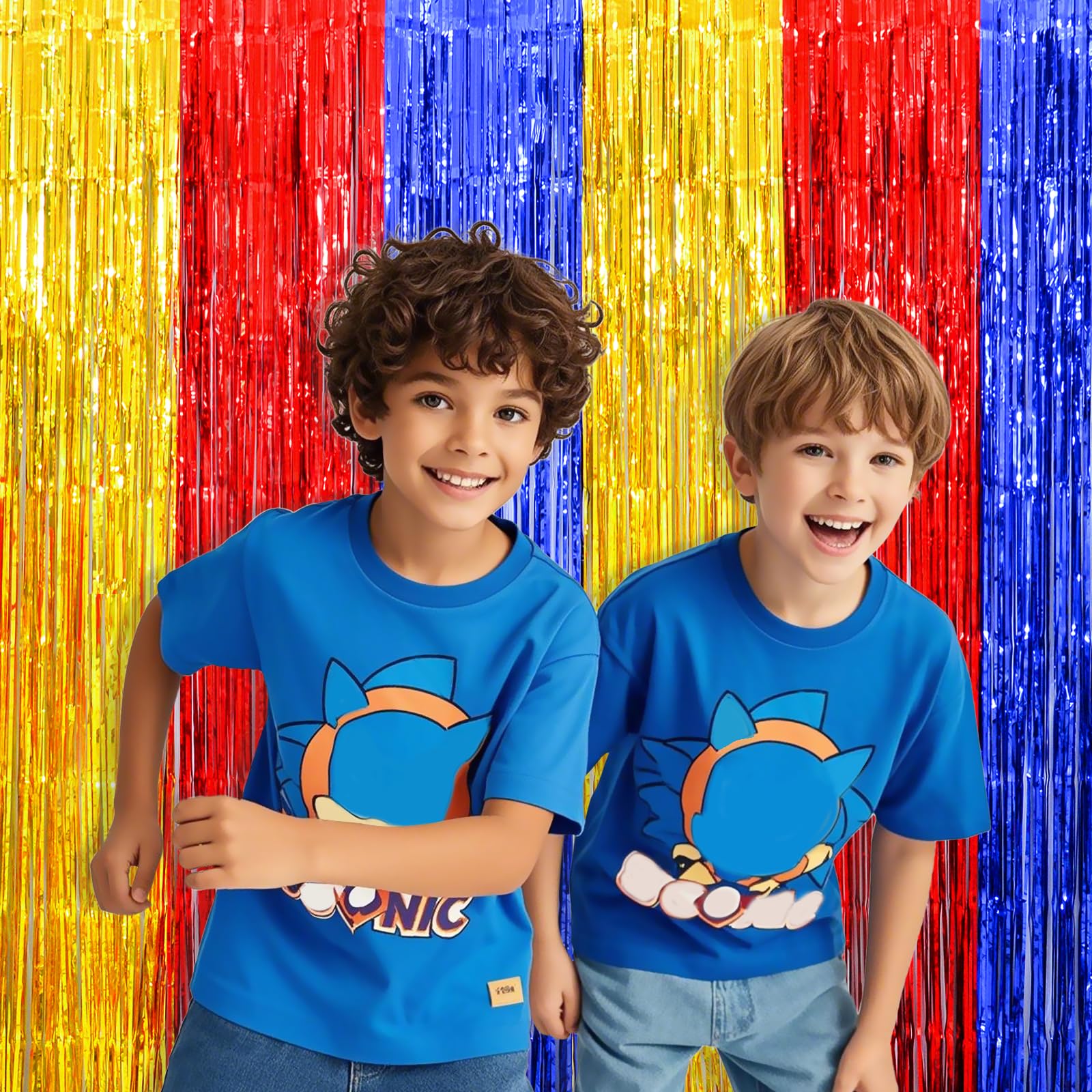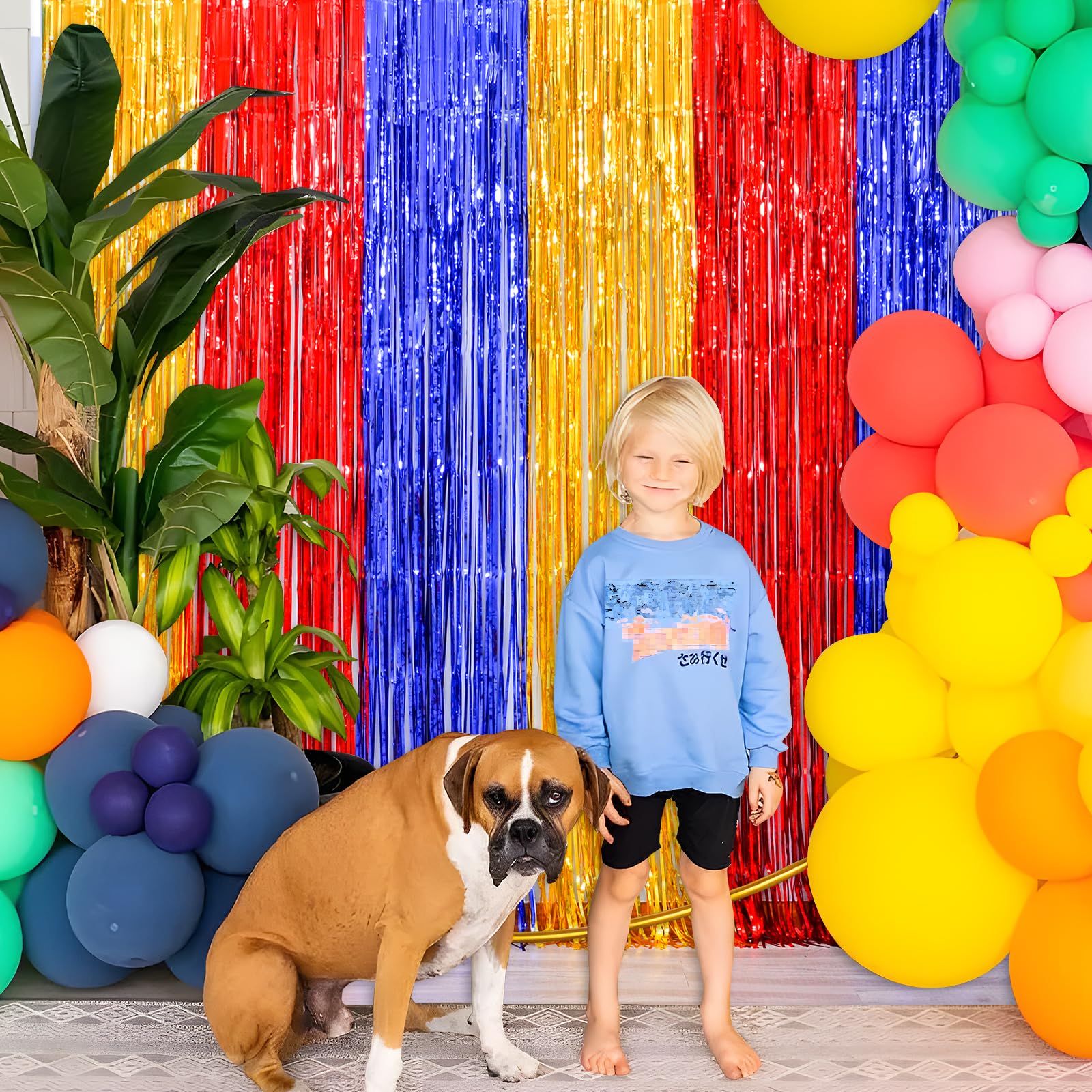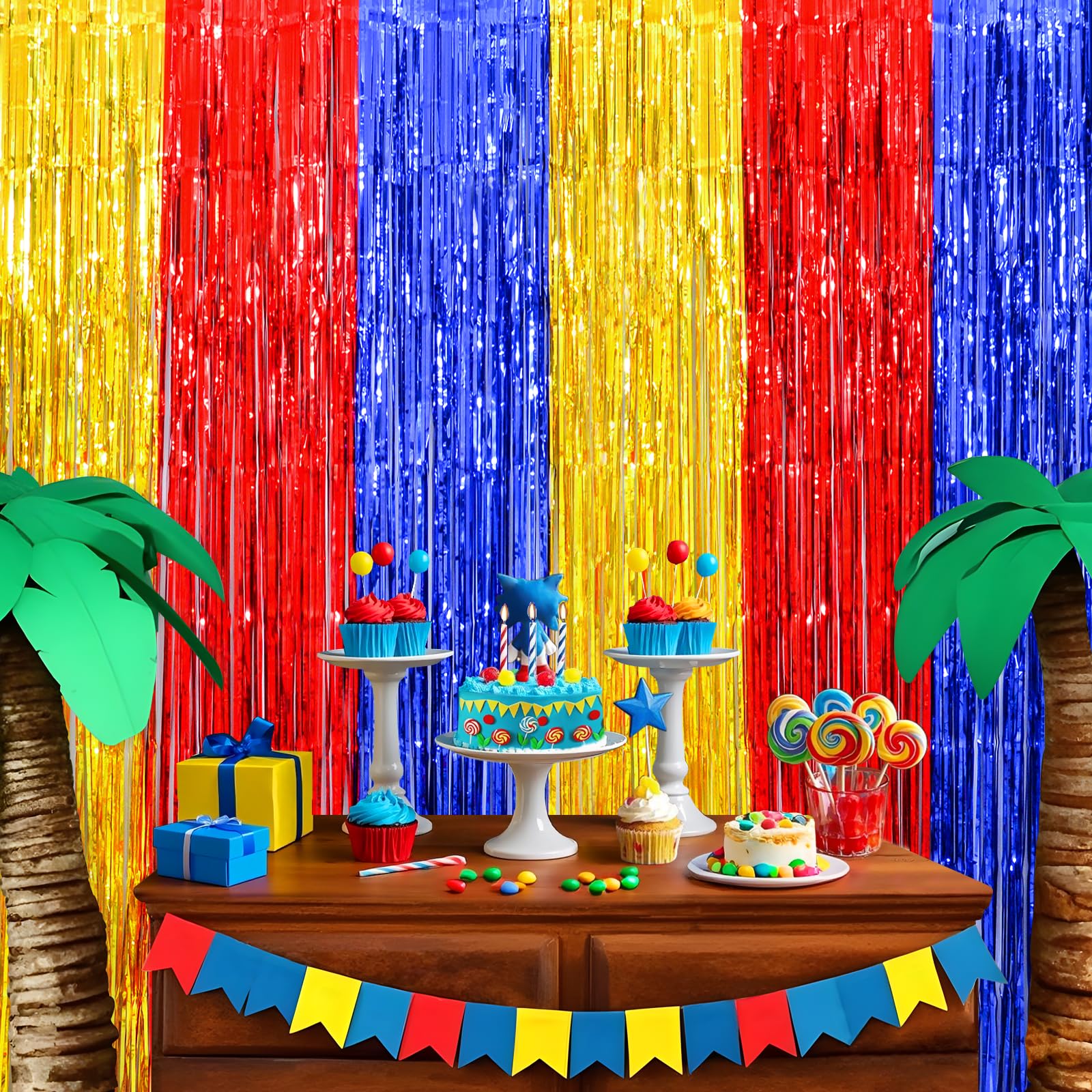 🦔 CARTOON ANIMAL BIRTHDAY DECORATIONS: 2 packs of gold red blue tinsel foil fringe curtains, extra large size (width x drop) 3.3 x 6.6 ft each, perfect for gold red and blue birthday party photo backdrop.