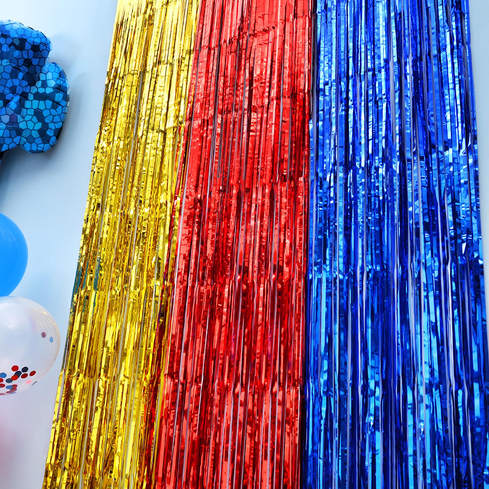 🔵 GOLD RED AND BLUE BIRTHDAY PARTY SUPPLIES: Our unique tinsel foil fringe curtains are the perfect photo backdrop for every gold red and blue party decoration and room decor. You will be amazed at the colorful atmosphere and view they create.