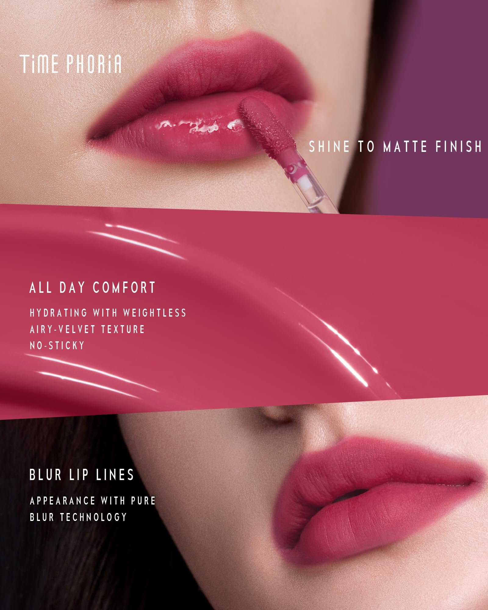 TWO-IN-ONE FORMULA · ALL-DAY WEAR · BLURS LIP LINES SHINE TO MATTE IN JUST A SINGLE PRODUCT ALL DAY STAIN AND COMFORT BLUR THE APPEARANCE OF LIP LINES