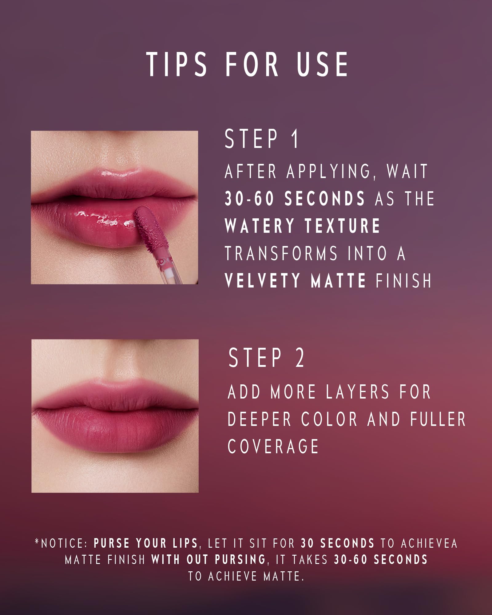 Notice For Use: After applying, be sure to wait 30-60 seconds as the watery texture transfers into avelvety matte finish. *Purse your lips and let it sit for 30 seconds to achieve a matte finish; *Without pursing, it takes 30-60 seconds for them to achieve matte.