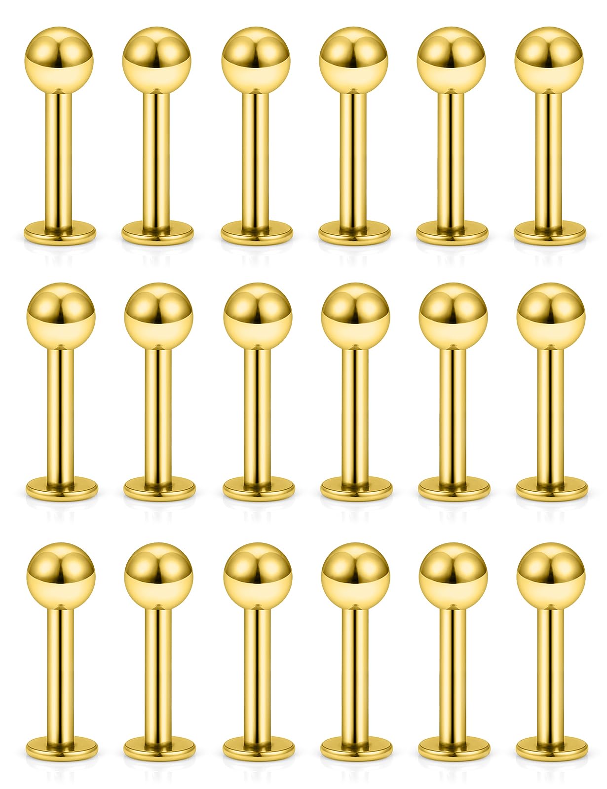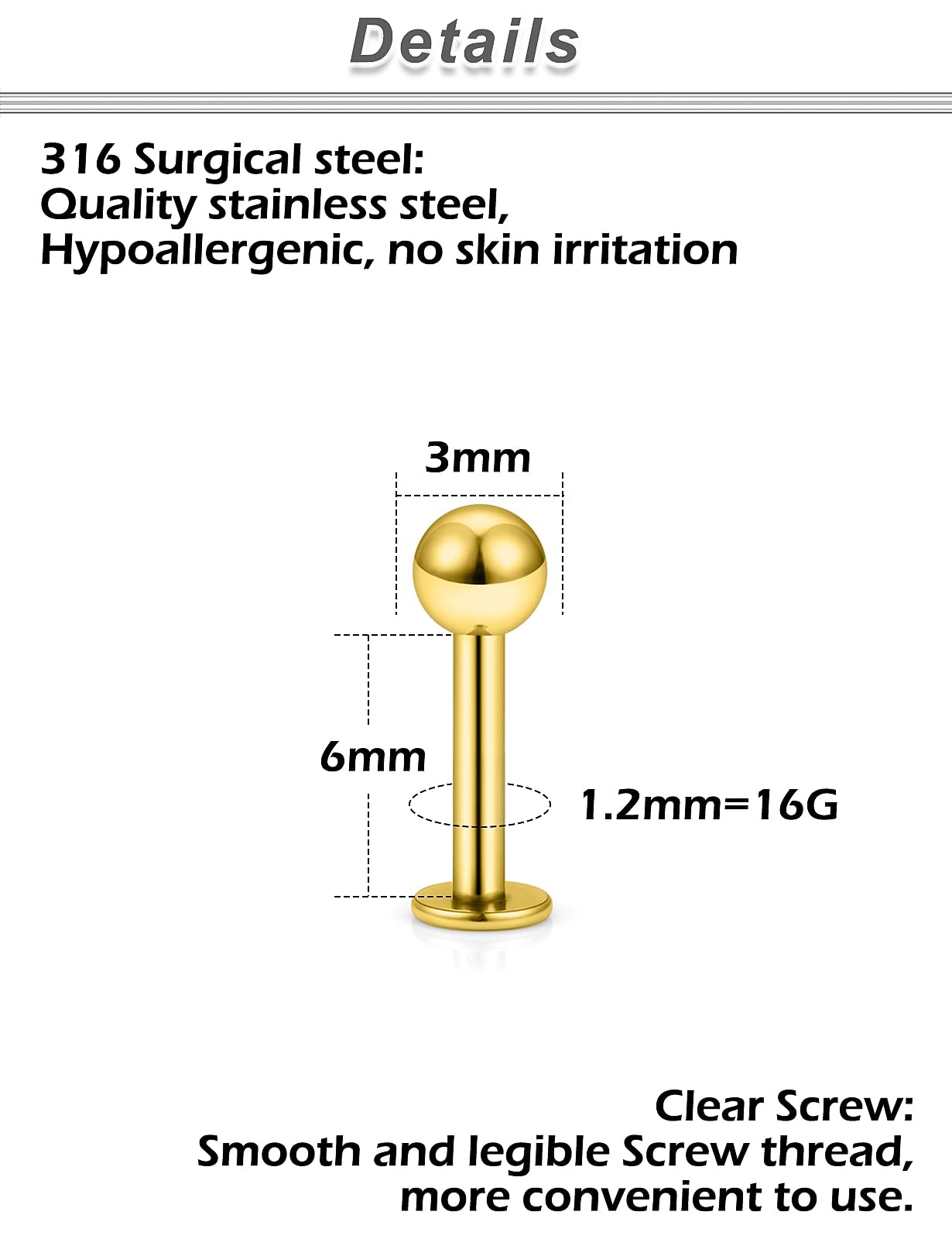 MEASUREMENTS--Lip Rings Studs Gauge Size: 16G (1.2mm); Straight Bar Length: 6mm(1/4 Inch),Top Size:3mm, The Different Sizes Made It Easy to Find the Right One for You. Color: Gold-tone.