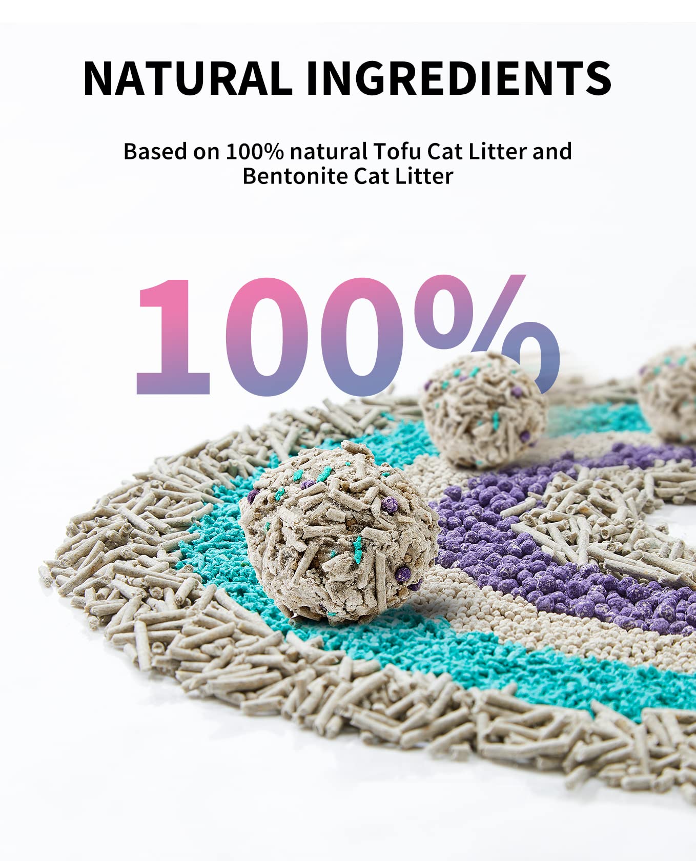 5-in-1 Mixed Cat Litter: Made of all-natural ingredients, 67.66% tofu cat litter and activated carbon(diameter 1.8–2.1mm, length 7-16mm), 29% bentonite cat litter(length 1.7–3.0mm), 2.91% litter mate(length 1.7–3.0 mm), and 0.43% deodorant particles (length 0.5–1.6mm)