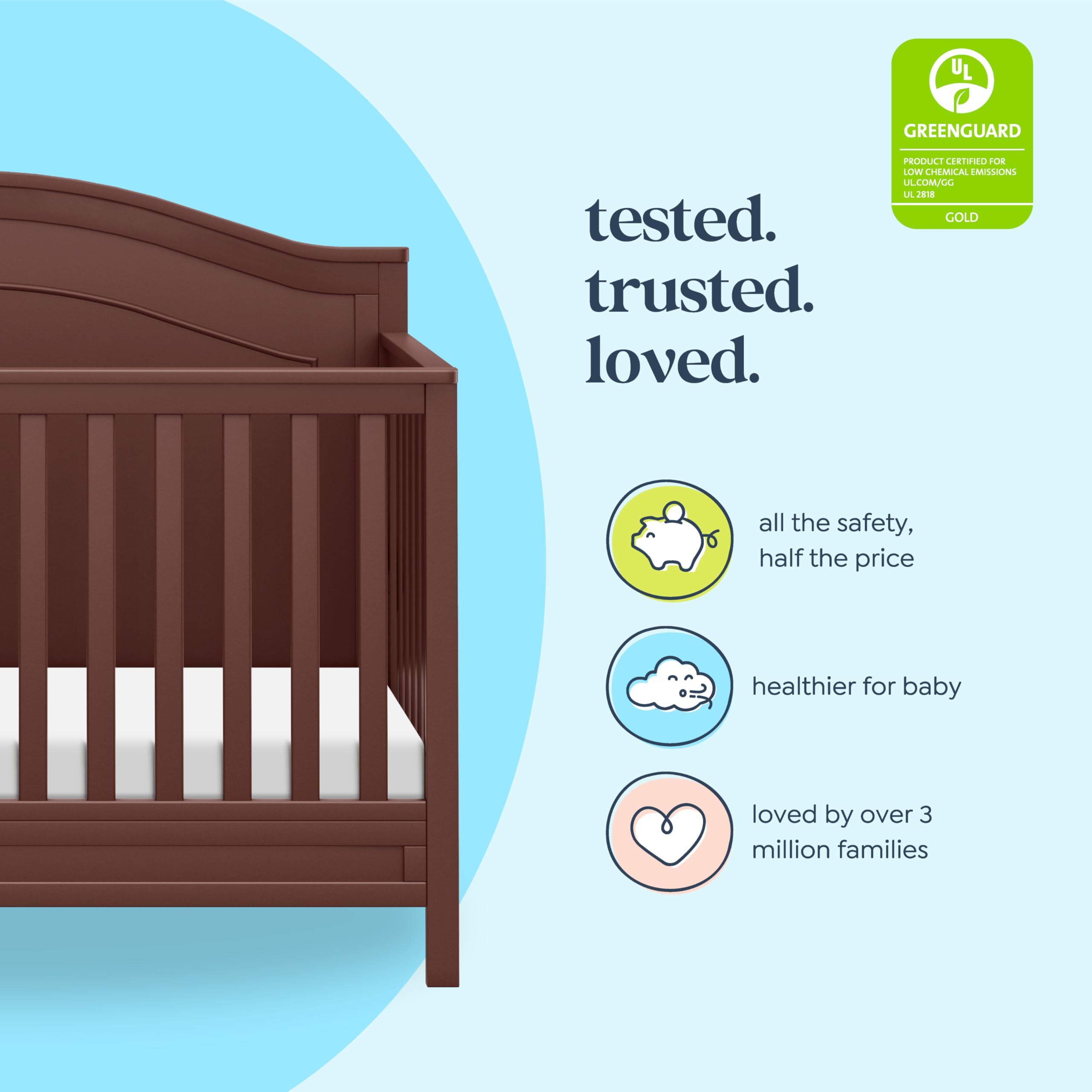 GREENGUARD Gold Certified: Our baby crib 4-in-1 convertible is rigorously tested for over 10,000 chemical emissions & VOCs. Finished with a non-toxic painting process that’s lead and phthalate-safe, our baby beds ensure a clean, healthy space for your baby to sleep, play, and grow.