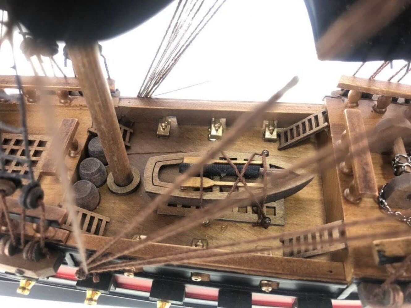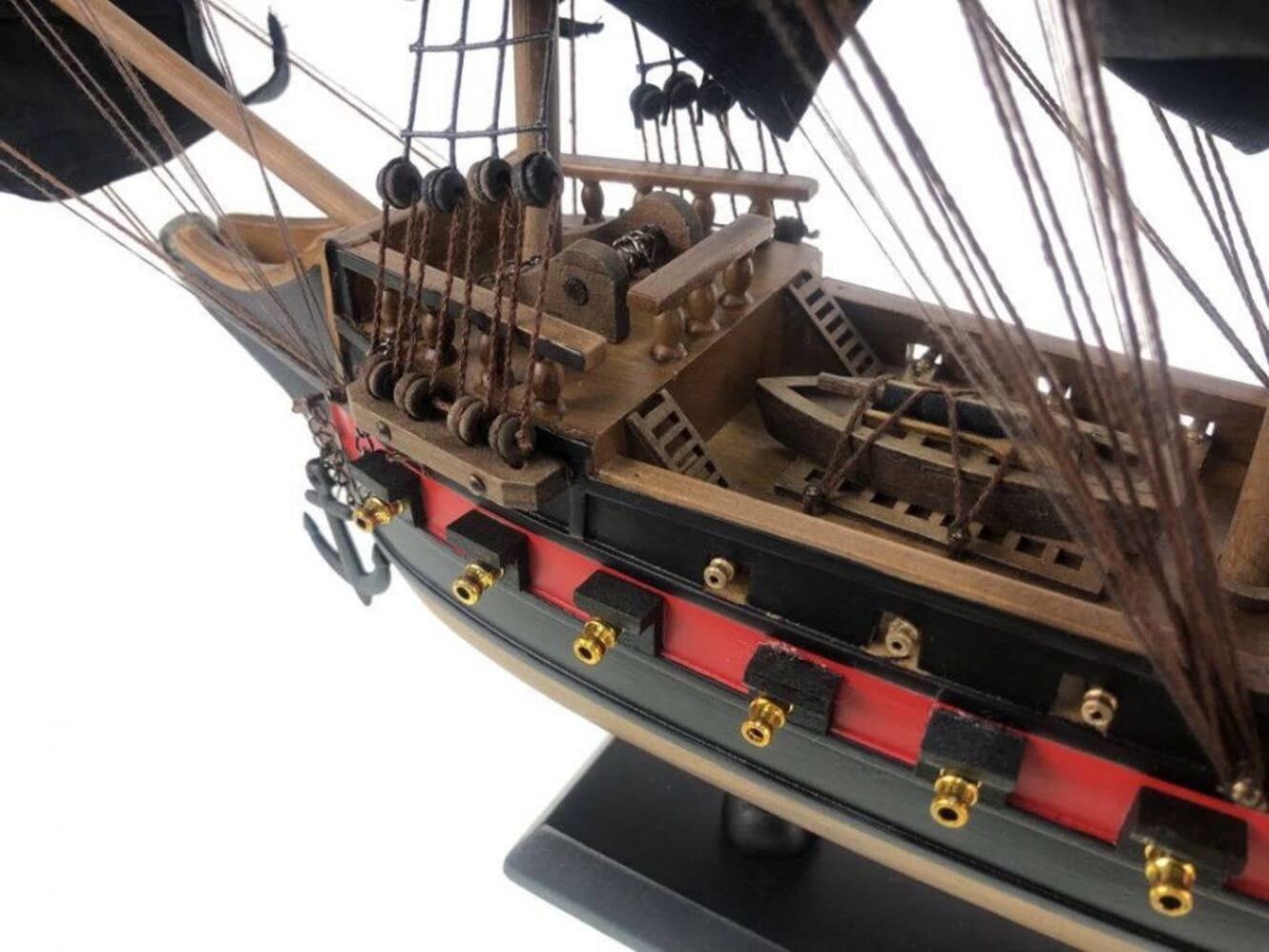 Search for lost treasure as you set sail for adventure on the high seas aboard this scale tall model ship replica of the Black Pearl Pirate Ship. This exquisitely constructed sailing ship is highlighted by fine craftsmanship and attention to detail. This Black Pearl pirate ship model proudly displays its exquisitely-crafted features whether seated upon a shelf, desk, or table, and bring an indomitable spirit of adventure to any room or office. Arrives fully assembled with all sails mounted High quality woods include cherry, birch, maple, and rosewood Handcrafted wooden hull and masts On Deck Wooden Lifeboat with Oars 22 hand sewn black cloth sails Wooden display base with metal name plate