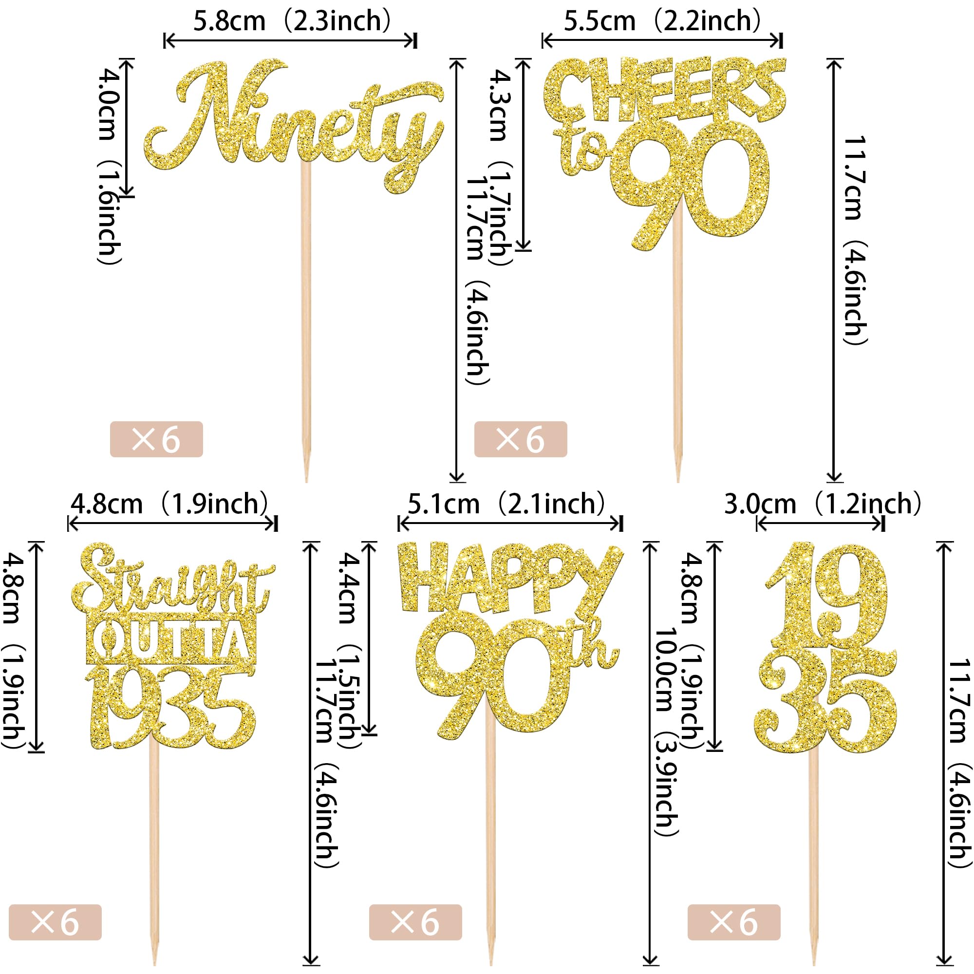 Straight Outta 1935 Cupcake Toppers for Happy 80th Birthday Anniversary Party Cake Decorations Supplies Perfect for happy 90th bithday theme party,straight outta 1935 theme party,90th wedding anniversary theme party,cheers to 90 years theme party cupcake decorations supplies. Pack of 30 pcs,6 pcs of each design The size is 2.3*4.6/ 2.2*4.6/ 1.9*4.6/ 2.1*3.9/ 1.2*4.6 inch ( with stick ) Made of high quality paper card stock,thick and sturdy. These cupcake toppers are single glitter, the back is white, and they are intended for decoration only, please do not put them in oven or microwave. If the item you received has any defects, please contact us immediately.we will deal with it within 24 hours.