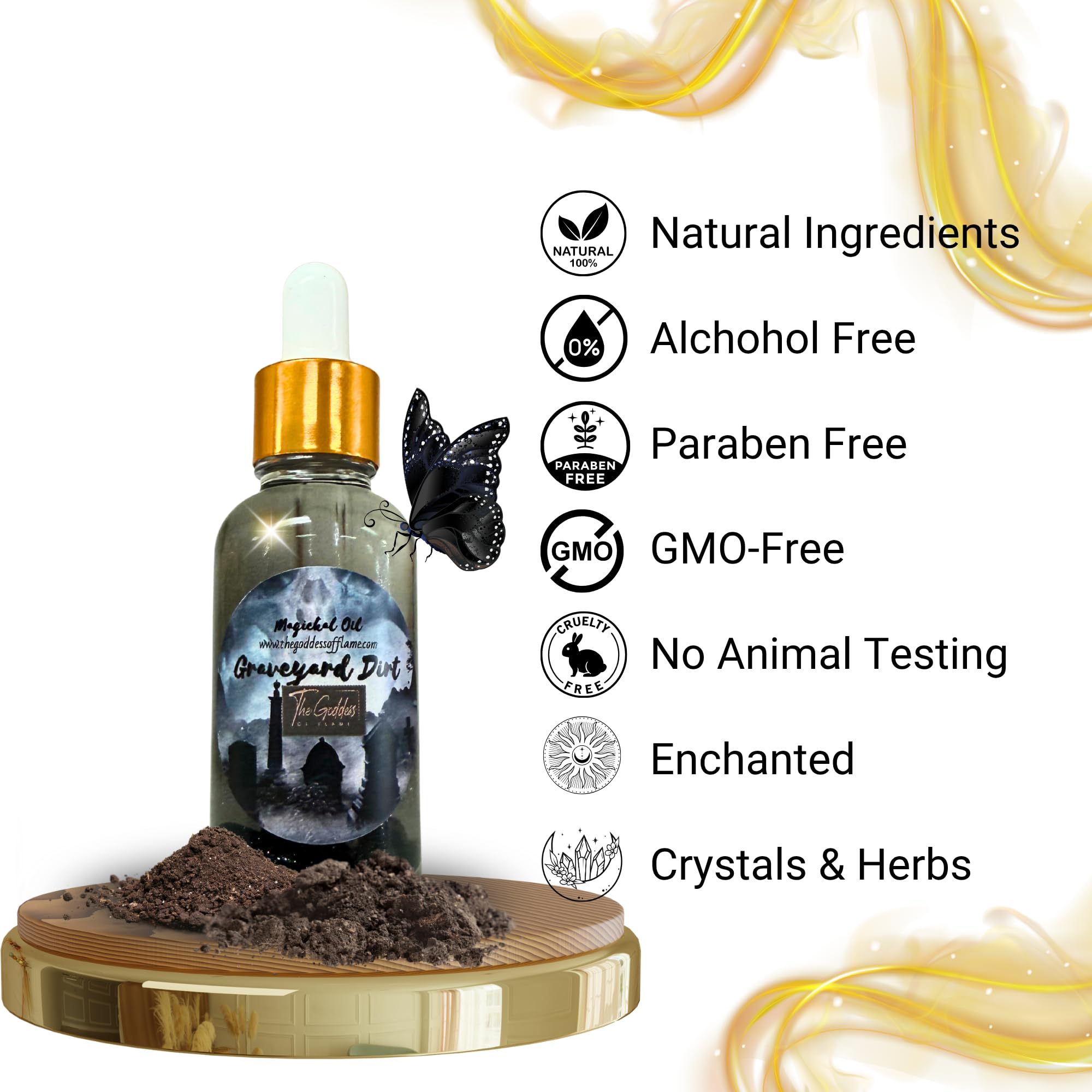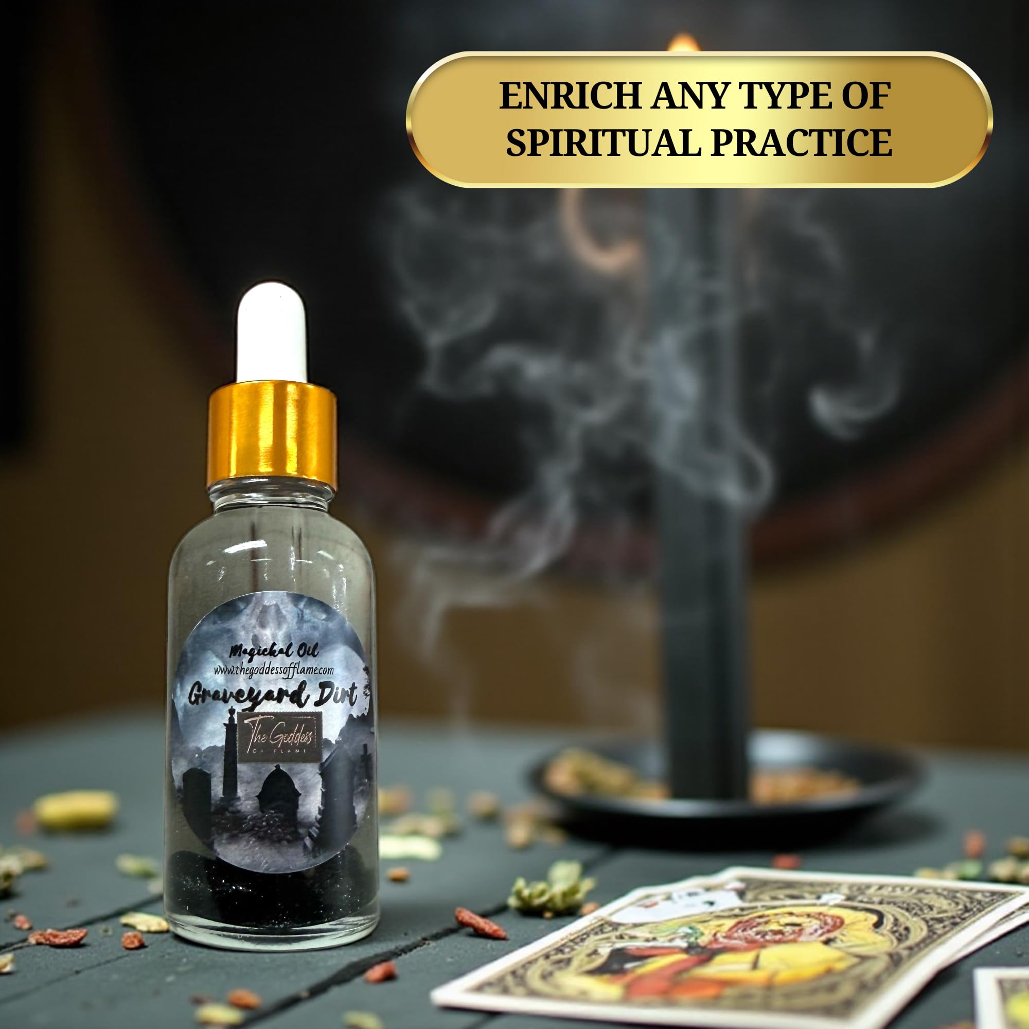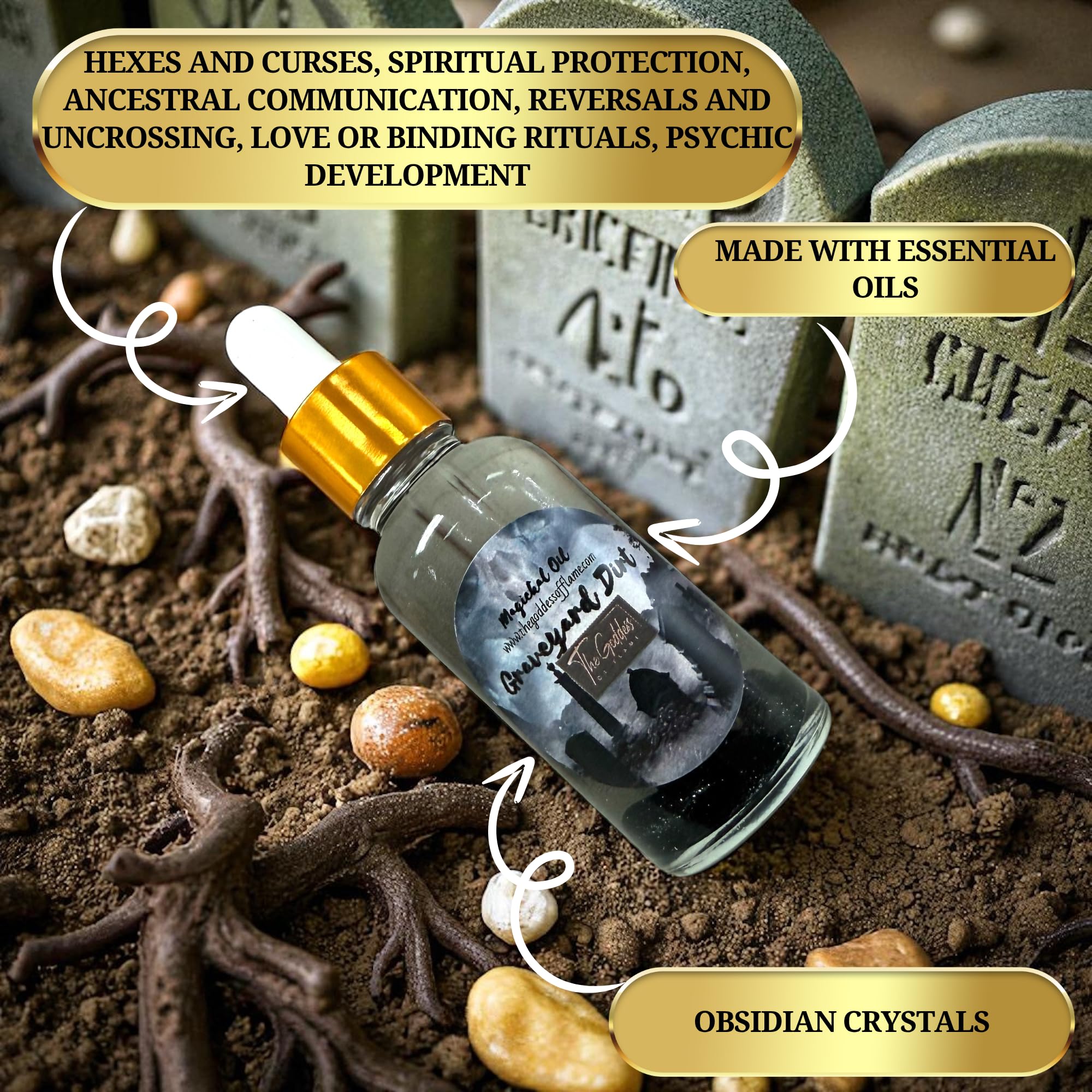 Honor your ancestors and command spiritual power with The Goddess of Flame Graveyard Dirt Oil. This potent ritual oil is crafted for banishing negativity, protection, and ancestral communication. Traditionally used in Hoodoo, Conjure, and witchcraft, Graveyard Dirt is revered as a sacred link to the spirit world helping practitioners strengthen their connection to guides, ancestors, and protective forces. Use this oil to dress candles, anoint tools, offer to spirits, or wear (with intention) during protection and banishing rituals. Its energy assists in clearing harmful influences while grounding you in ancestral strength. Ideal for Wiccan, Pagan, Hoodoo, Conjure, and witchcraft traditions, this blend balances reverence and power helping open pathways between the physical and spiritual realms.