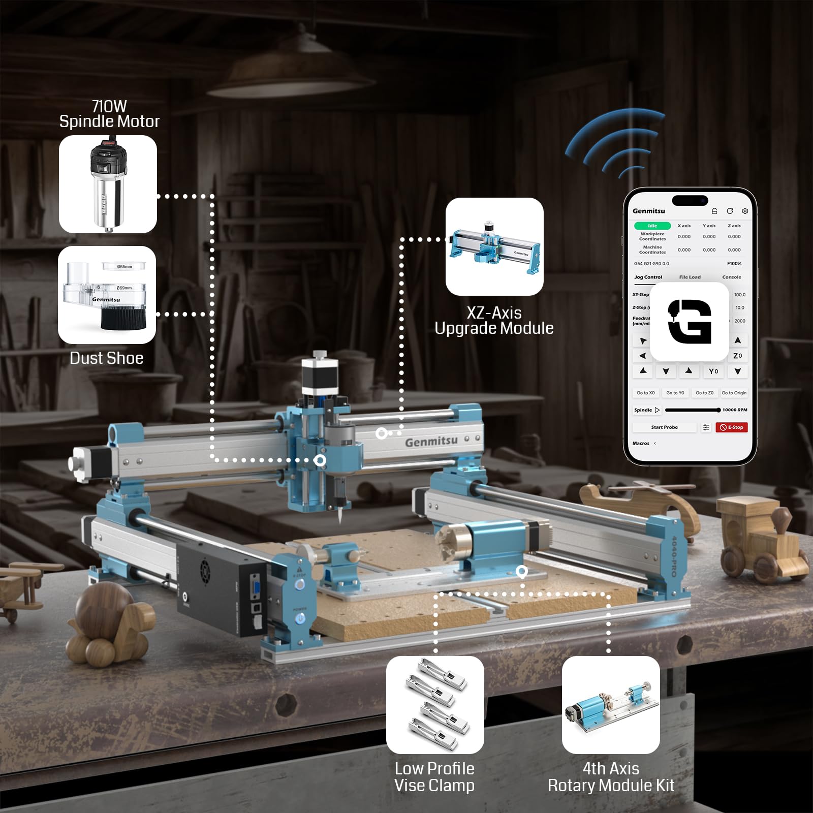 Various Upgrade Accessories: Supports a 4th axis rotary module kit (B0C581H2B3), allowing the 4040-PRO CNC to carve from various angles or perform full 3D rotary carving with the right software. Enables a Wi-Fi module (B0DK54JHS6) for mobile control. Also you can upgrade the XZ-axis(B0DHGN4ZYH), strengthen the screw material, and improve stability and speed.