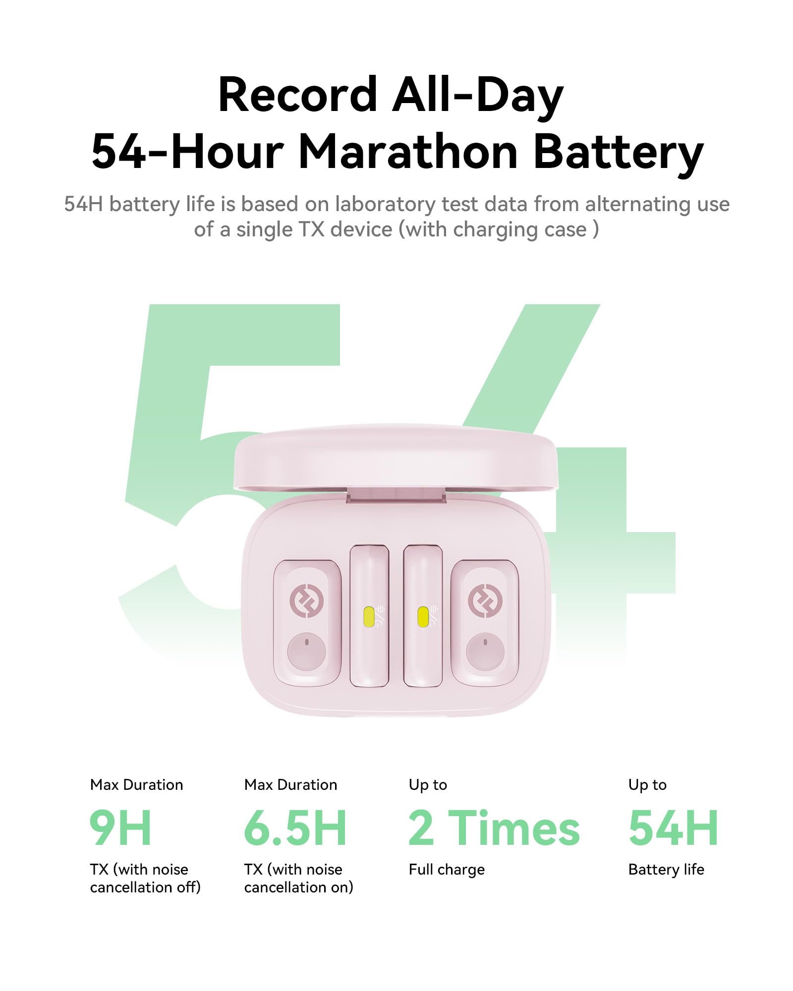 Up to 54 Hours Battery — Far Beyond Typical Mini Mics: With the charging case, enjoy up to 54 hours of total battery life—dramatically longer than standard 10–16 hour systems. Shoot all day, stream all night, without battery anxiety.