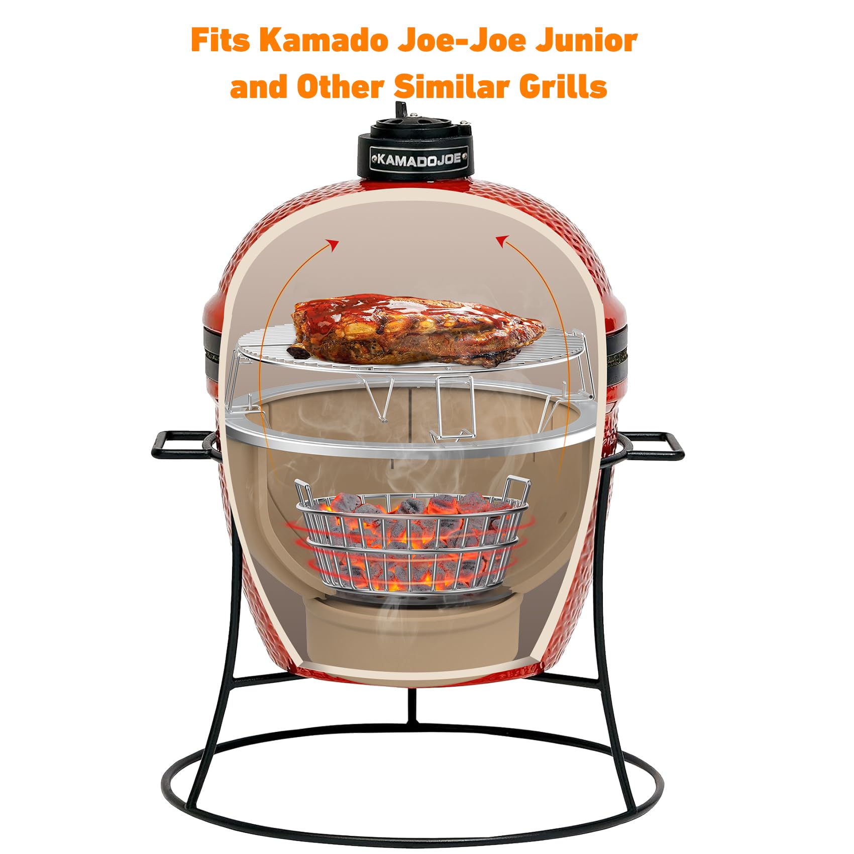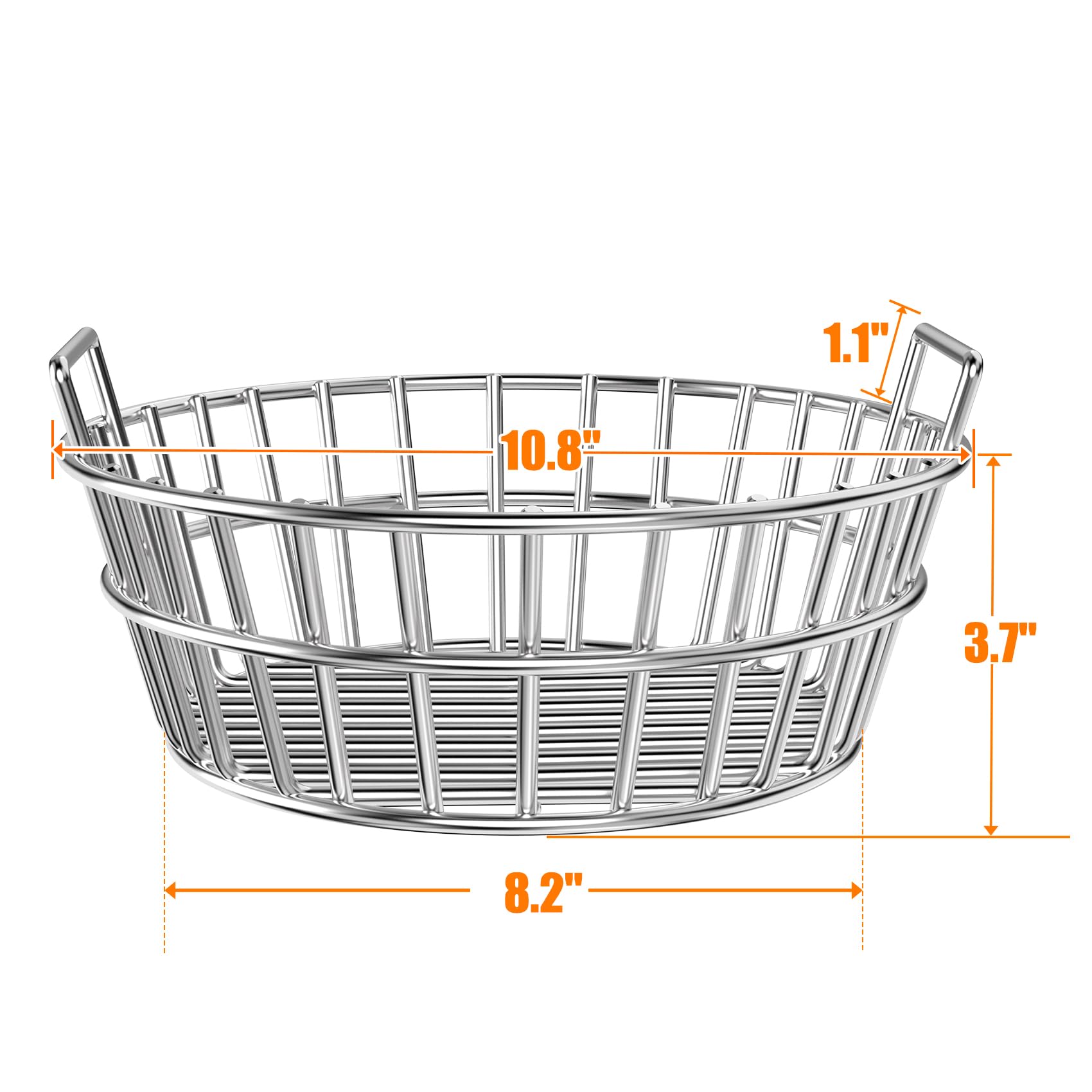 【Dimensions】Top diameter-10.8”, Bottom diameter-8.2”, Height-4.7”. Fits for Kamado Joe-Joe Junior. Measure your grill size to make sure this ash basket fits before ordering.