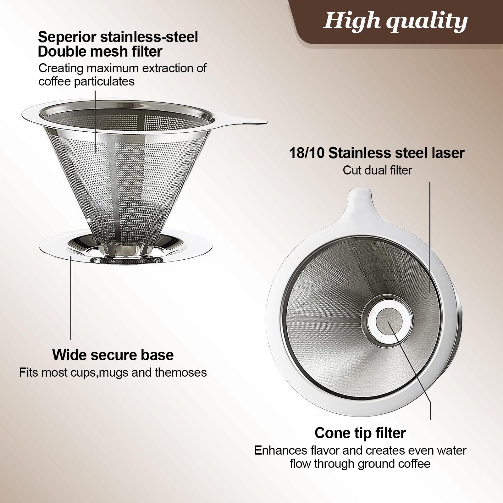 【Wide range of application】: stainless steel coffee filter is suitable for a variety of coffee machine and coffee maker, such as hand pot, French press pot, drip pot, can also be directly placed on the mug to meet the needs of different people.
