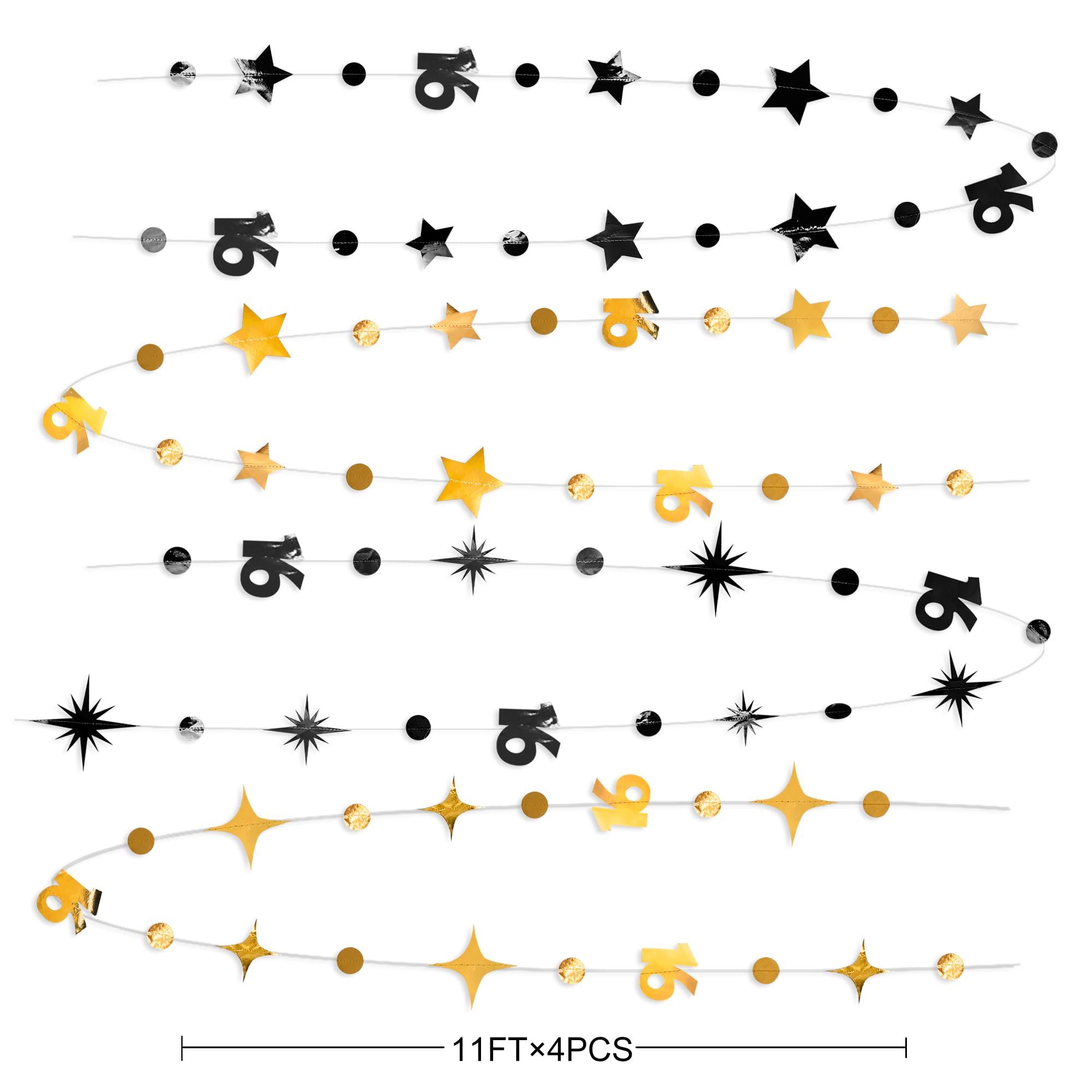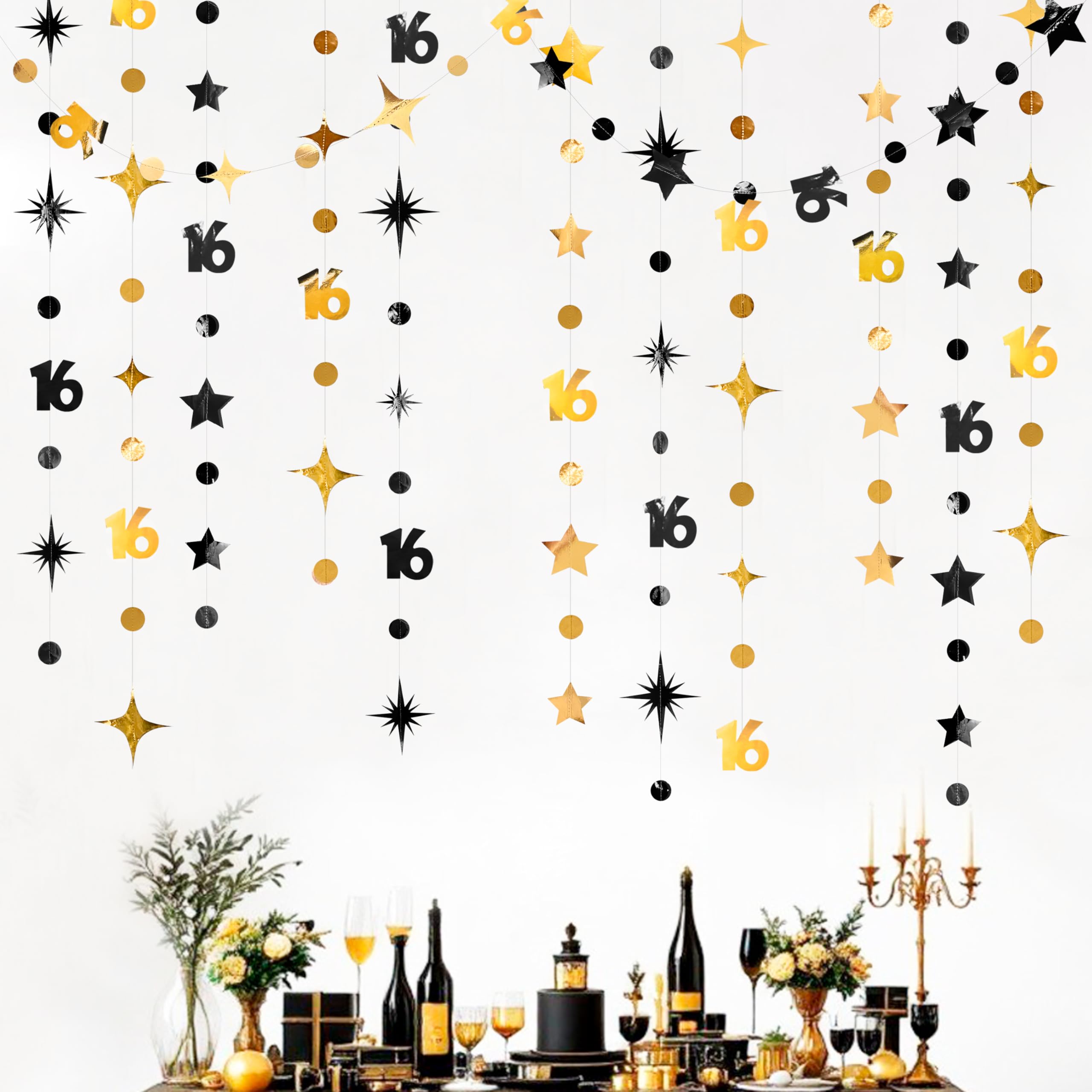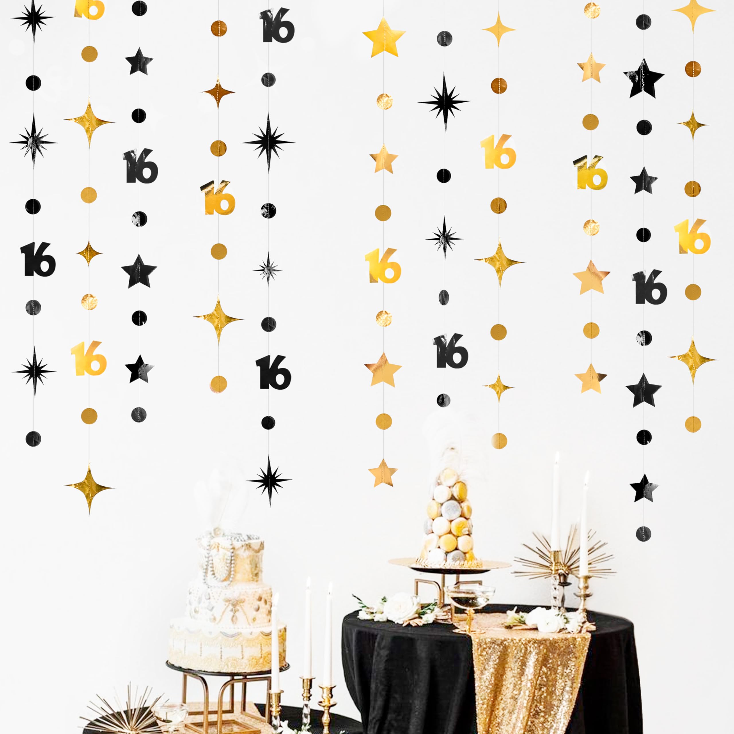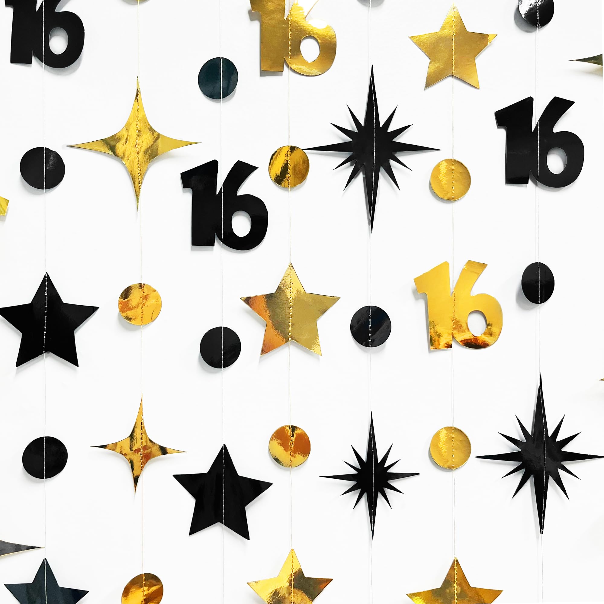 👍 Package includes - 4 strings of 11.5 feet/3.5 meters black gold number 16 sparkling twinkle star and circle dots garlands , totally is 46 feet/14 meters
