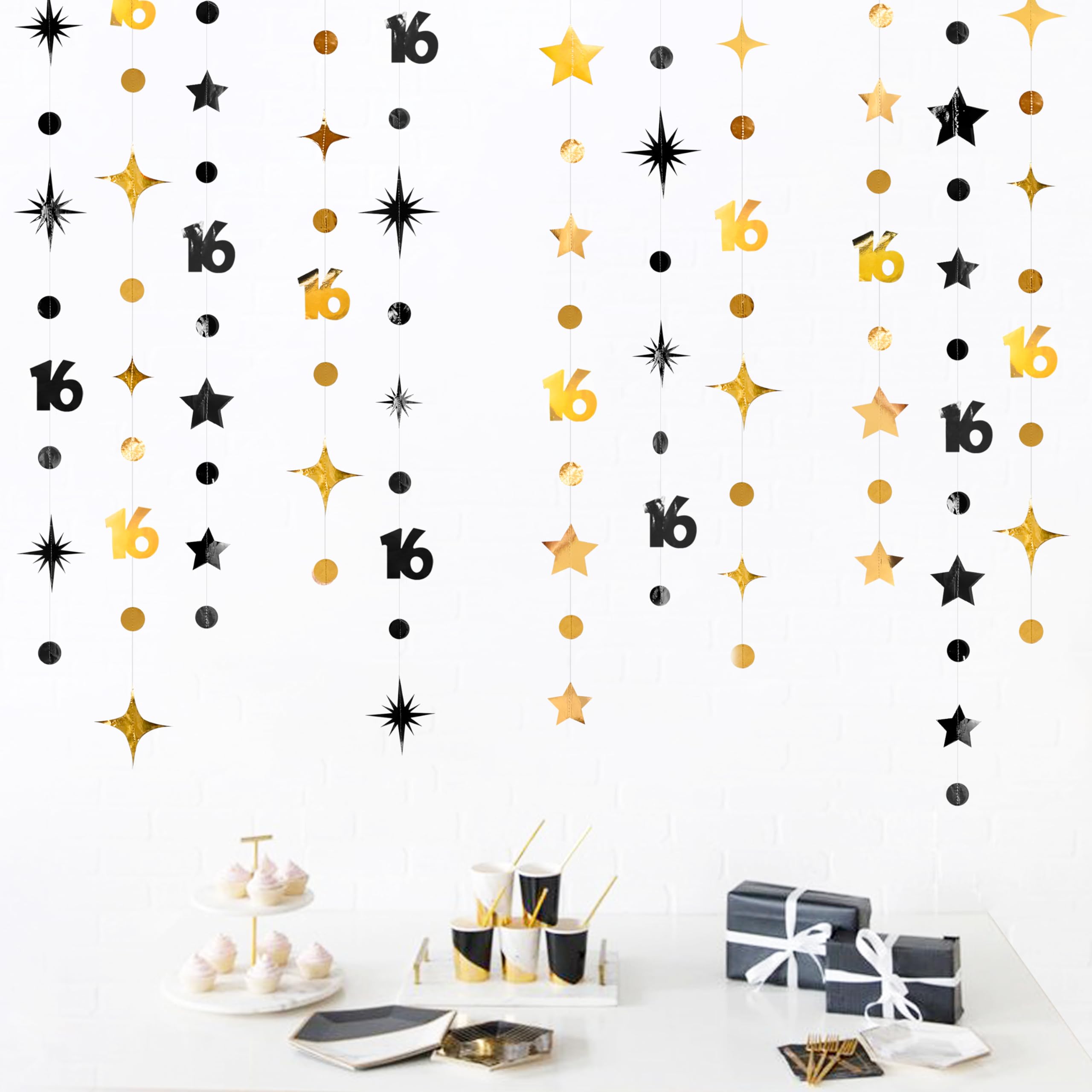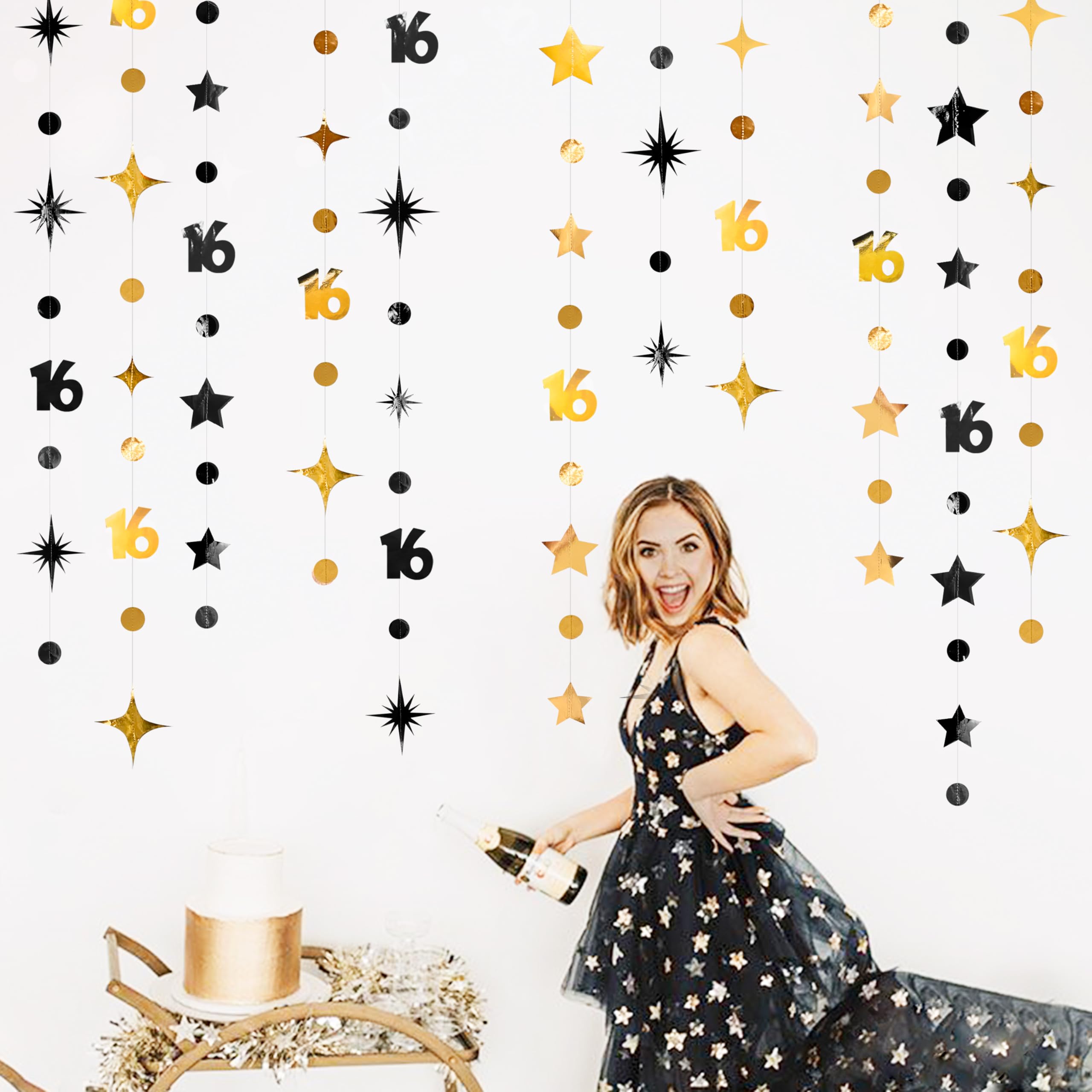 Our Black Gold Sweet 16 Happy Birthday Party Decorations Kit includes: ✓ 4 Pcs metallic star circle dot garland including number 16We have the perfect decoration party supplies set for the occasion: It’s perfect for: ► Sweet 16 decorations ► Sweet 16 birthday decorations ► Sweet 16 birthday decorations for girls ► 16th birthday decorations for boys ► Cheers to 16 years decorations ► Sweet 16 party decorations ► Bridal shower ► Engagement ► Anniversary ► Wedding Parties! Our Sweet 16 happy birthday party decorations is ready for its close up - we can't wait to see what memories you create! Have fun!