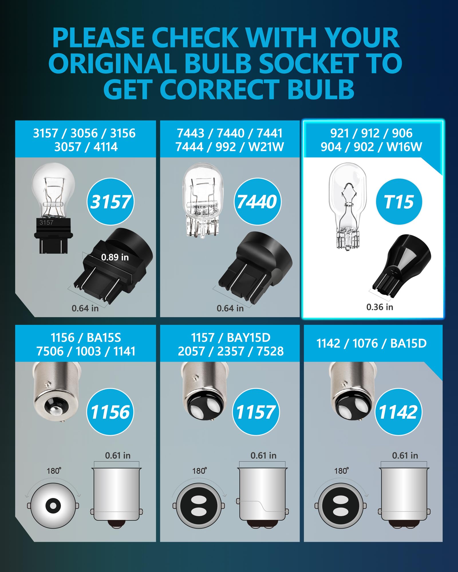*Wide Applicantion: The 912 LED bulb is normally used for back up light and suitable for T15, 912, 921, 906, 904, 902, W16W socket. Amazon filter system may not be 100% accurate, please double check owner manual or original bulb size to confirm before placing an order.