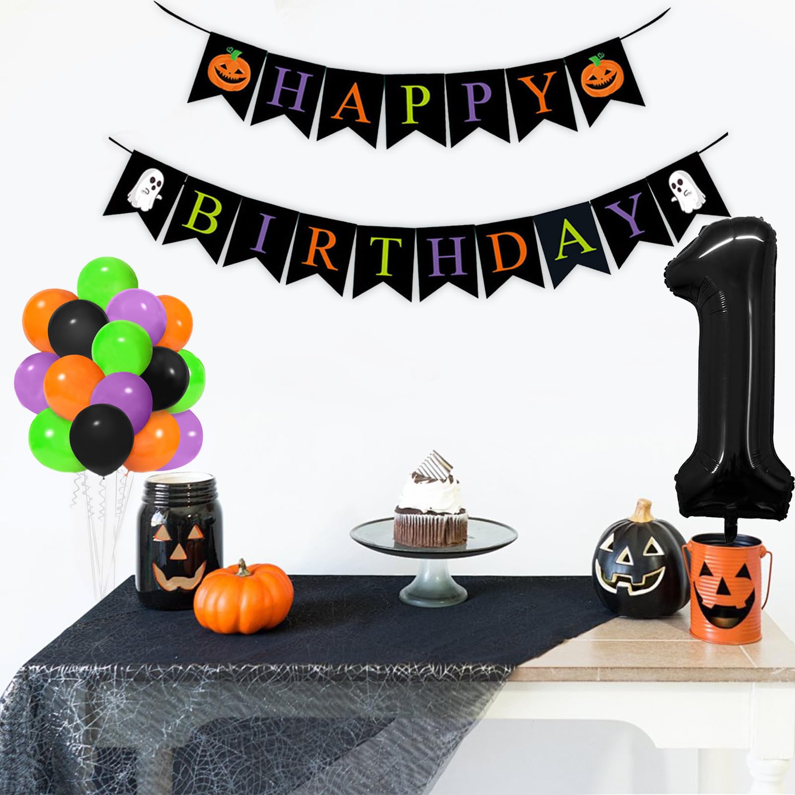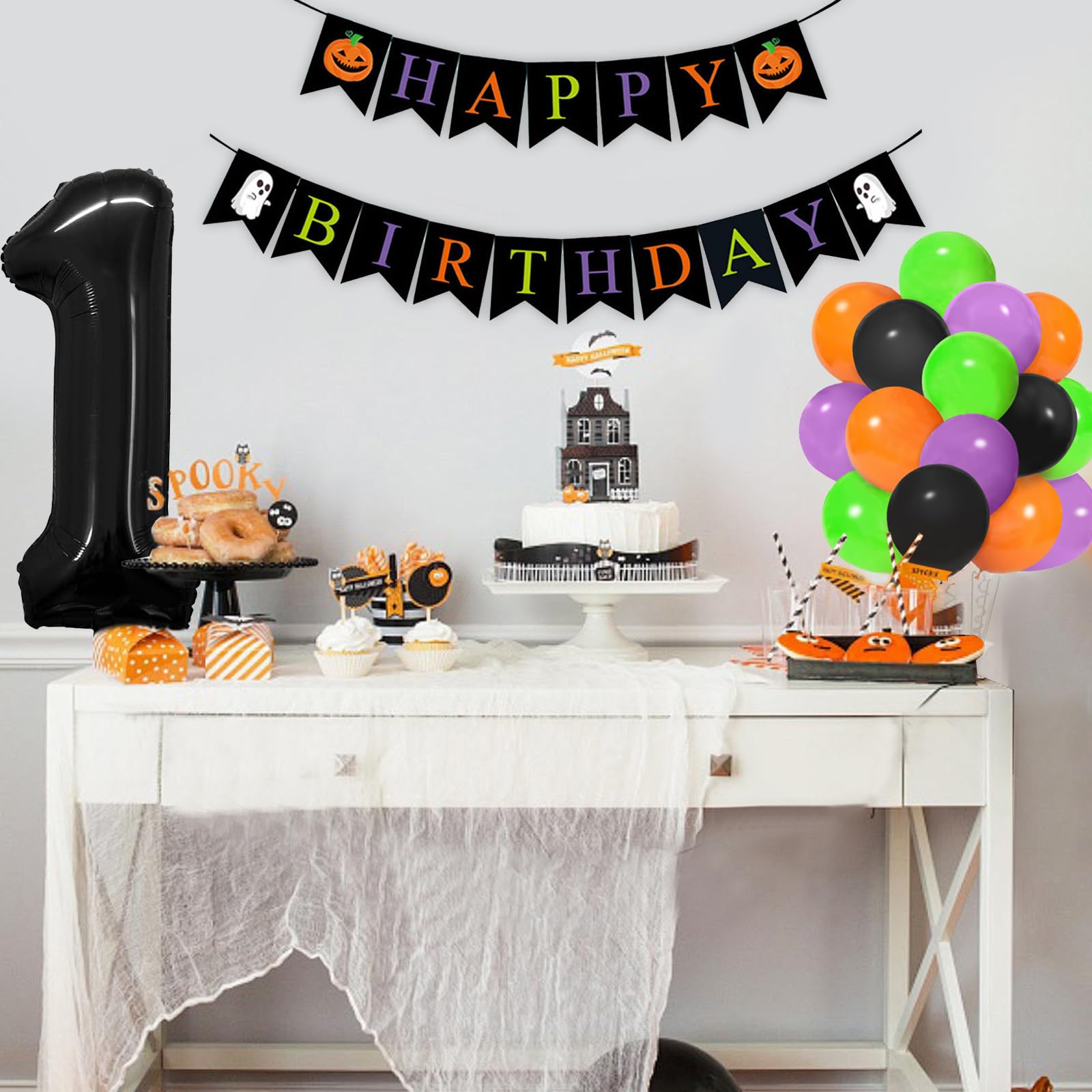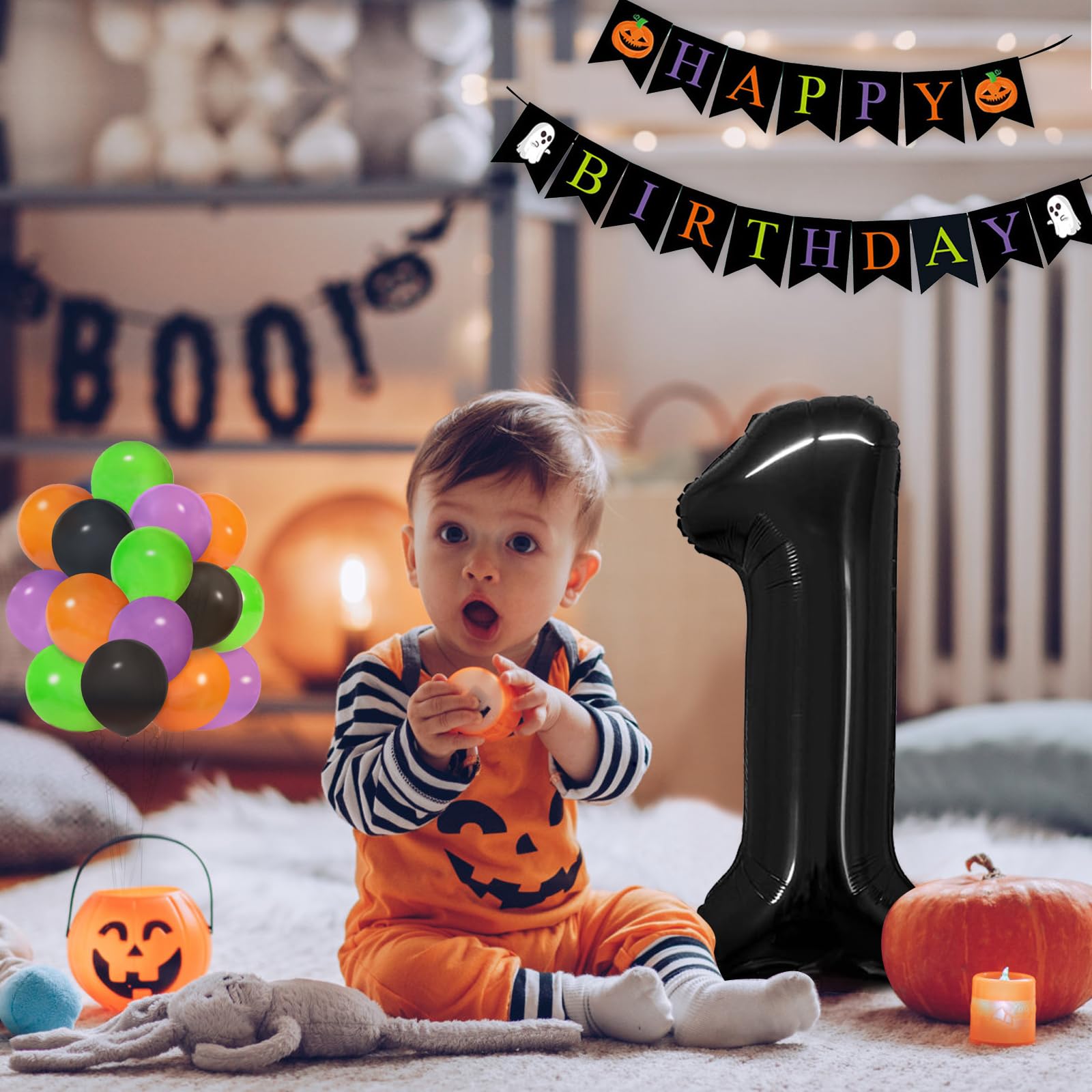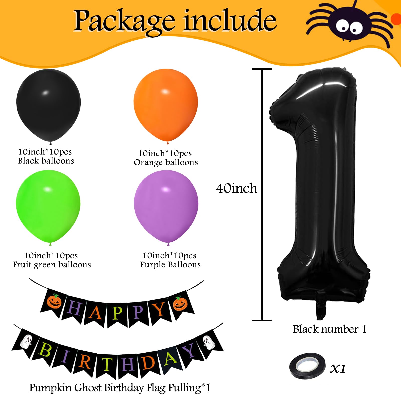 【VALUABLE PACK】43pcs Halloween One Balloon for First Birthday Kit include: 40inch black 1 balloon,halloween HAPPY BIRTHDAY banner, 40pcs 12inch balloons(black x 10pcs,orange x 10pcs,purple x 10pcs,lime green x 10pcs), 1pcs ribbon.