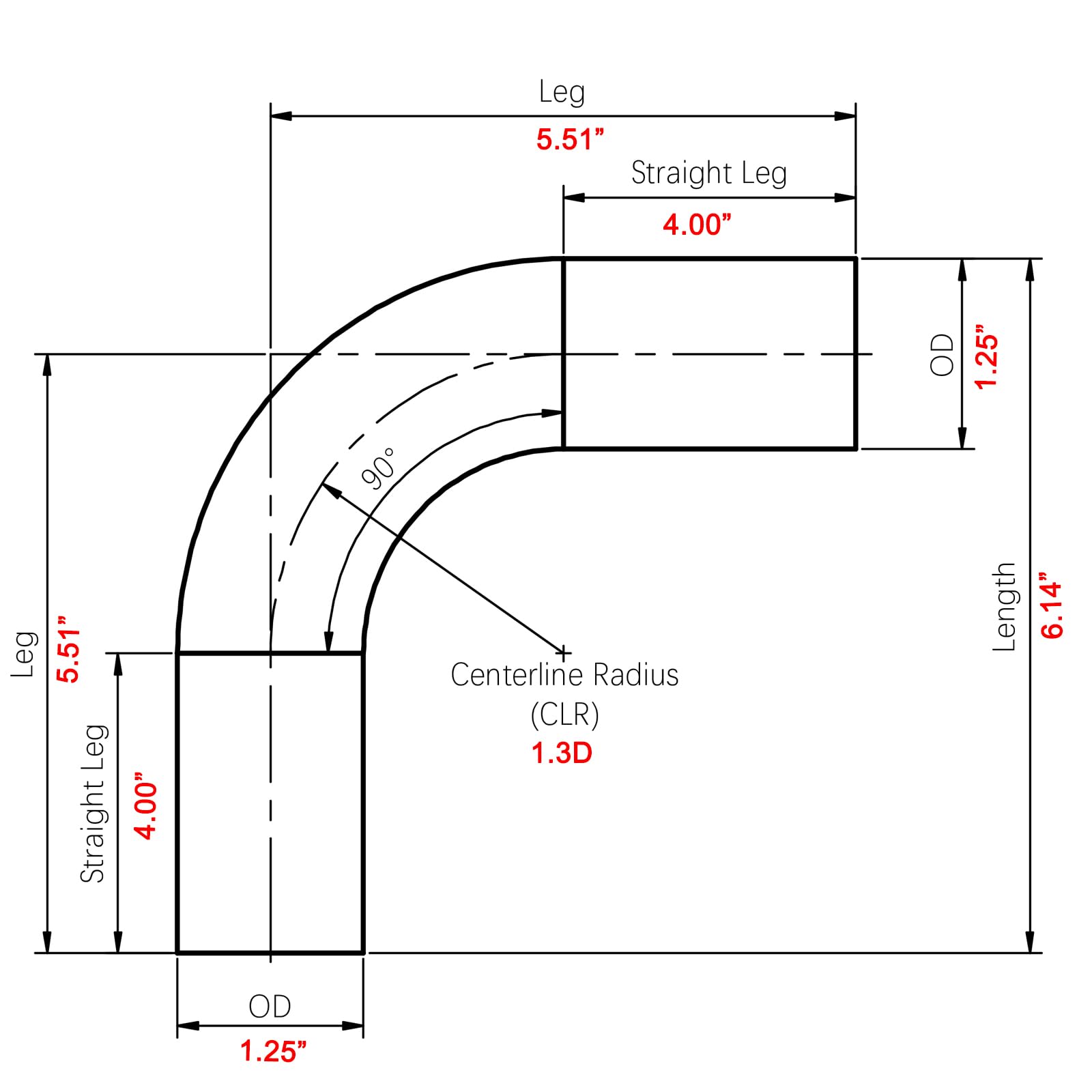 90 Degree bend, outside diameter: 1.25" (32mm), Leg Length: 4" (100mm), wall thickness: 0.059" (1.5mm)