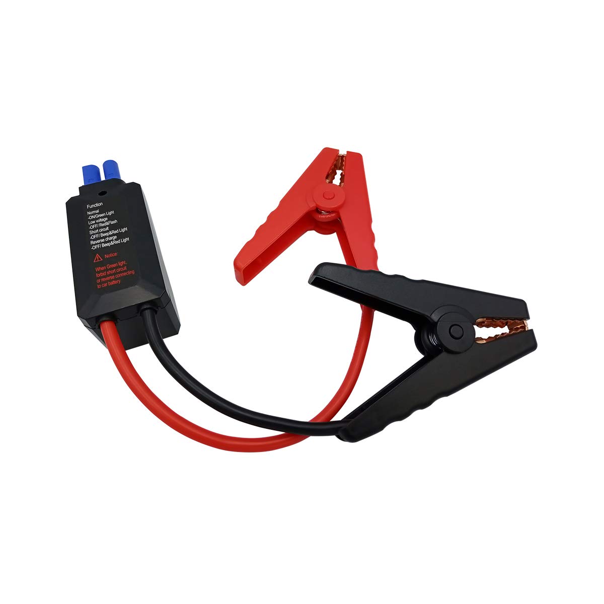 Warning: 1.This cable can only support EC-5 interface. Before buy, you must make sure your jump starter uses EC-5, or it will conflict and waste your time and money. 2.This smart cable can support Peak Current less than 800A . So before buy, you must make sure your jump starter peak current is less than 800A, or it will not support. Features: 1.Anti-short connection protection: Connect the red clip with the black clip, when the power is on, no damage, no sparkle. 2. Anti-reverse charging protection: After the car is started, anti-reverse charge current is less than 1A. 3. Full copper material to ensure the best quality and safety protection. 4. Wire: 10 AWG silicone 0.08/1050 O.D. 5.0 Red+Black; EC5 Male plastic shell blue, fits 5mm Banana plug. Instructions for use: 1. Connect the red and black battery clips to the positive and negative of car battery. 2. Insert plug of battery clips into start outlet of start power. 3. Turn auto key to start shift to start auto. 4. If the auto can not be started, turn the key after several seconds until it is started successfully. 5. Afterwards, pull storage battery plug from start power and remove clip from auto battery. Package Includes: 1 * Jump Starter Smart Cable