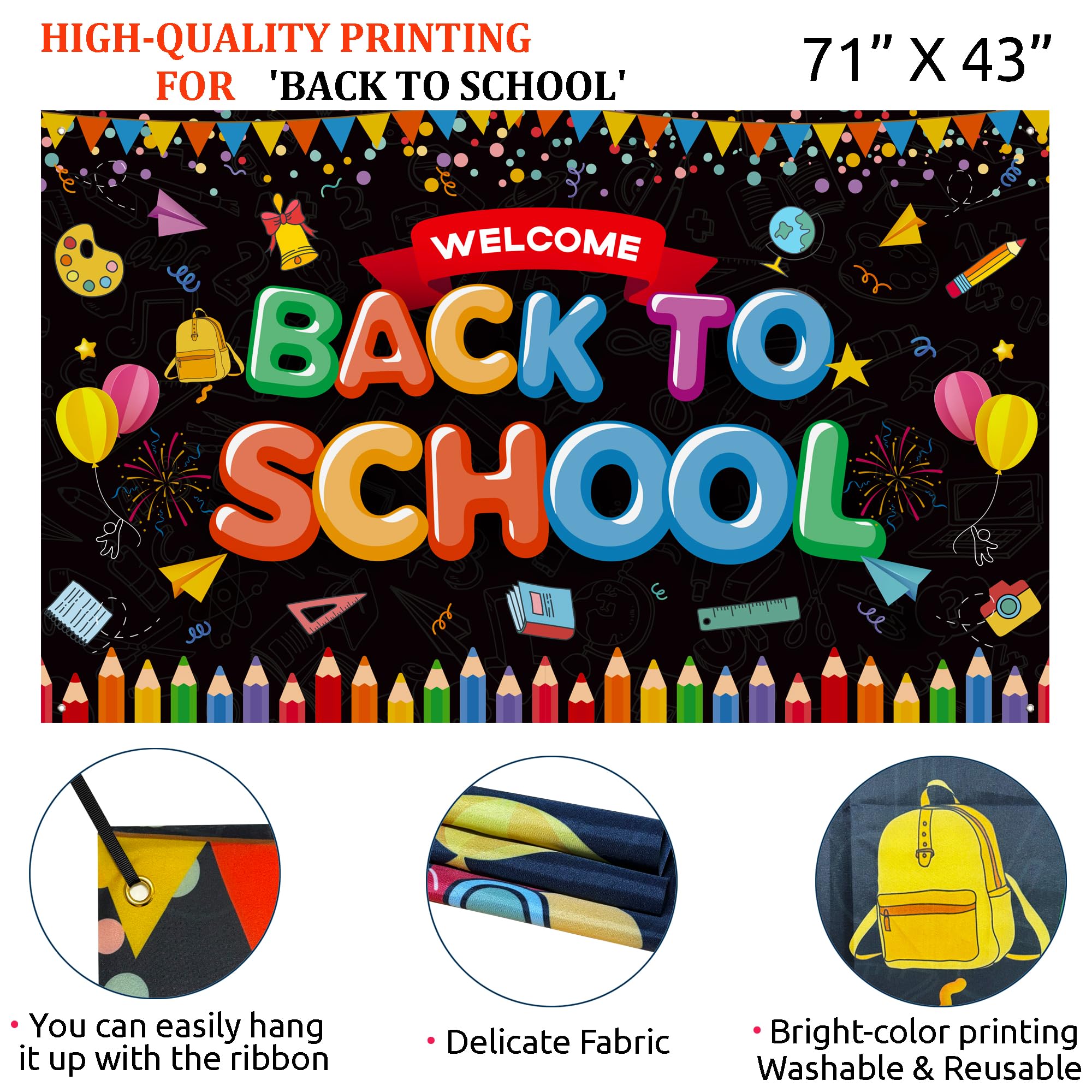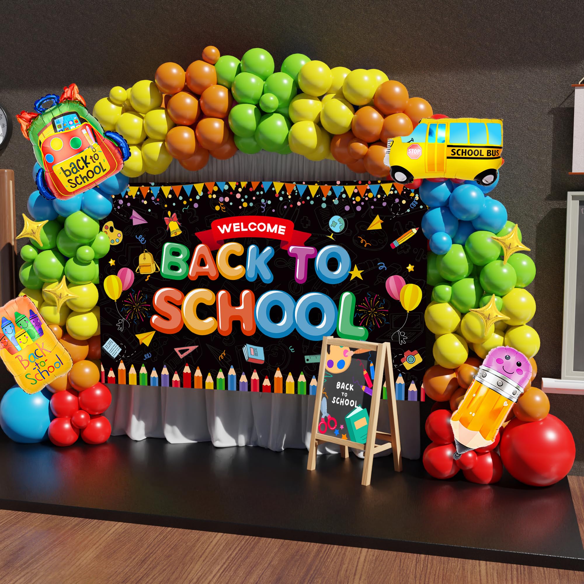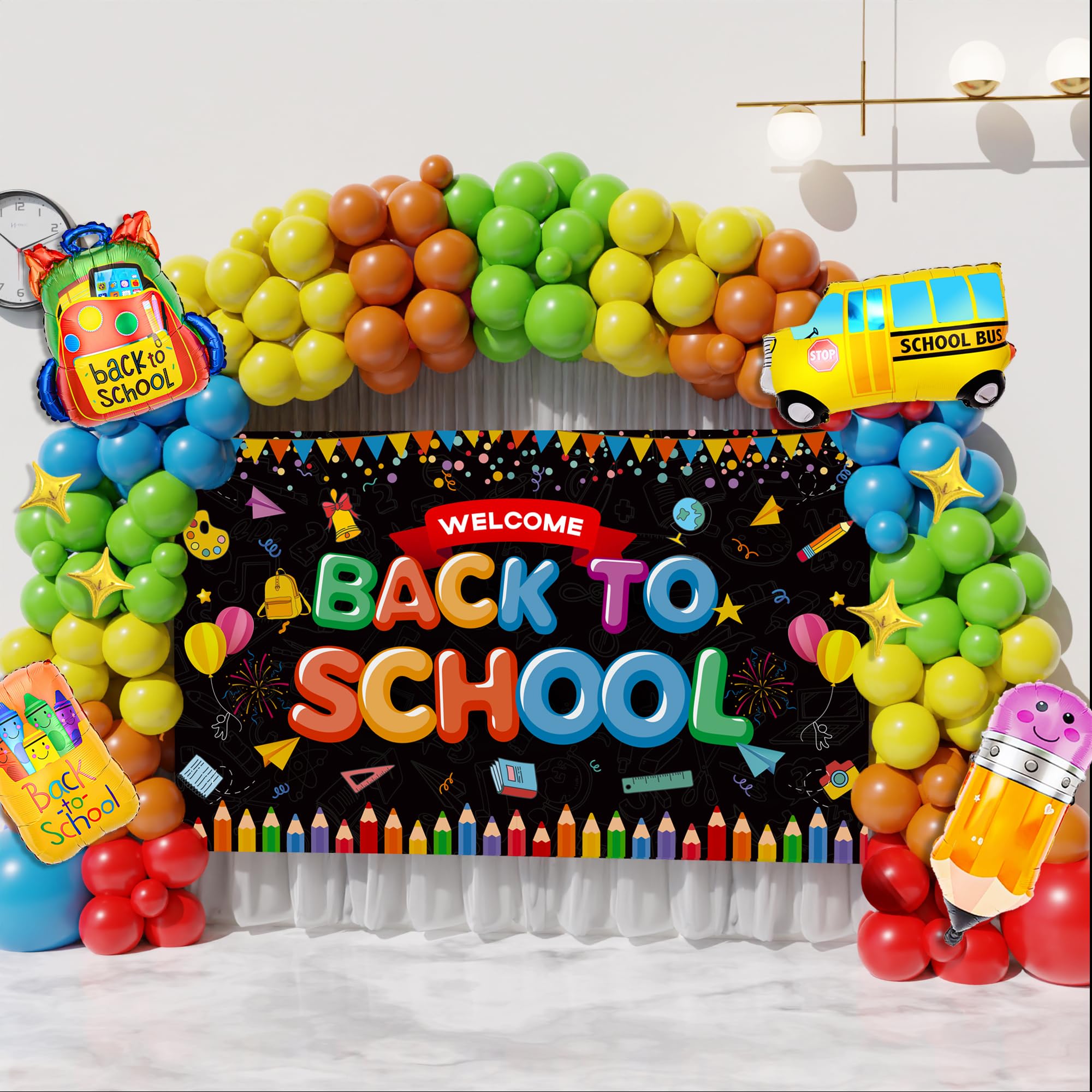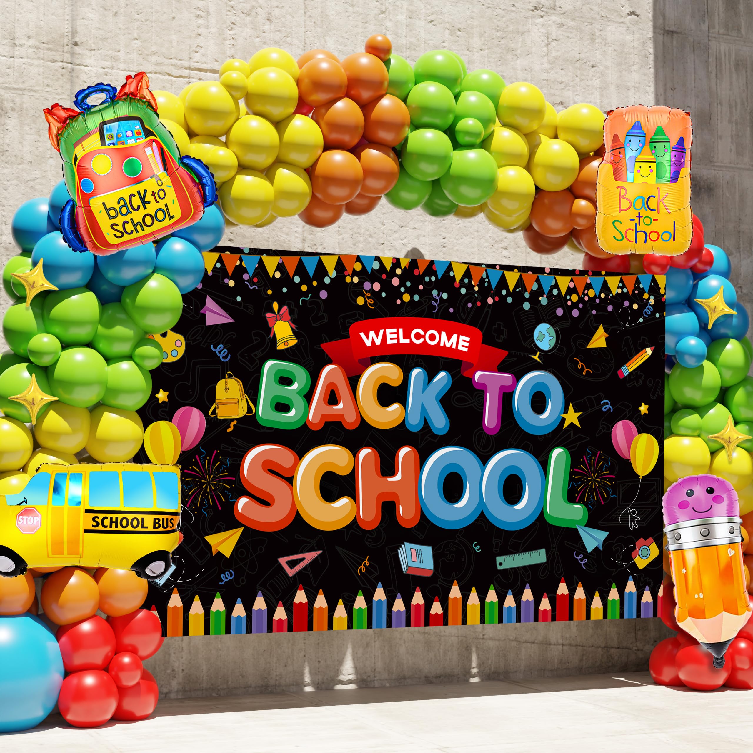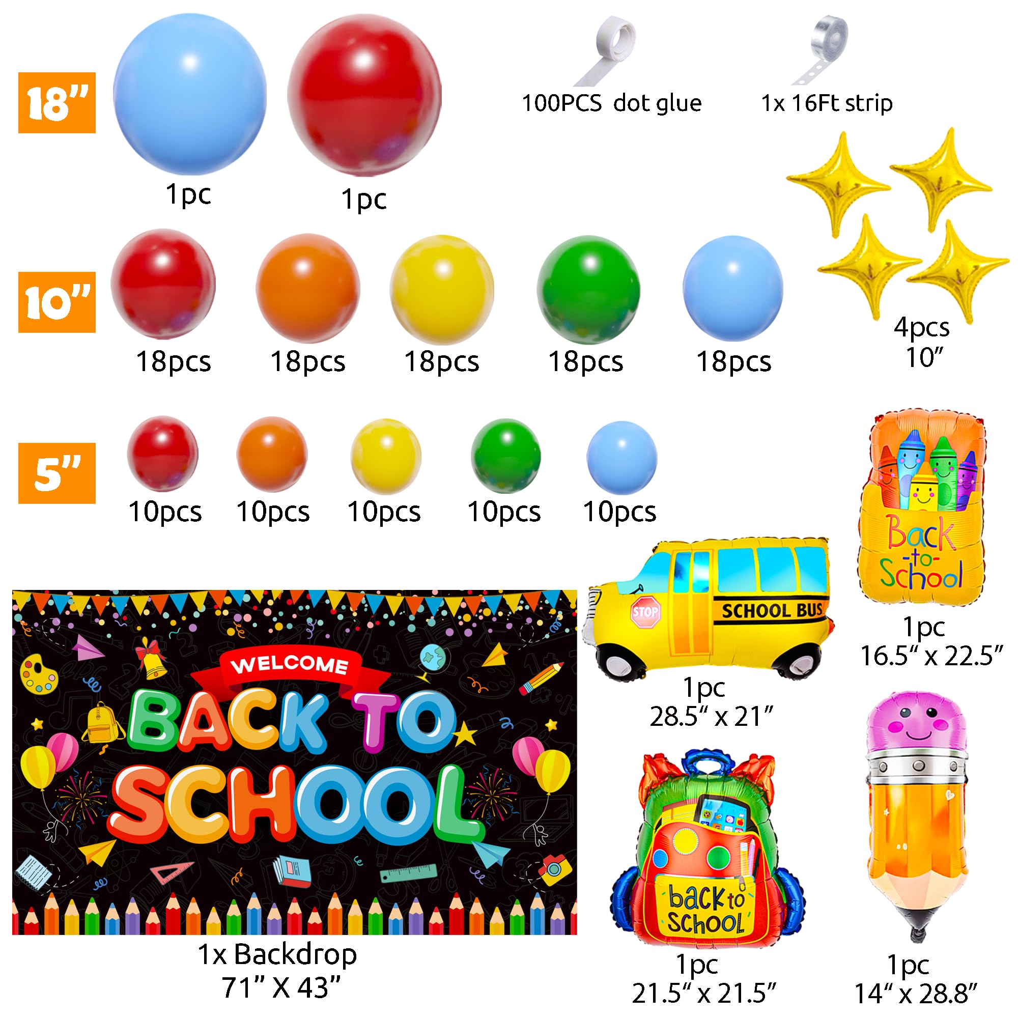 【PACKAGE INCLUDED】151PCS - Welcome back to school large backdrop(71x43.3in), Red balloon(18"×1,10"×18,5"×10),Blue Balloon(18"×1,10"×18,5"×10), Yellow/Fruit green/Orange balloon (10"×18,5"×10), foil balloon x 5, 16ft long balloon strip x 1, 100pcs balloon dot glue x 1, Instructions x1.