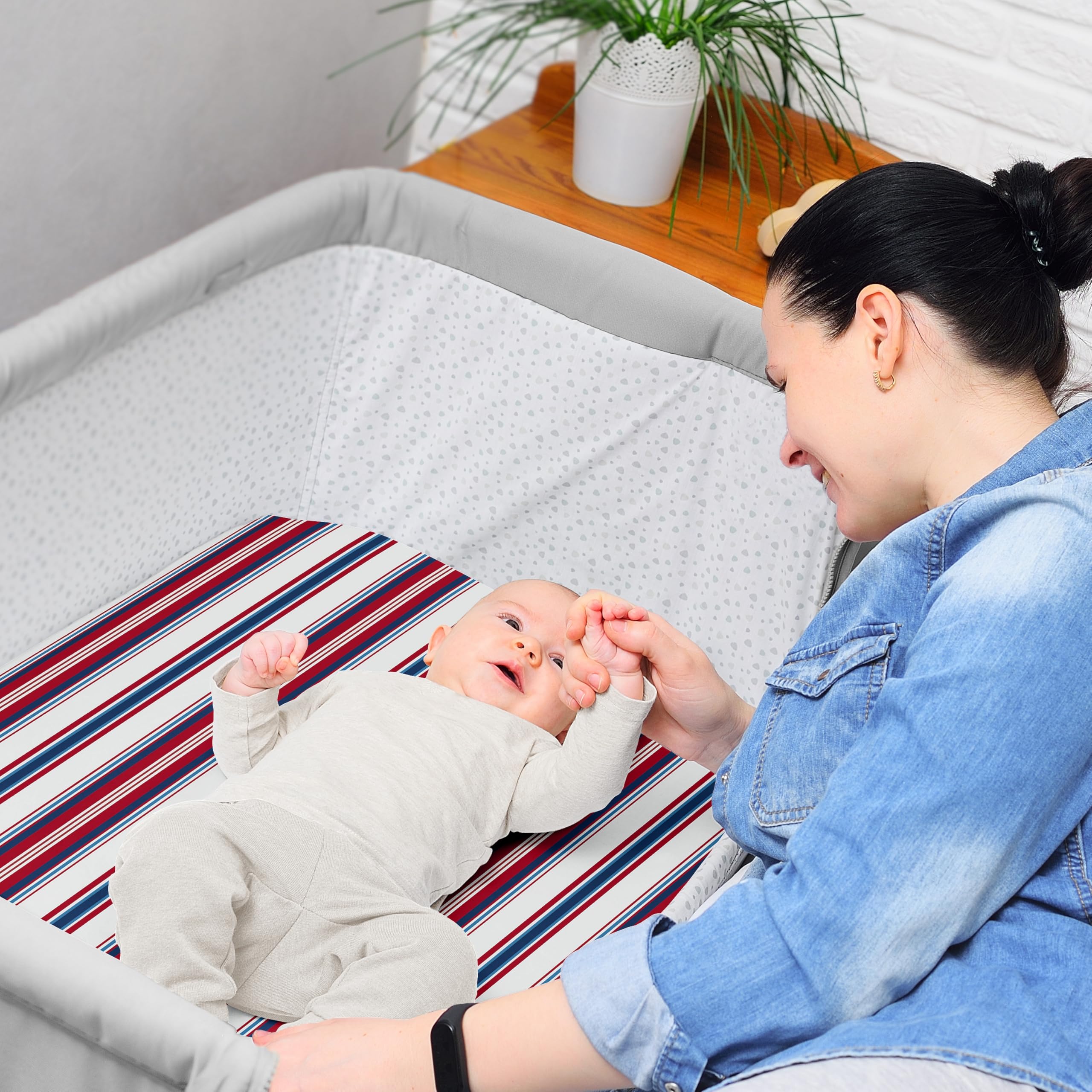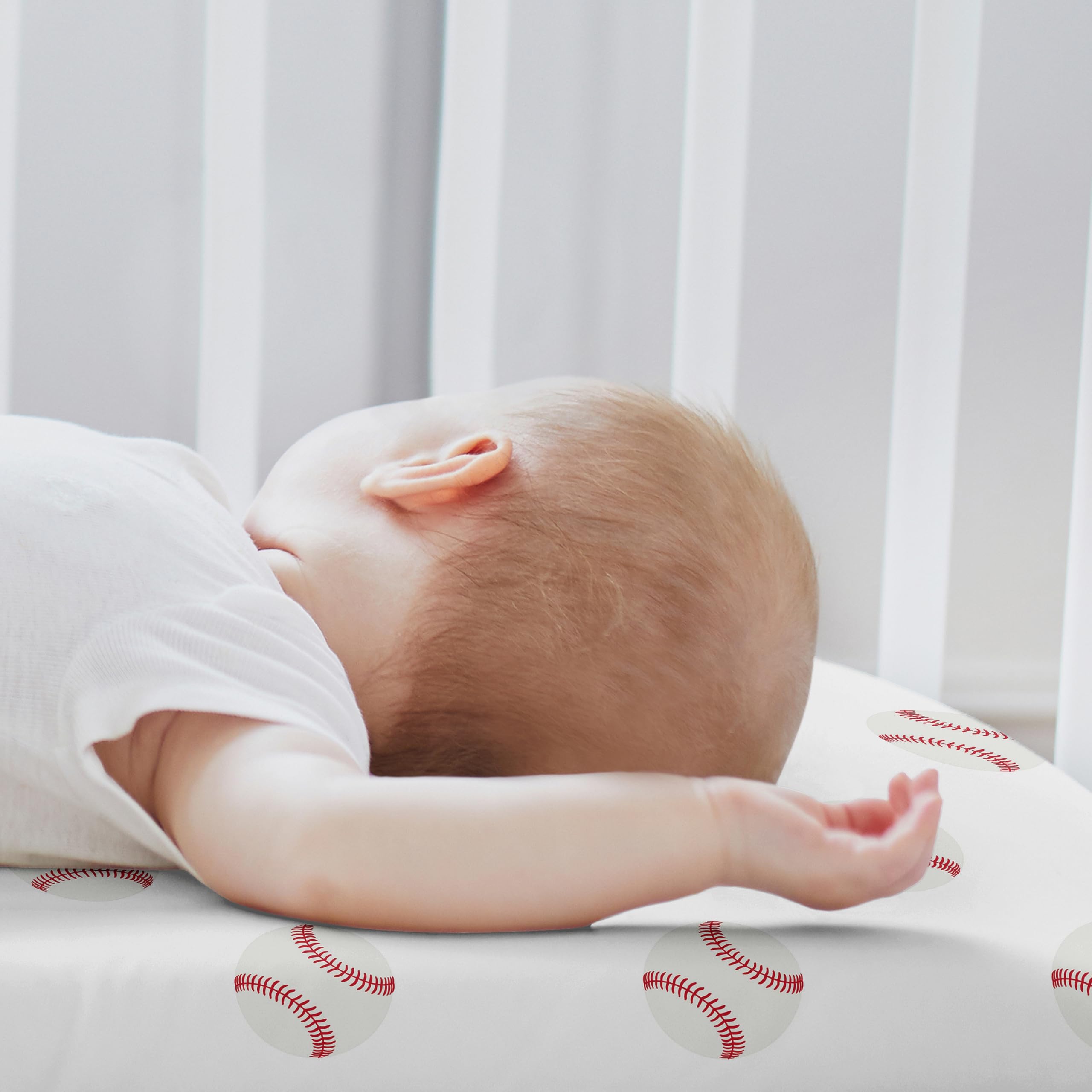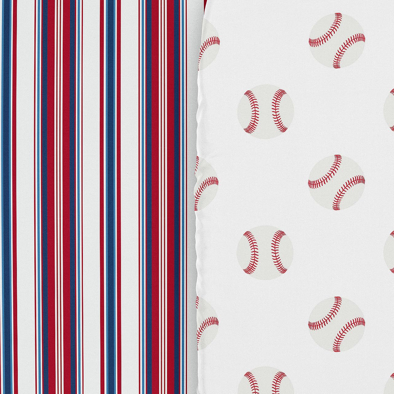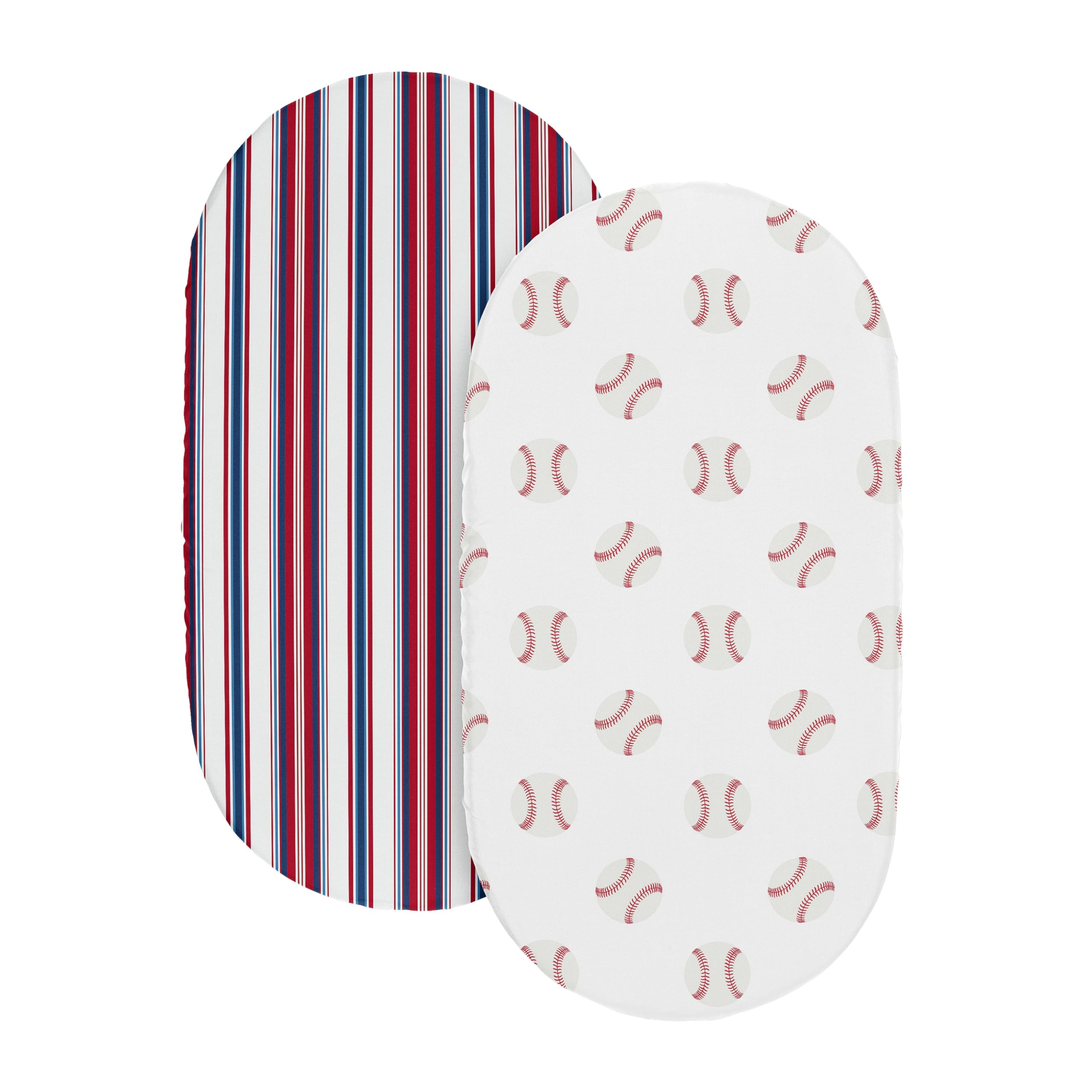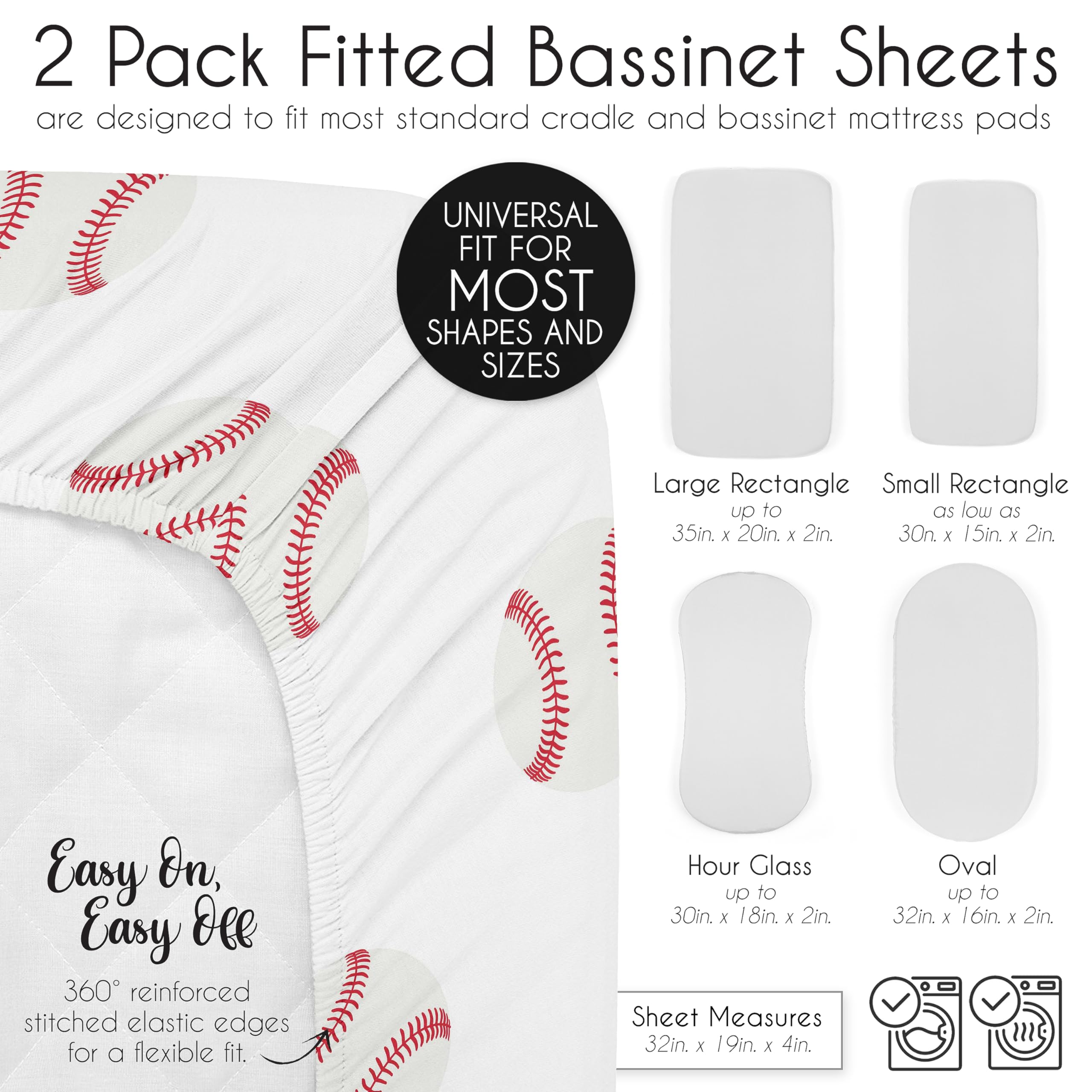 SNUG FIT: Includes: (2) Fitted Bassinet Sheets: 32in. x 19in. x 4in. each. Our sheets fit snugly, with premium elastic sewn around the bottom edge for a secure fit on most standard bassinets, pack n play bassinets, cradles, beside sleepers, & oval, hourglass & rectangular mattress shapes. These microfiber bassinet cover sheets feature a design of a white & red baseball sports balls print paired with a red, white & blue Americana striped classic stripes. WILL NOT FIT STANDARD SIZE OR MINI CRIBS.