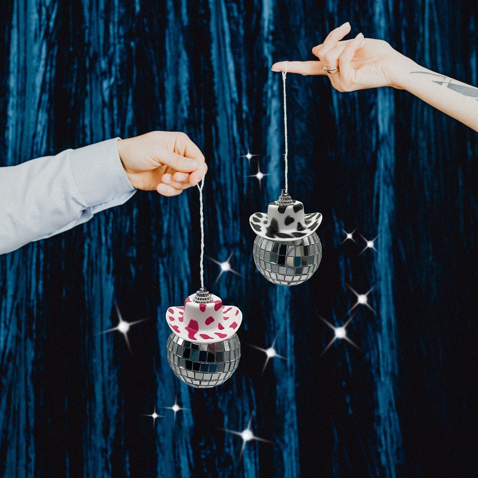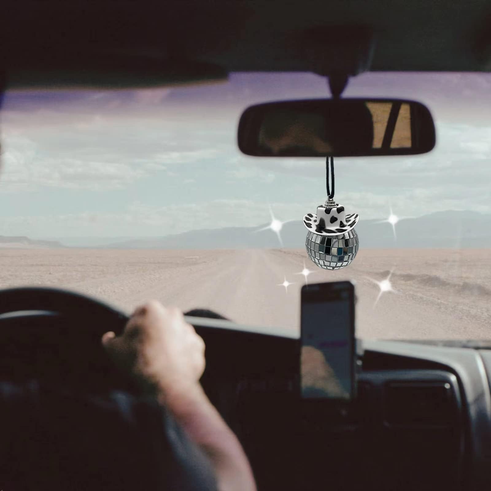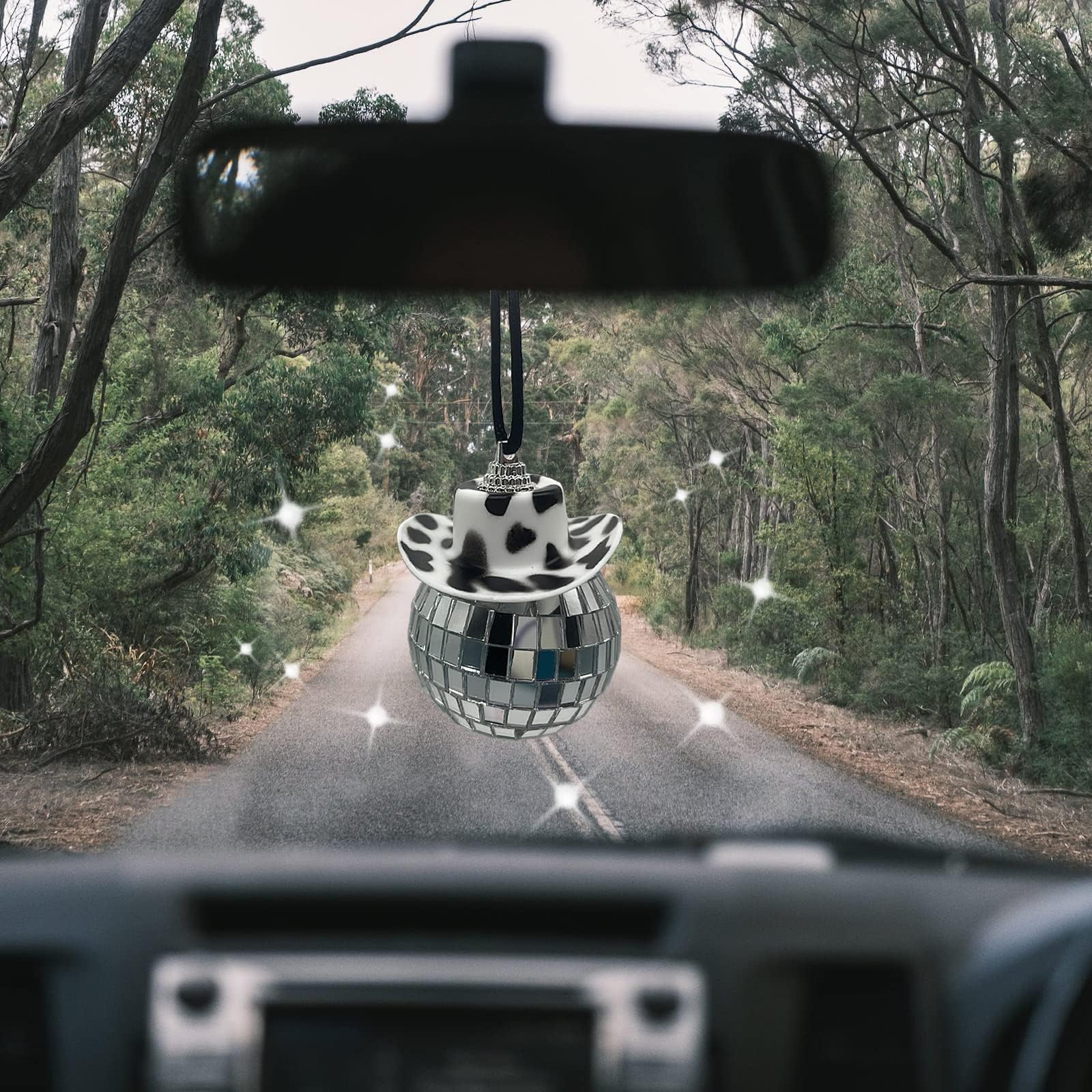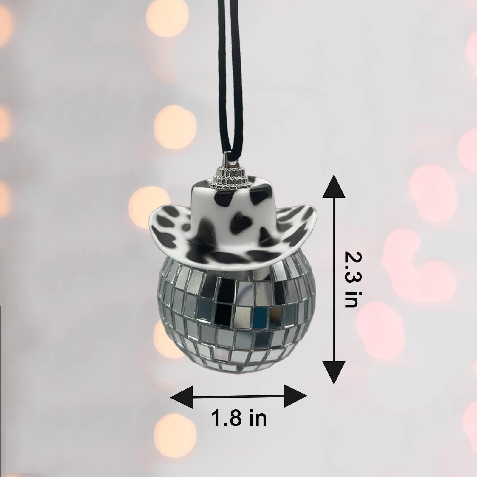 DISCO BALL FOR CAR: This disco ball car accessory βis consisting of black cow print hat and disco mirror ball. When the sun hits the bling glass ball car accessory,the interior of the car will sparkle,making your car rearview mirror more eye-catching and charming.
