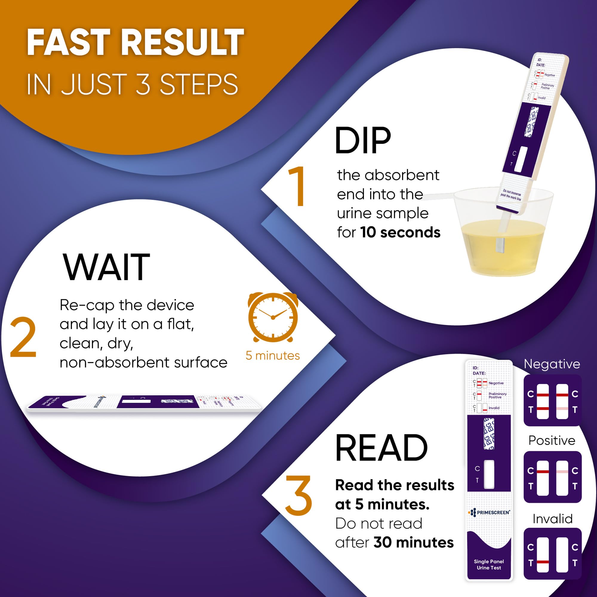 Easy to Use Design & Instant Results - Each test is sealed in individual pouch for easy carry and sanitary. It is easy to use and administer. Dip the test in urine for 10 seconds and read the result in 5 minutes. 2 lines appears if clean; 1 control line only appears if not clean.