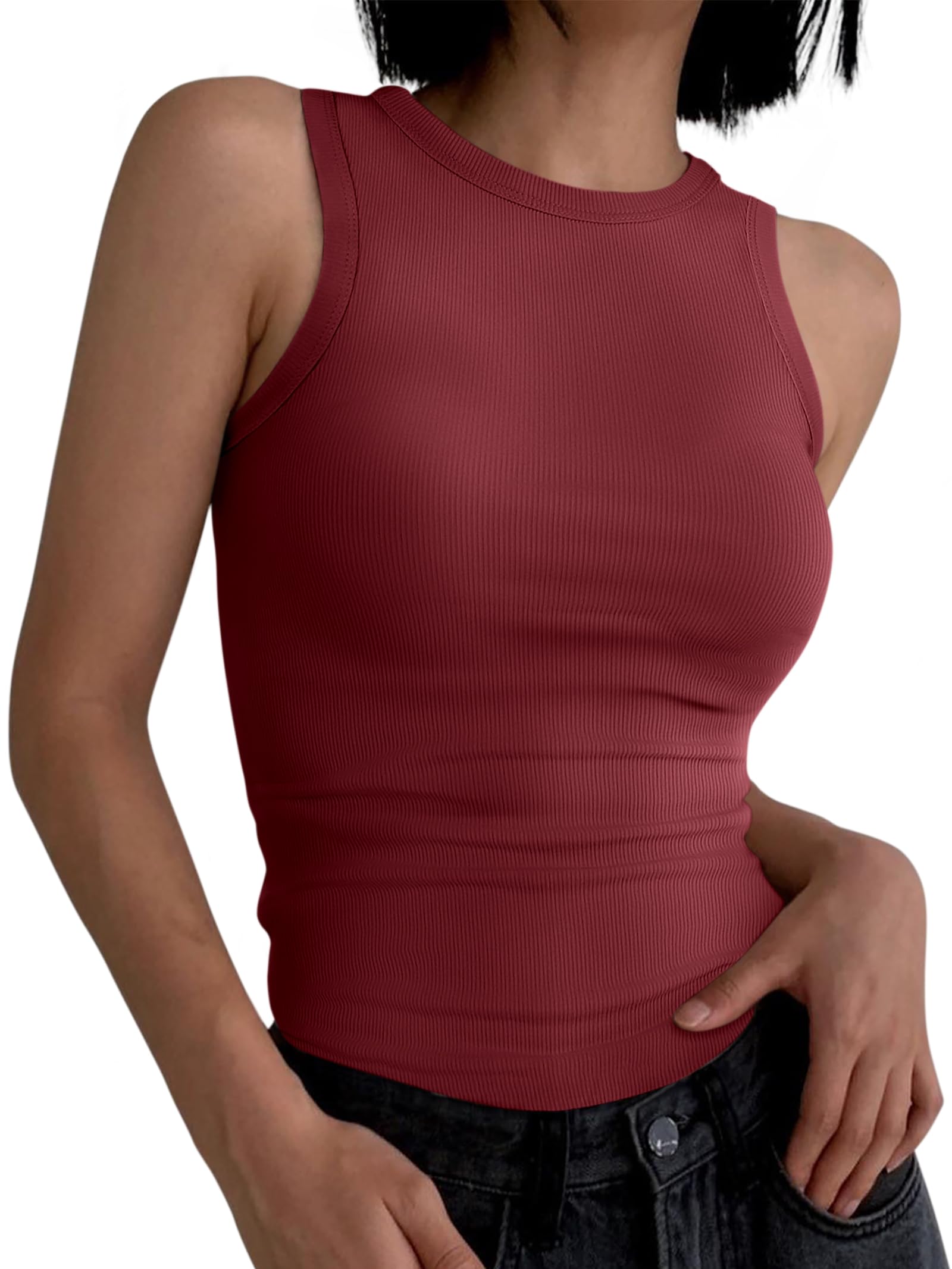 Design - Sleeveless Tops,Summer tops,Crewneck,Racerback,Solid Color,Ribbed Knit,Stretch,slim fit,Cute Full Length Style,Casual Basic Cami Tank Top