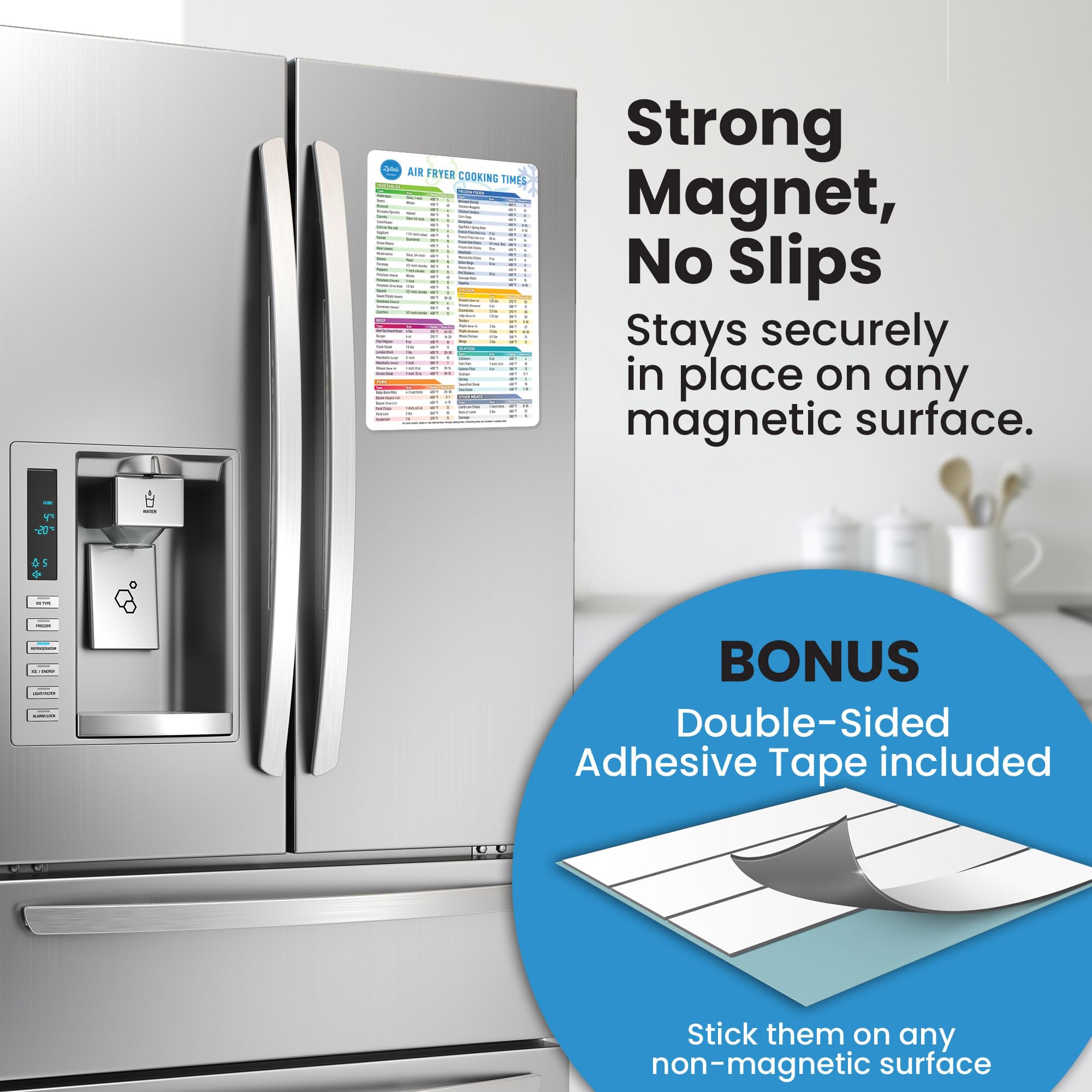 AIR FRYER MAGNET: This Air fryer times and temp guide magnet is carefully crafted with waterproof, oil-resistant, and tear-proof materials, our cheat sheet is built to last. The sturdy Big Magnet (10.5 x 6.5") and Small Magnet (5 x 5") securely attaches to your fridge or any magnetic surface.