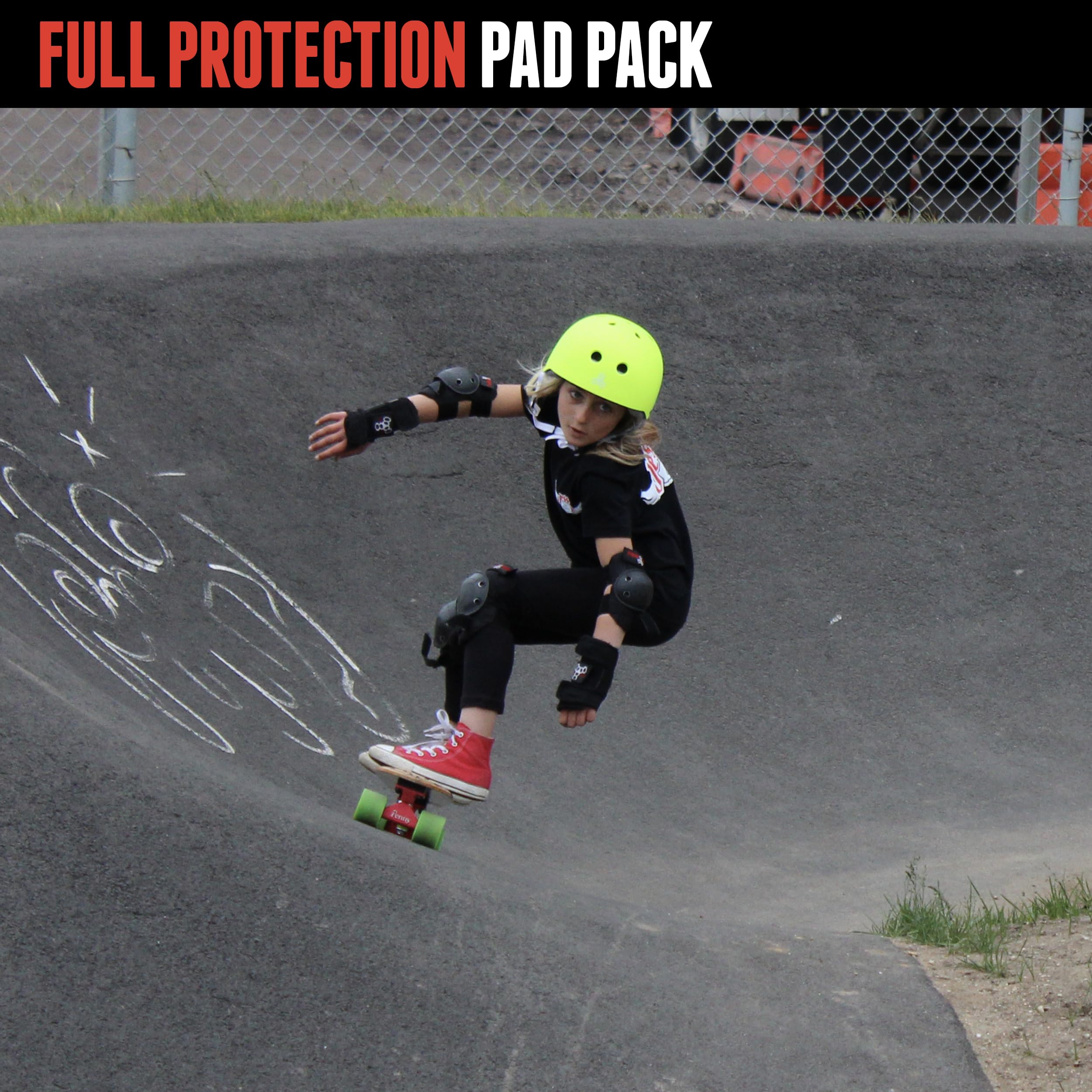 Product Description Triple 8's saver series pad set includes one pair each of knee saver knee pads, elbow saver elbow pads and wristlet wrist guards, packaged together in a convenient skateboard pad set. Knee pads and elbow pads are ergonomically designed, and are made of high grade durable fabrics, with EVA foam padding, and polycarbonate full coverage caps for superior protection that won't restrict movement. The wrist guards offer rigid support and protection with high-density, impact-resistant molded ABS splints and tough 4-way stretch nylon Mesh for a snug fit. Ideal for Skateboarding, biking, roller derby, and inline skating (roller blading), all pads feature an easy on-and-off sleeveless design and wide, reinforced elastic straps with adjustable hook and loop closures that ensure a secure fit. The Triple Eight saver series pad set is available in four sizes to fit kids, youth, and adults (size determined by Wrist guard; measure around the hand at knuckles): junior fits 7. 0-7. 5 inches, Small fits 7. 5-8. 0 inches, Medium fits 8. 0-9. 0 inches, and Large fits 9. 0-10. 0 inches. Manufacturer's 180-day limited. Manufacturer Contact Information 20W Vanderventer Ave. Suite 101 Port Washington, NY 11050 p 516-883-8889