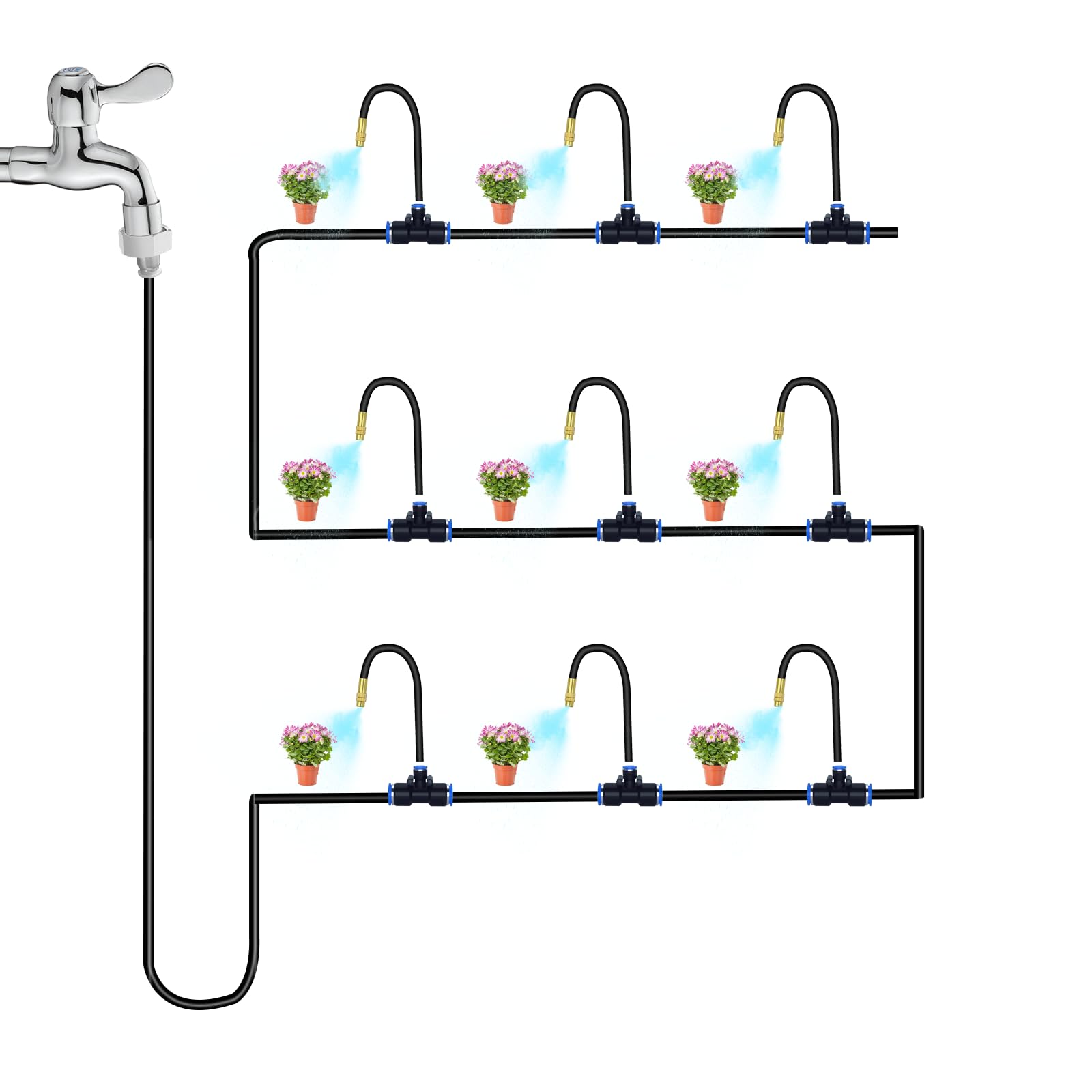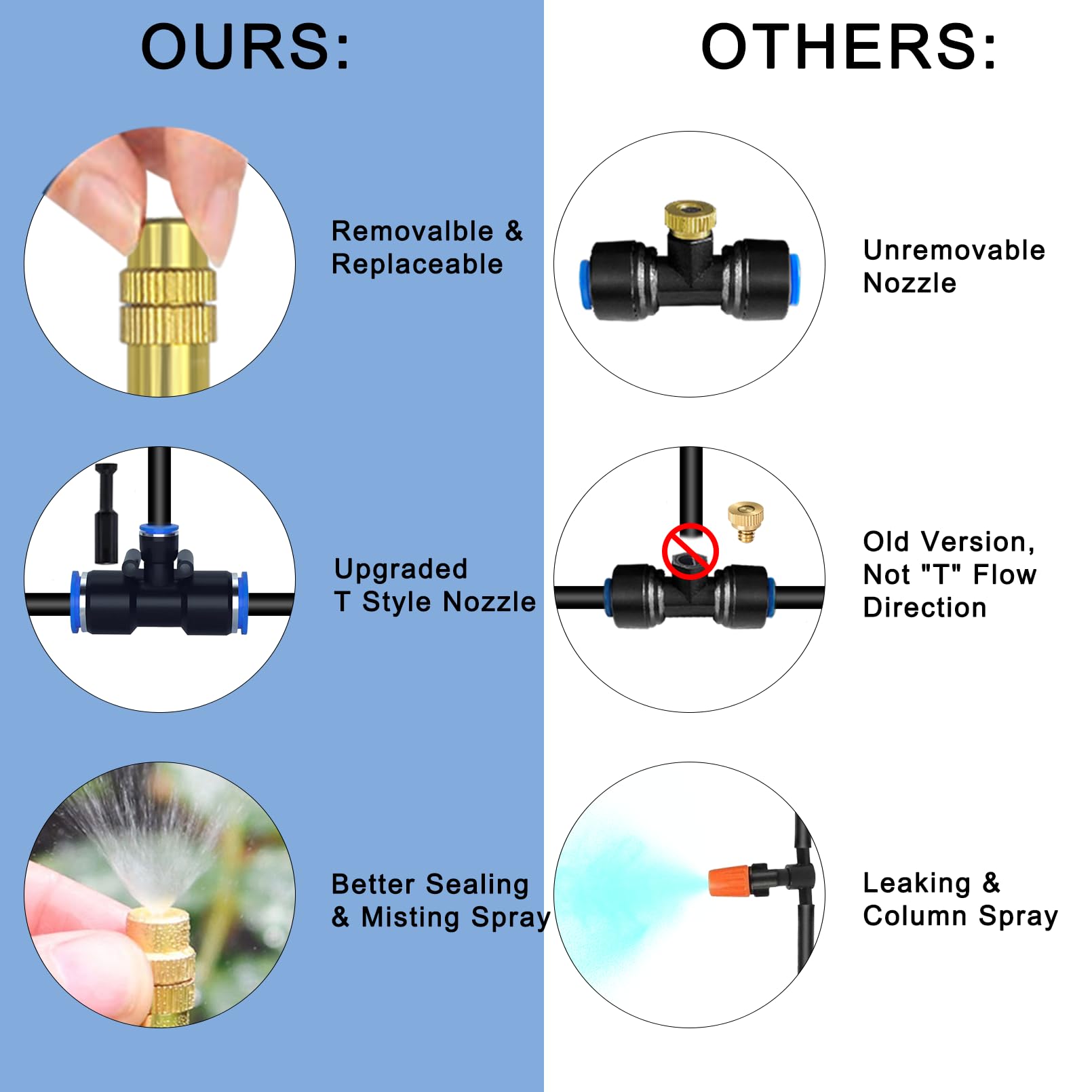 Upgraded Misting Irrigation System - Cokacot 49.21Ft 8mm drip irrigation tubing system kit with upgraded brass misting nozzles and T-joints has better performance in anti-leaking and connection, the irrigation kit also comes with upgraded 1/2 inch and 3/4 inch faucet adapter with filter net for blocking impurities.