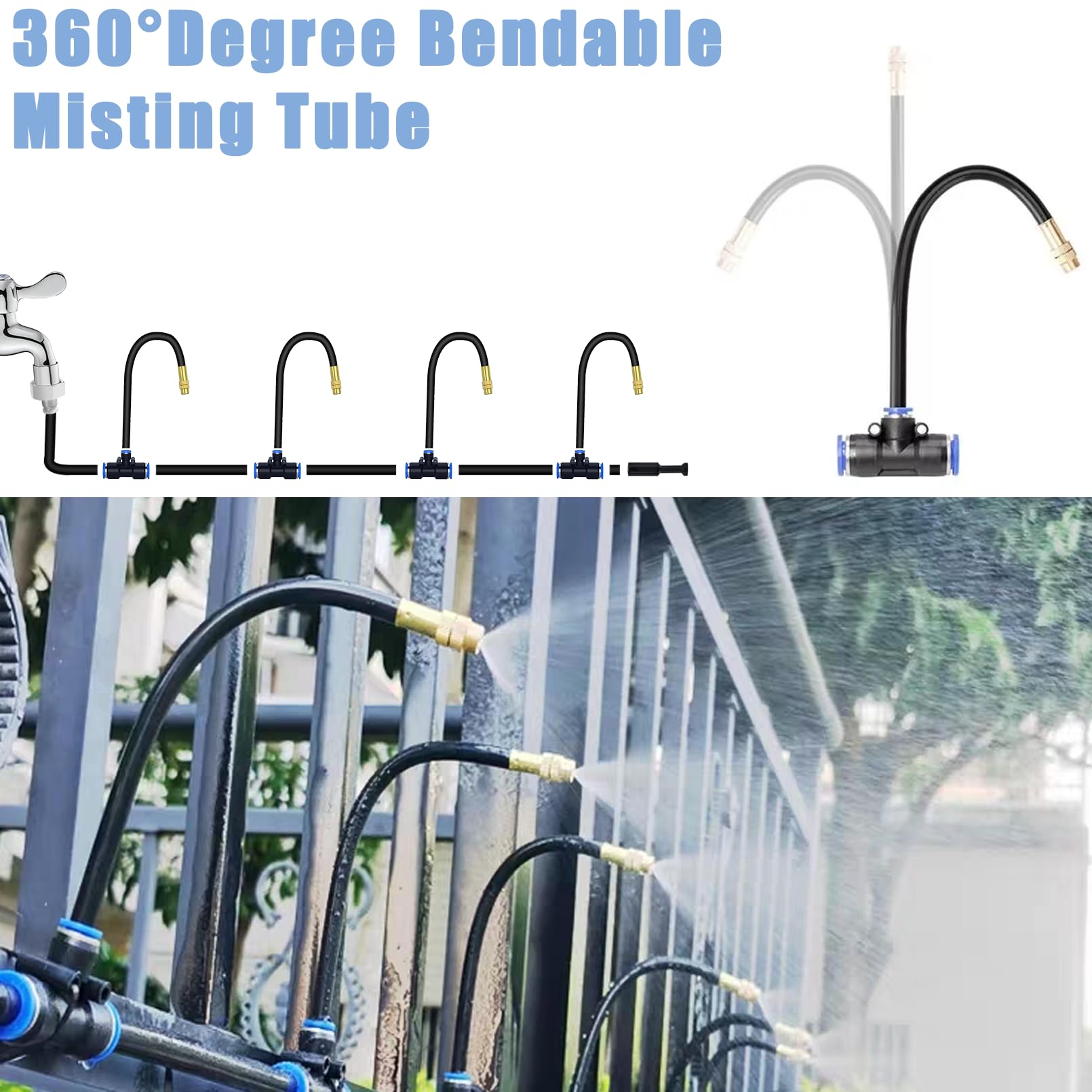 Bendable in 360° and In Any Direction - This bendable misting irrigation system with Irrigation Tubing allows you to bend its misting nozzles to any direction in 360 degree. Cokacot prepared 10 fix stems help you to fix it on ground or above ground, you may also just hang this misting system kit to fence and no need fixed stems.