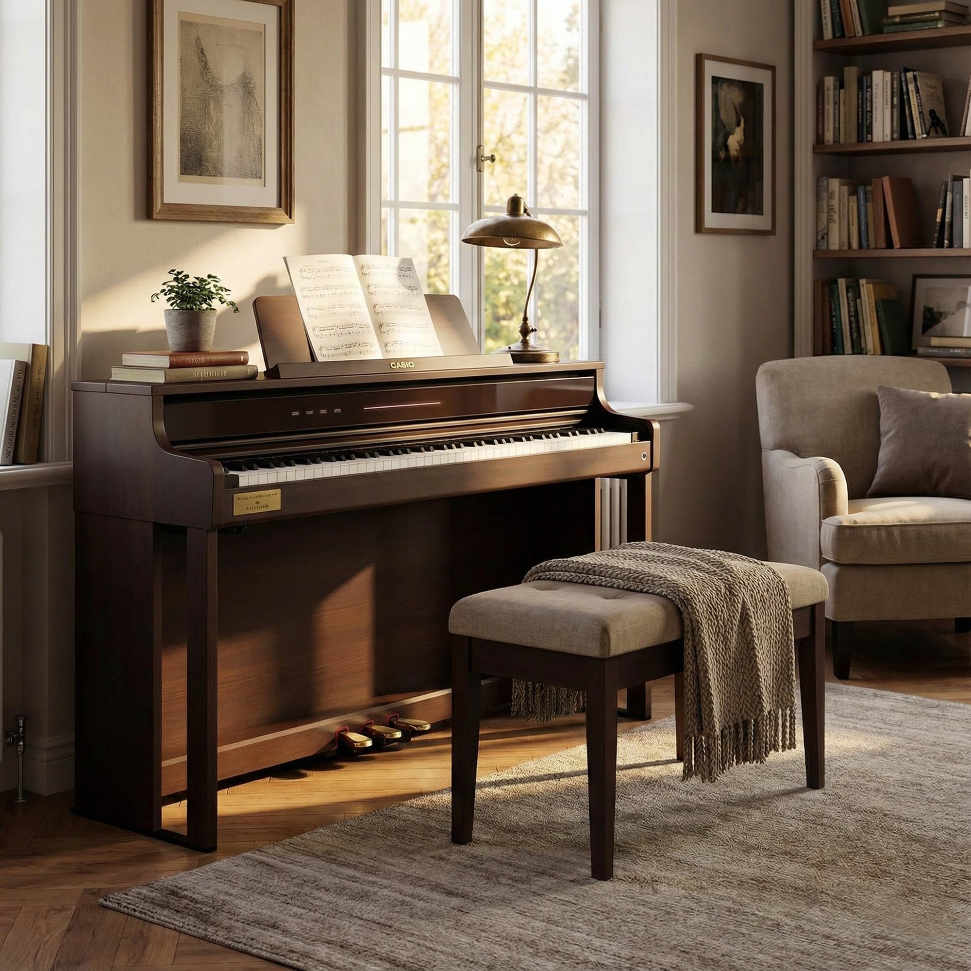 The Casio Celviano AP-750BN blends grand piano resonance and expressive control into a sophisticated home instrument. Its Smart Hybrid Hammer Action Keyboard (CELVIANO Edition) fuses spruce wood and resin for keys that capture the authentic feel of a grand piano, including nuanced touch and release sensitivity. Acoustic engineering with the AiR Grand Sound Source and Grandphonic 8-speaker, 4-channel system delivers immersive sound and realistic resonance. Built-in features like Bluetooth audio and MIDI, USB connectivity, and compatibility with the CASIO Music Space app expand your creative possibilities. The Visual Information Bar provides live feedback on velocity, pedaling, and tempo, while the Instant RePlayer lets you revisit recent performance segments. Three pedals (damper, soft, sostenuto) with continuous control, plus multiple effects, lid simulator, and layer/duet modes round out a professional suite of tools. Product Specifications: Number of Keys: 88 (Smart Hybrid Hammer Action) Touch Response: 5 sensitivity levels + Off Number of Tones: 39 built-in tones Amplifiers / Speakers: 8 speakers, 4 channels (10W×2 + 10W×2) Power Supply: AC Adapter AD-E24250LW (DC 24V) Power Consumption: 24 W The Austin Bazaar bundle equips you with everything needed to start playing right away: An adjustable bench for comfort, instructional book, online piano lessons, Austin Bazaar instructional DVD to help get professional tips and guidance while learning, and a polishing cloth to keep your piano looking pristine. This complete setup lets you focus on making music from day one.