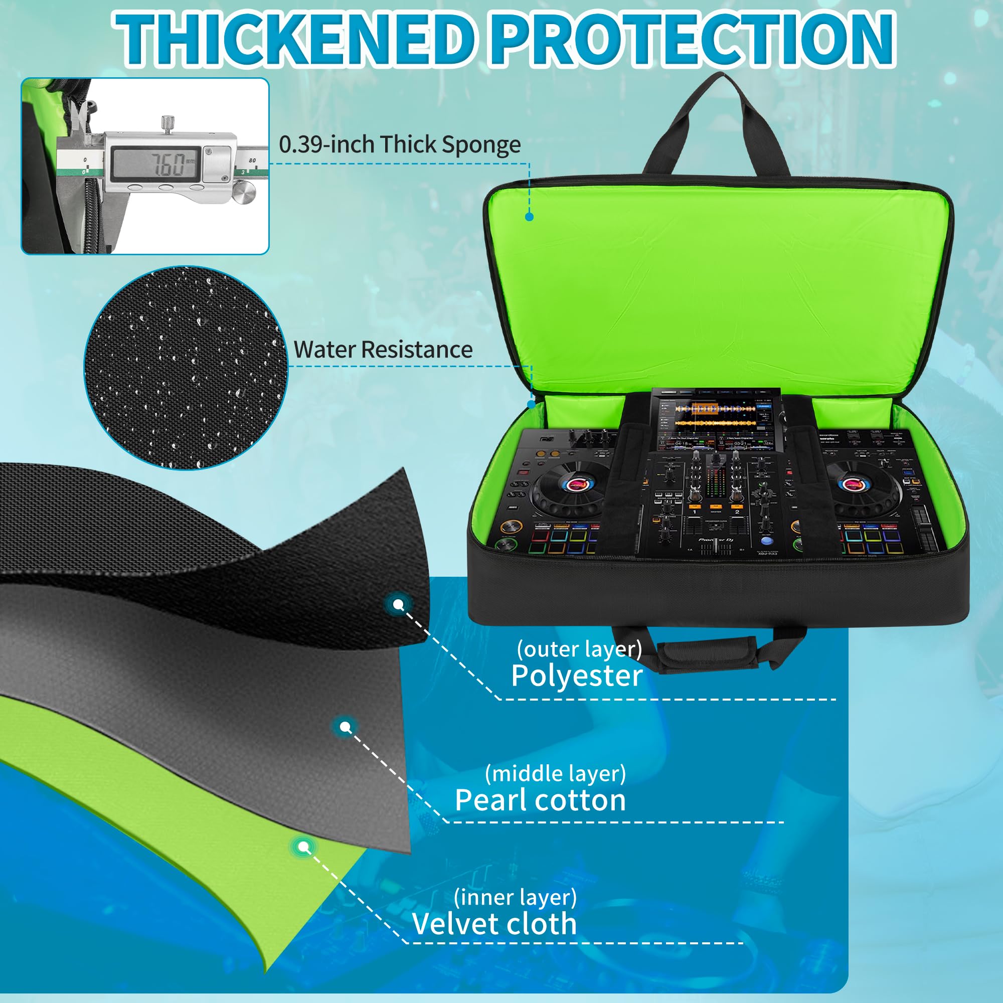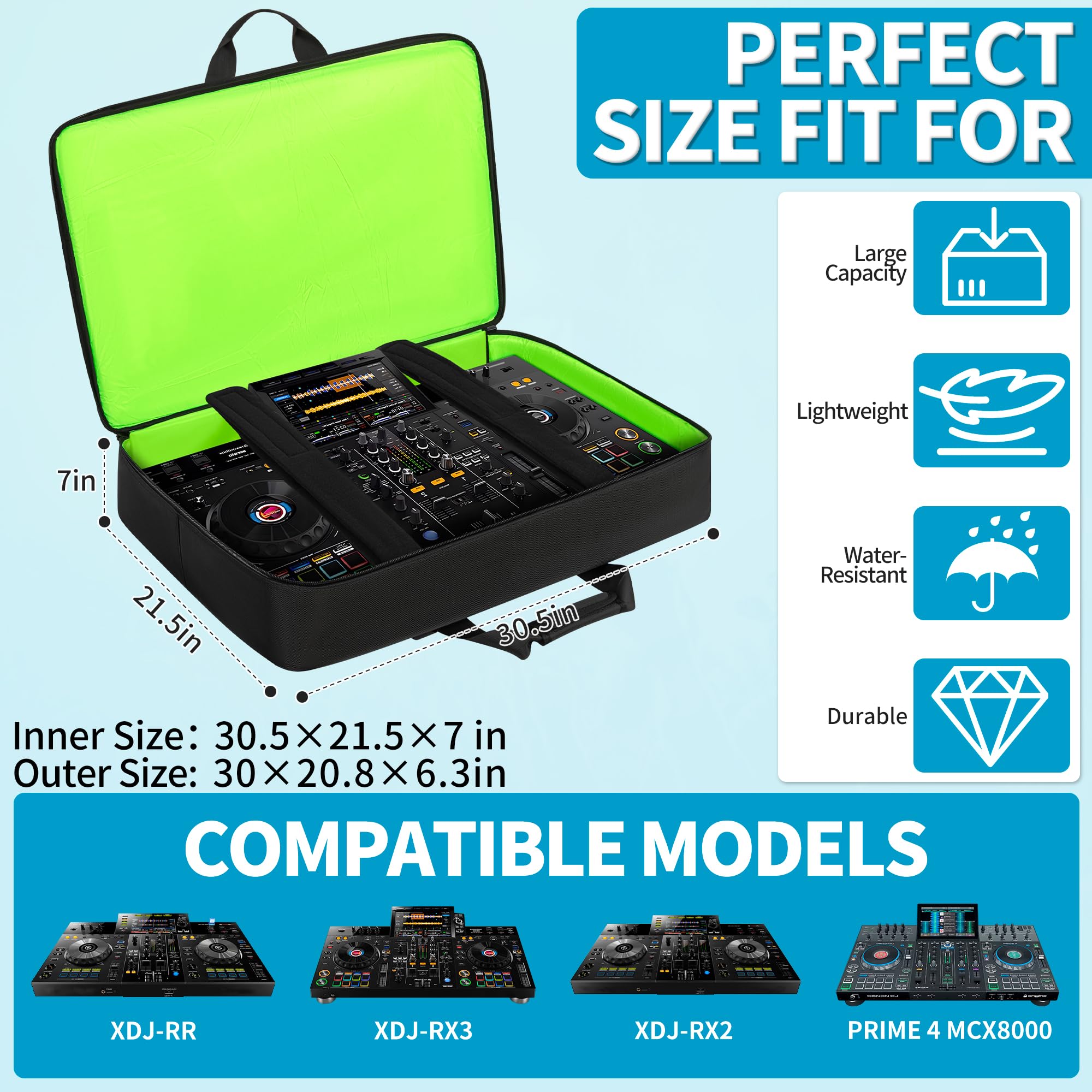 【Product Size】External size: 30.5''W x 21.5''H x 7''D (77.5 x 54.5 x 17.5 CM). Inner size: 30''W x 20.8''H x 6.3''D (76.2 x 52.8 x 16 CM). DJ Controller Carry Bag perfectly Compatible with Pioneer XDJ-RX2, XDJ-RX3, DDJ-REV5/DDJ-REV7,Denon DJ Prime 4/MCX8000. 【Warm Tips】 Please check the dimensions of your DJ controller to ensure you choose the ideal size that fits your DJ controller case bag