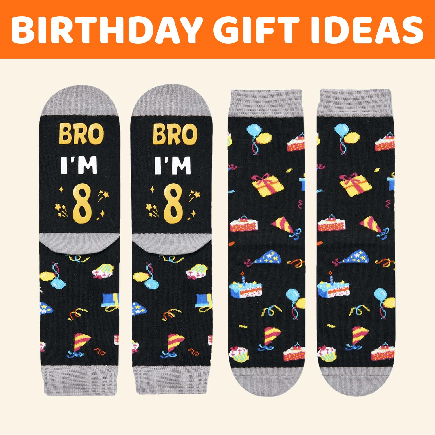 GIFTS FOR 8 YEAR OLD: Celebrate the joyous milestone of turning eight with our stylish "BRO I’M 8" socks! This thoughtful gift is ideal for your child's special day. Make this occasion unforgettable with our distinctive, premium-quality sock presents.