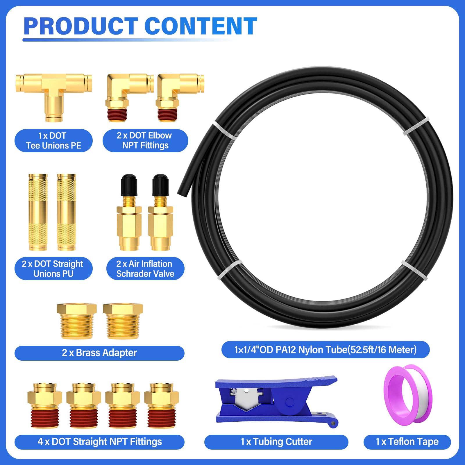 【Package Included】1 ×1/4" Air Tubing, 4 × Straight DOT 1/4" OD x 1/4" NPT Thread, 2 ×Elbow DOT 1/4" OD x 1/4" NPT Thread , 2×1/4" Air Inflation Schrader Valve, 1×1/4"OD DOT Tee, 2 × Straight DOT 1/4" OD, 2×1/2" NPT Male x 1/4" NPT Female Brass Adapter,1× Teflon Tape,1× Tracheal Scissors