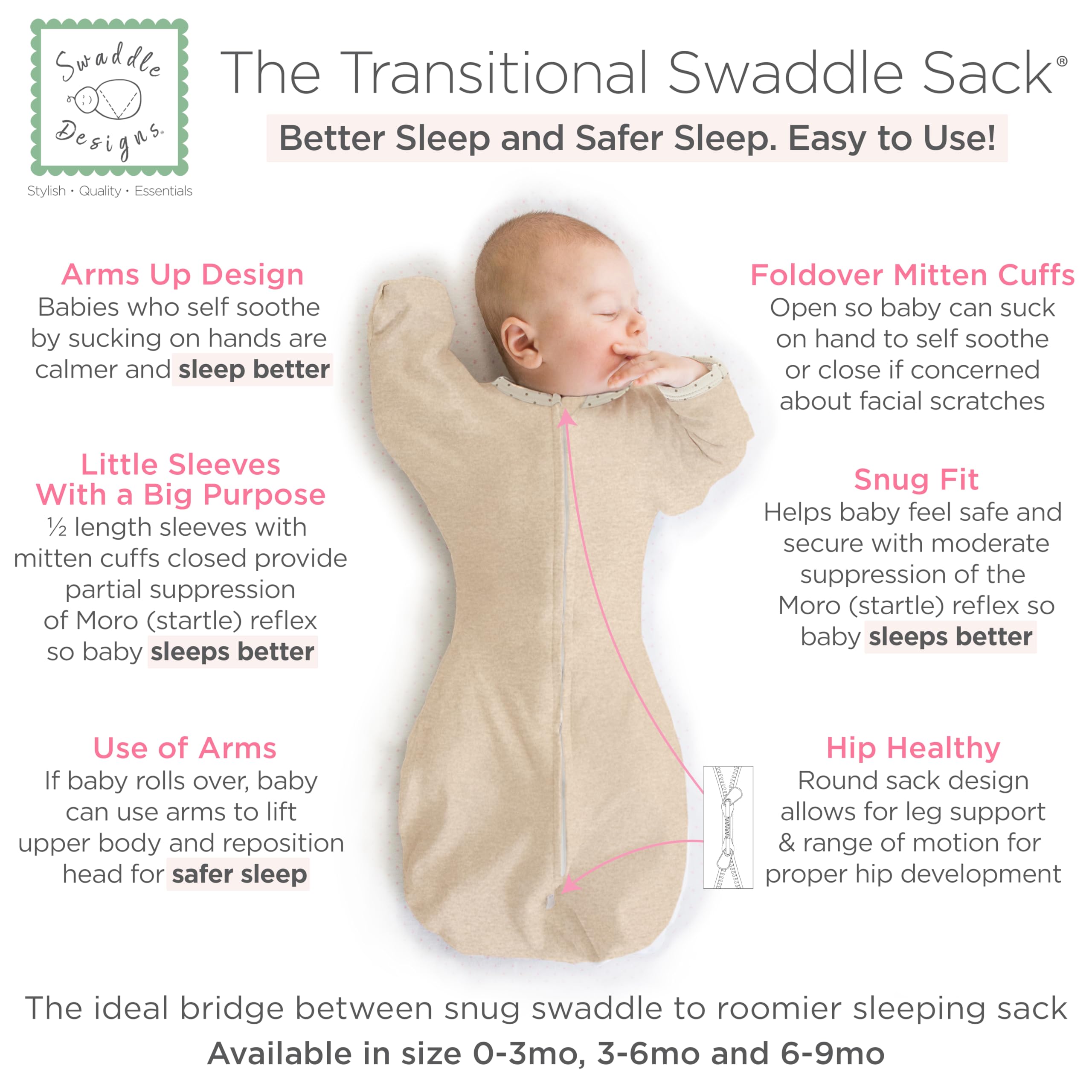 TRANSITIONAL SWADDLE SACK promotes BETTER SLEEP and SAFER SLEEP. Perfect for babies who like to sleep with ARMS UP, babies starting to or able to ROLL OVER, babies who like to suck on hands to SELF-SOOTHE, and for babies who get out of a classic swaddle