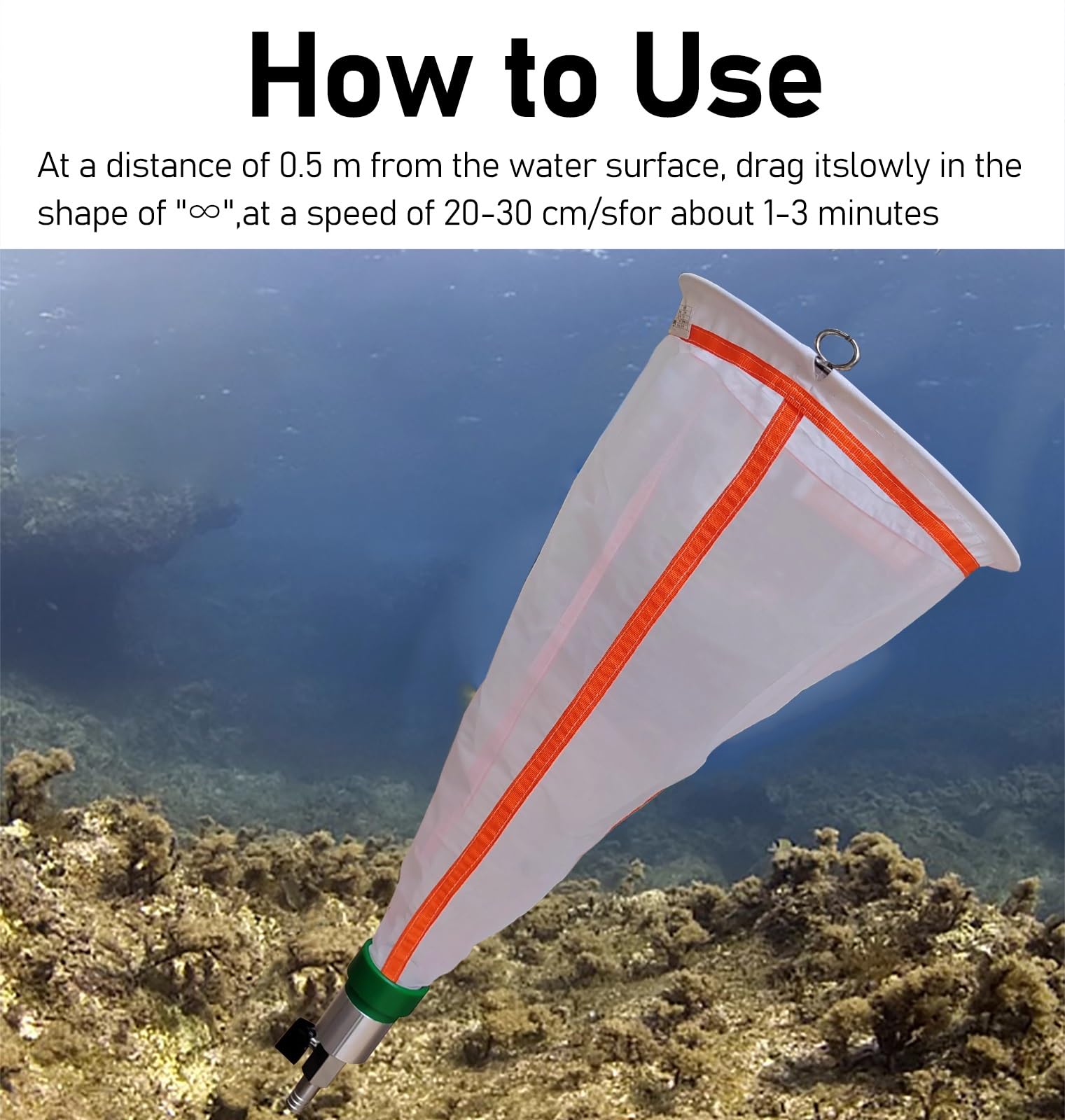 Usage: In the water depth from the surface to 0.5m, do the "∞" shape reciprocating slow drag at a speed of 20-30 cm/s for about 1-3 minutes, after sampling, clean and dry the plankton net and store it in a cool and dry place for later use