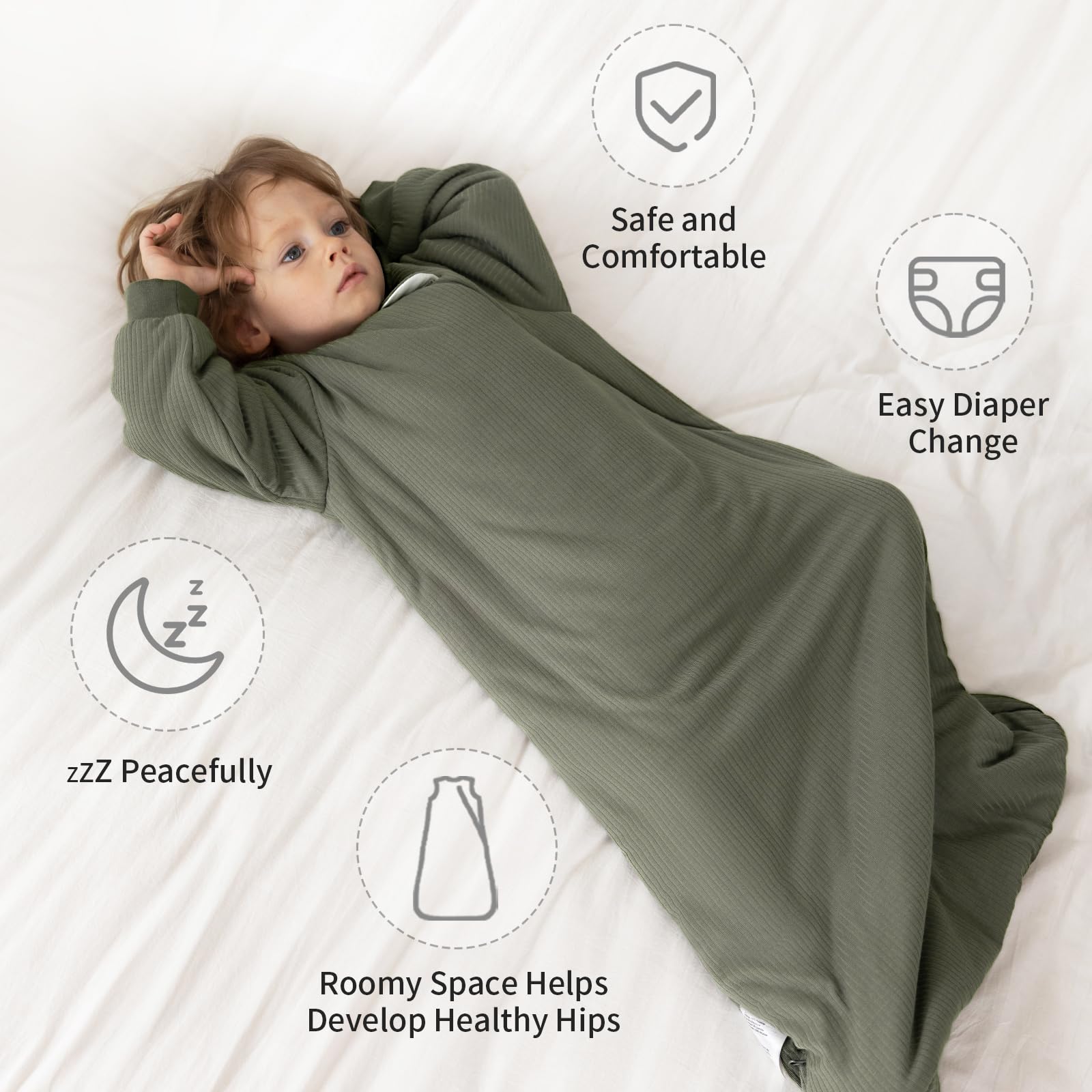 【Roomy and Extended wear】Stretchy roomy leg room allows your baby to sleep in the frog-legged position, move around freely, but cannot be kicked off, so baby stays warm, and promoting healthy hip development. The high-quality rayon made from bamboo fabric and reinforced stitching ensure durability, while the extra-long leg room allows for extended use as your baby grows.