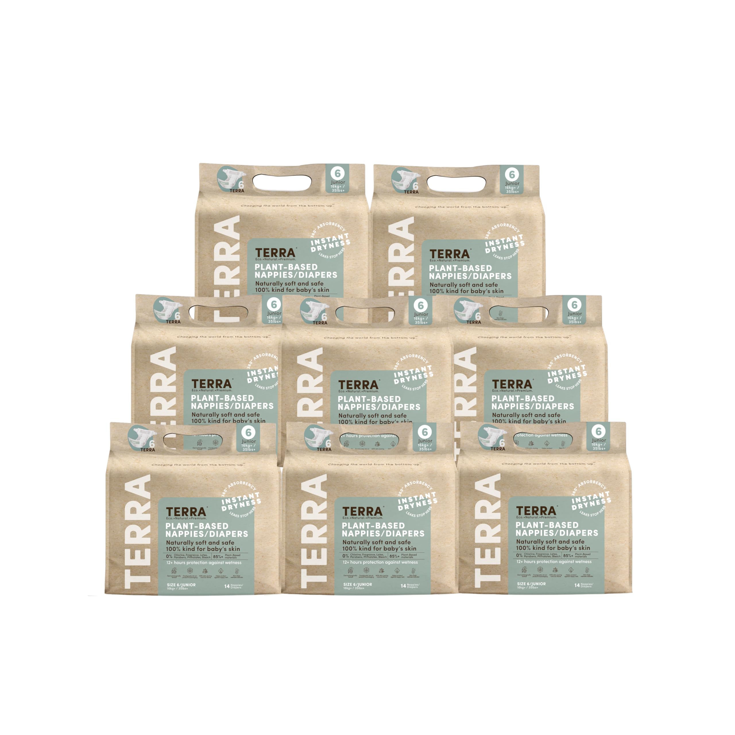 Terra makes products that are better for your baby, and their world, without compromising functionality! Terra plant-based diapers and bamboo baby wipes are the real deal – they perform like you need them to – and are better for the environment. Terra Diapers are 85% plant-based, which is as much plant-based material as we can currently use without sacrificing performance. Our diapers are designed with ultra-soft materials and a gentle, hypoallergenic liner that's free of harmful chemicals, making them safe and gentle for even the most sensitive skin. Our diapers provide a snug fit and reliable leak protection to keep your baby dry and comfortable, even overnight. The unique 360˚ Absorb Pad increases the absorbency area for instant dryness and 3D leak guards prevent leaks and side spills. Within 60 seconds of wetting, the diaper top sheet is dry to the touch, meaning you don’t have to change your little one as often because they’re dry! Even the wetness indicator is plant-based. When you choose Terra, you're not only making a choice that's safe for your baby, but you're also making a choice that's better for the planet.