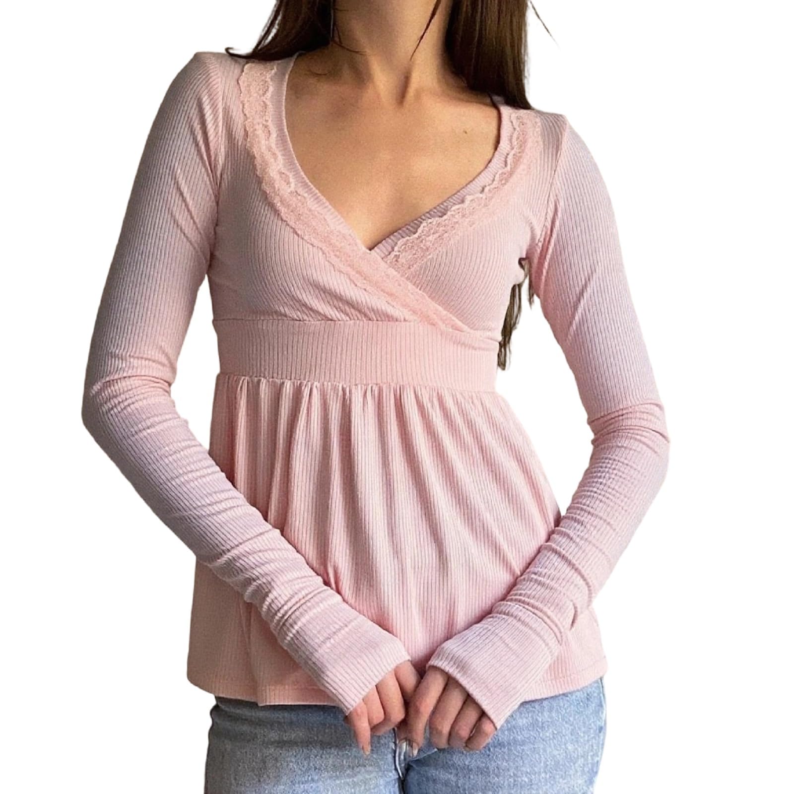 FEATURES: Women y2k tops fairy grunge shirts, long sleeve, solid color, lace trimmed square collar, ribbed knit, lace patchwork, slim fit blouse tops, tight shirts for women, ribbed y2k tops, y2k goth aesthetic clothing, trendy teens 90s egirl Harajuku gothic clothes fall streetwear
