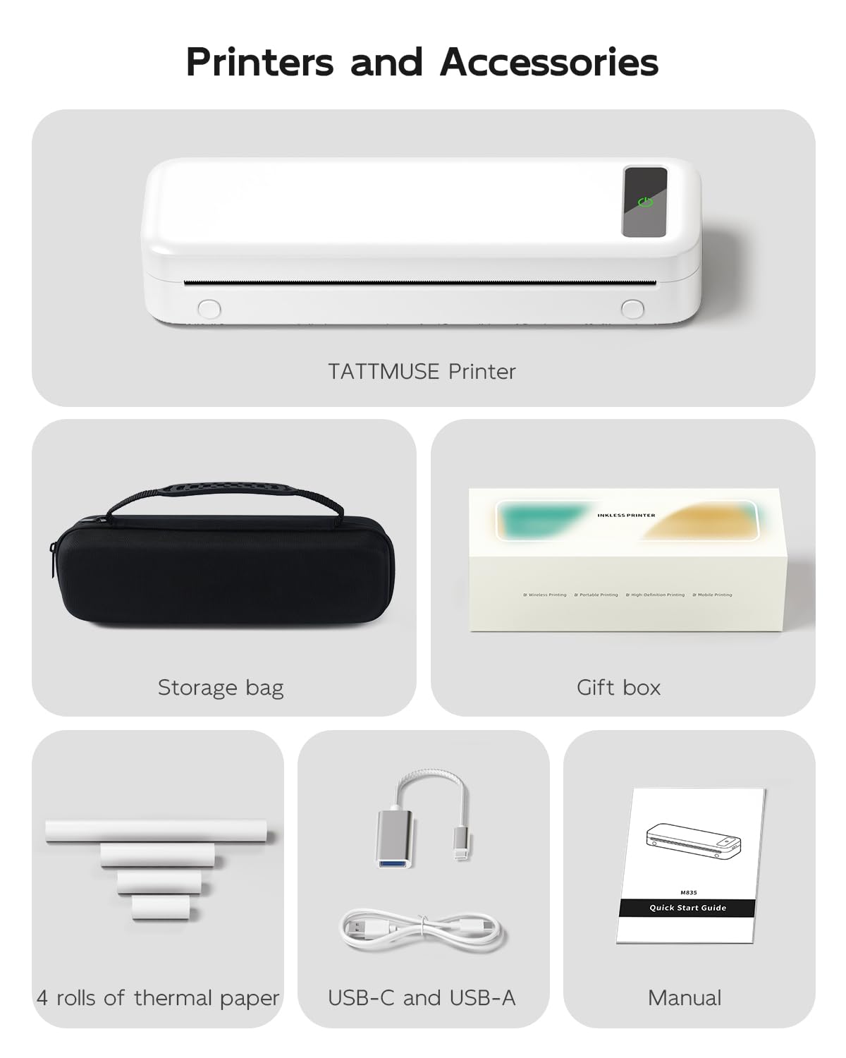 Portable Travel Printer with Carrying Case [Compact & Space-saving]: Inkless portable printer weighs only 1.5lb, built-in high-capacity rechargeable battery, print 160 sheets of 8.5'' x 11'' thermal paper per charge. The package includes a thermal printer, a carrying case, 4 rolls of thermal paper (1 roll letter size thermal paper inside the printer & 4.33"/3.14"/2.08'' size), USB-C & USB-A cable, user guide. Ideal for on-the-go printing during business travel, in car or truck, small office, construction site, school and home use