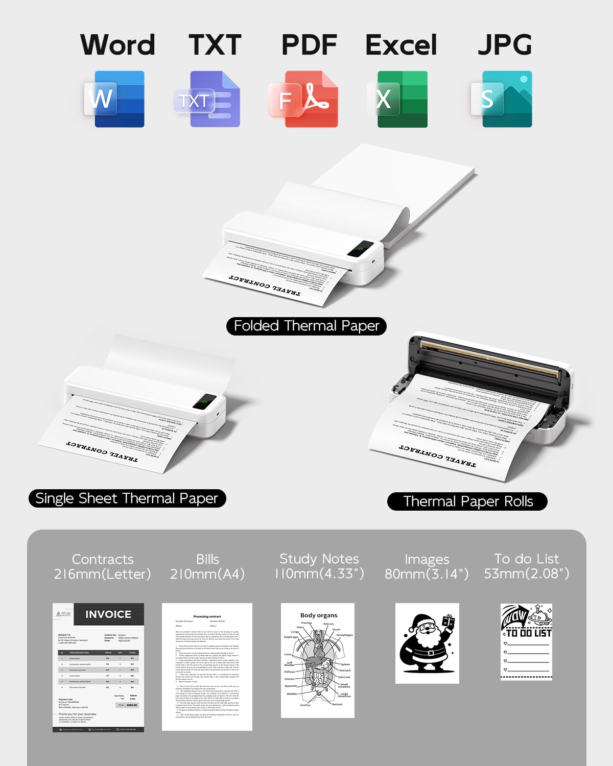 Thermal Printer [Multi-Size Printing]: The wireless portable printer with built-in paper bin, support thermal roll paper, folded and single sheet thermal paper. This small wireless printer also supports 5 sizes of thermal paper: 8.5“ X 11” US Letter, A4, 4.33'' (110mm), 3.14'' (80mm), 2.08'' (53mm) width thermal paper, can meet most of your needs