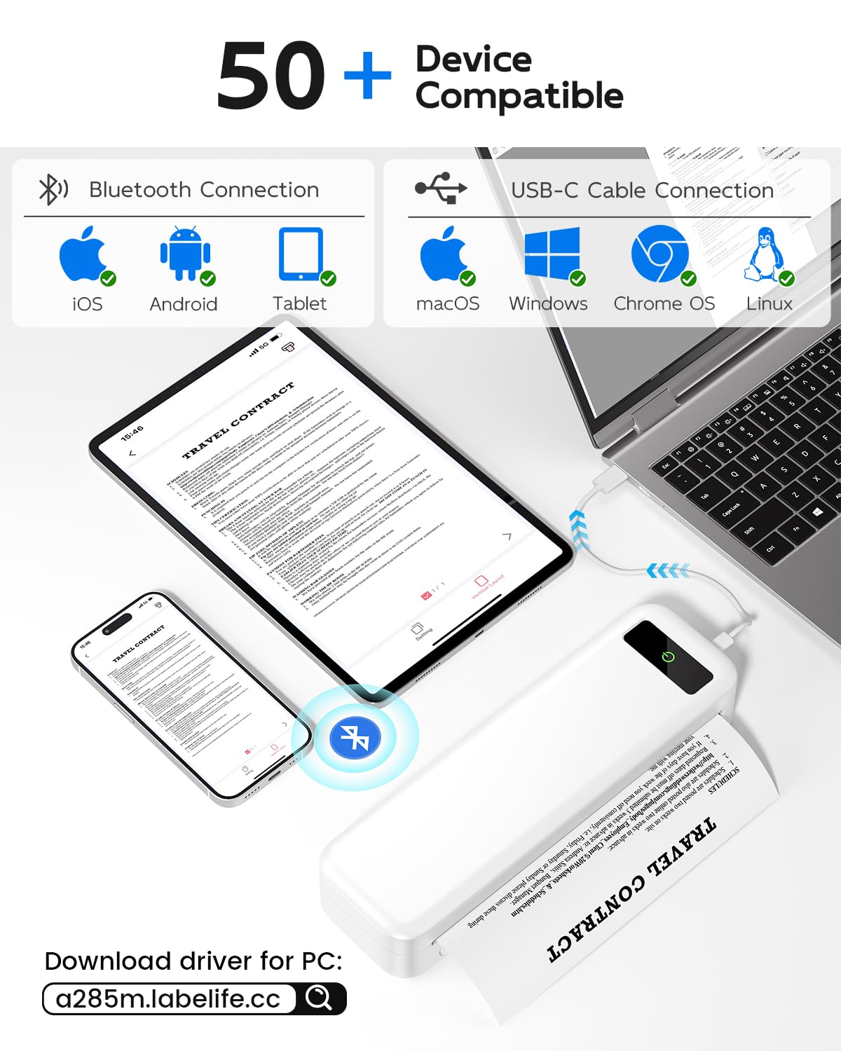 Wireless Bluetooth Printer [High Compatibility]: The portable thermal printer compatible with iPhone, Android Phone, iPad, Tablet via Bluetooth. You can print documents, contracts, bills, receipts, web pages, notes, lists anytime, anywhere. You can also use the USB-C cable to connect your laptop and computer for printing. (Note: Laptop and computer only work with USB connection, need to download the driver first)