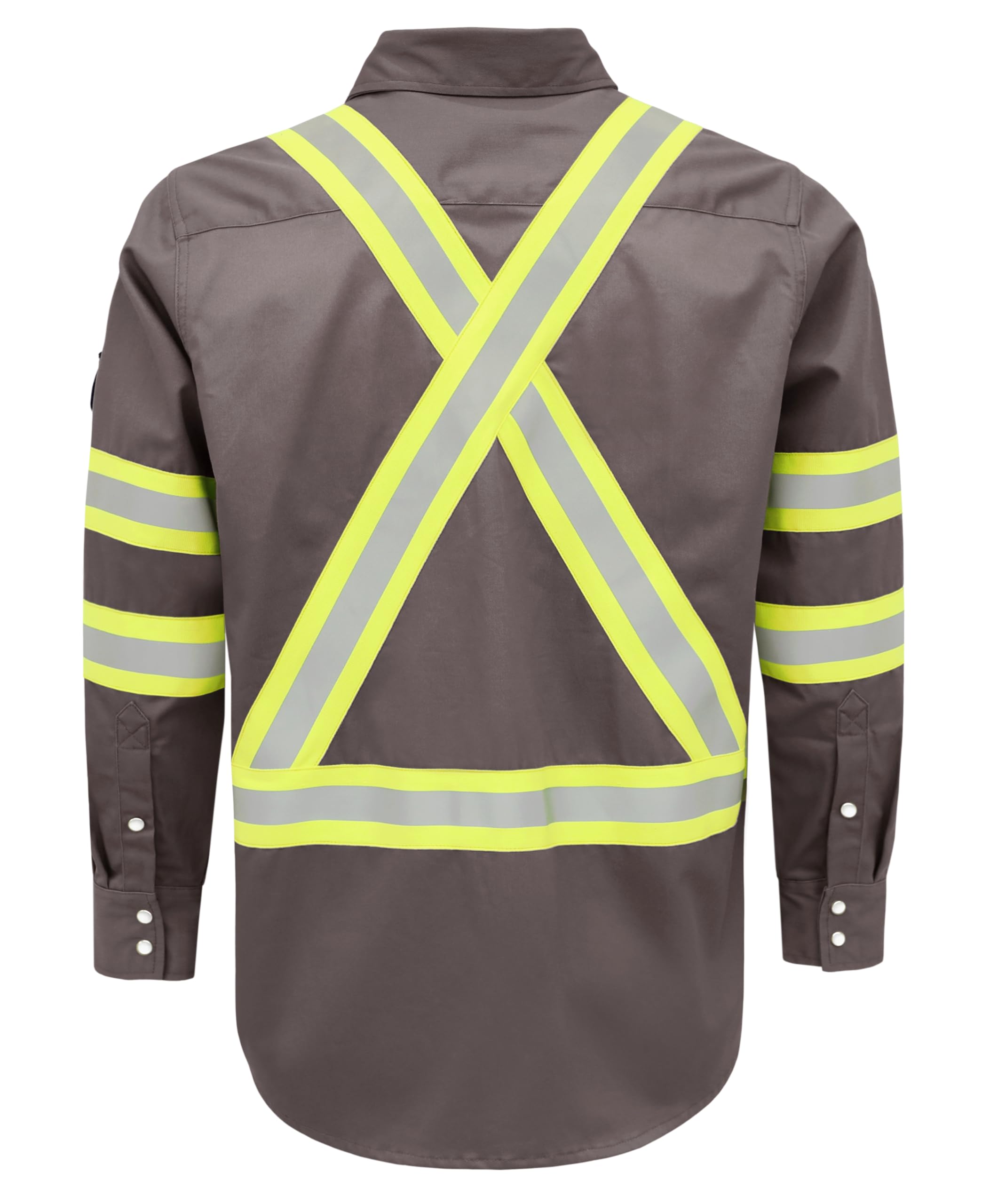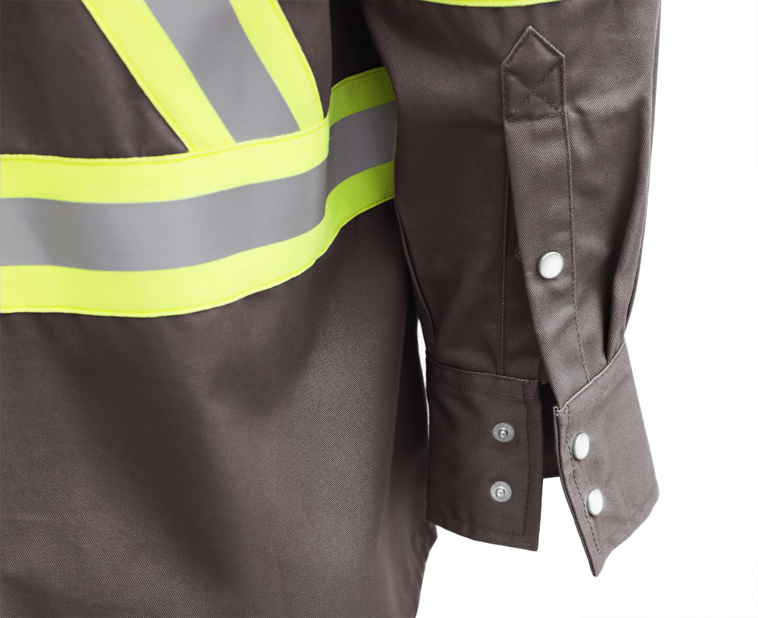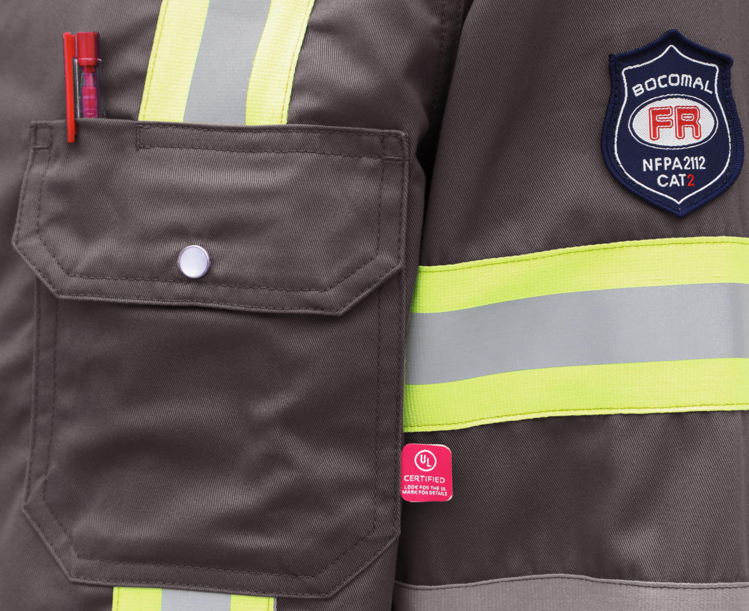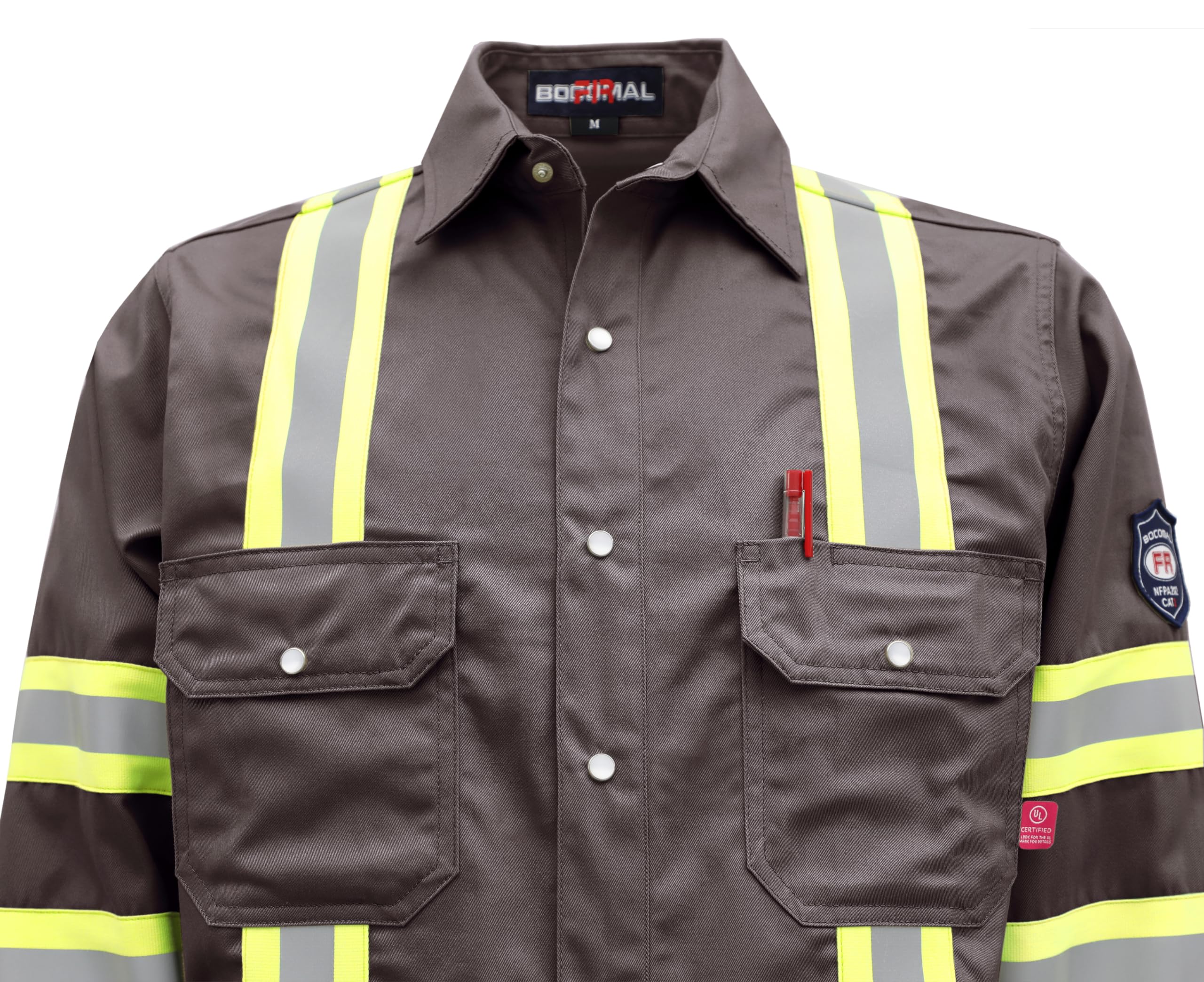 FR MATRIALS:7.5oz cotton twill FR treated,FR buttons,FR aramid sewing threads, 2.4" yellow reflective tape with 1" FR siliver paint-ANSI/ISEA 107-20 Type O CLASS 1.!More area reflection on back and arm.Clear FR tag on arms and more FR info on inside tag about UL certification.We attached a small sample inside package for customers simple FR try