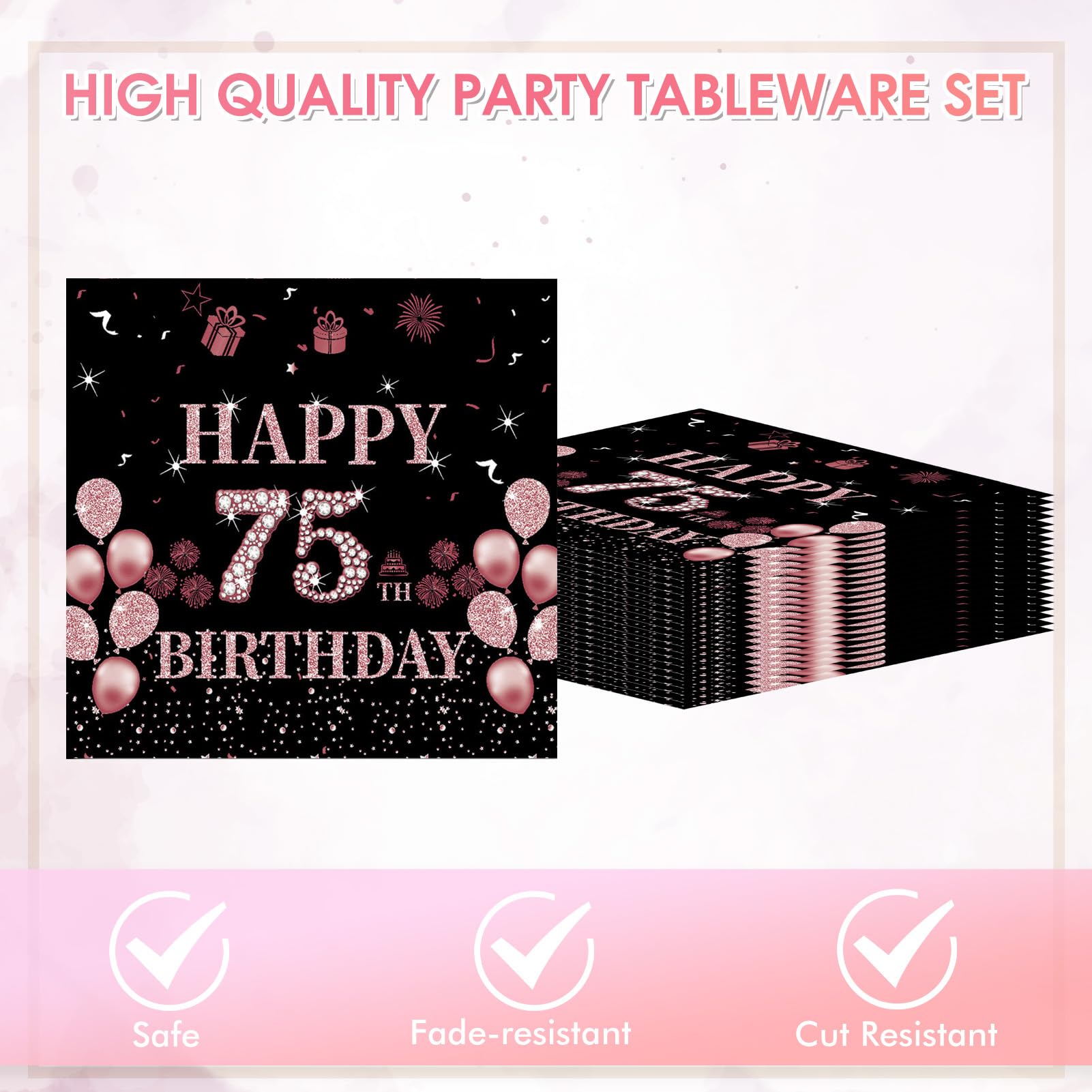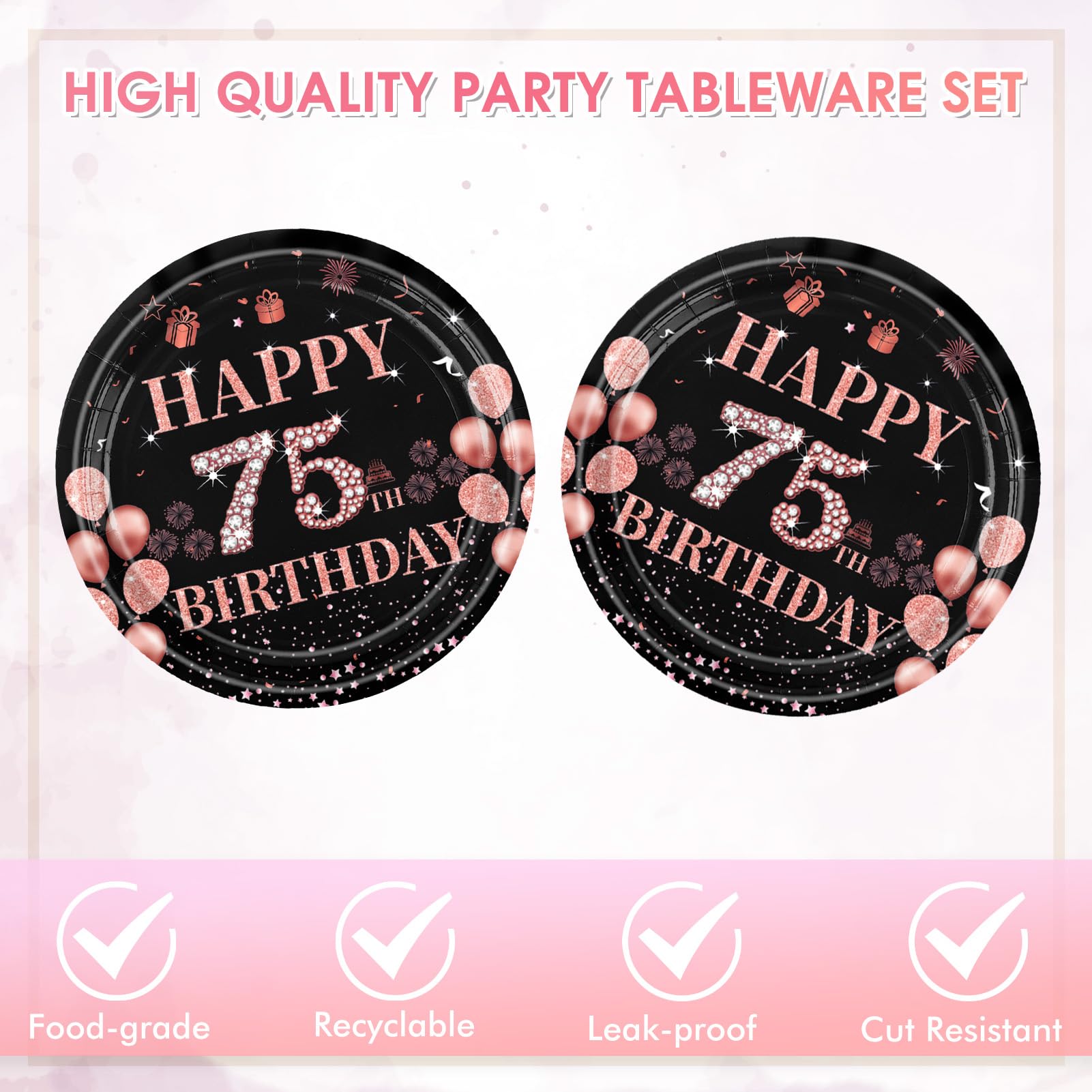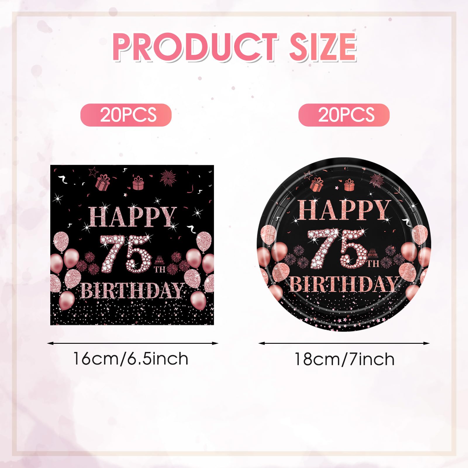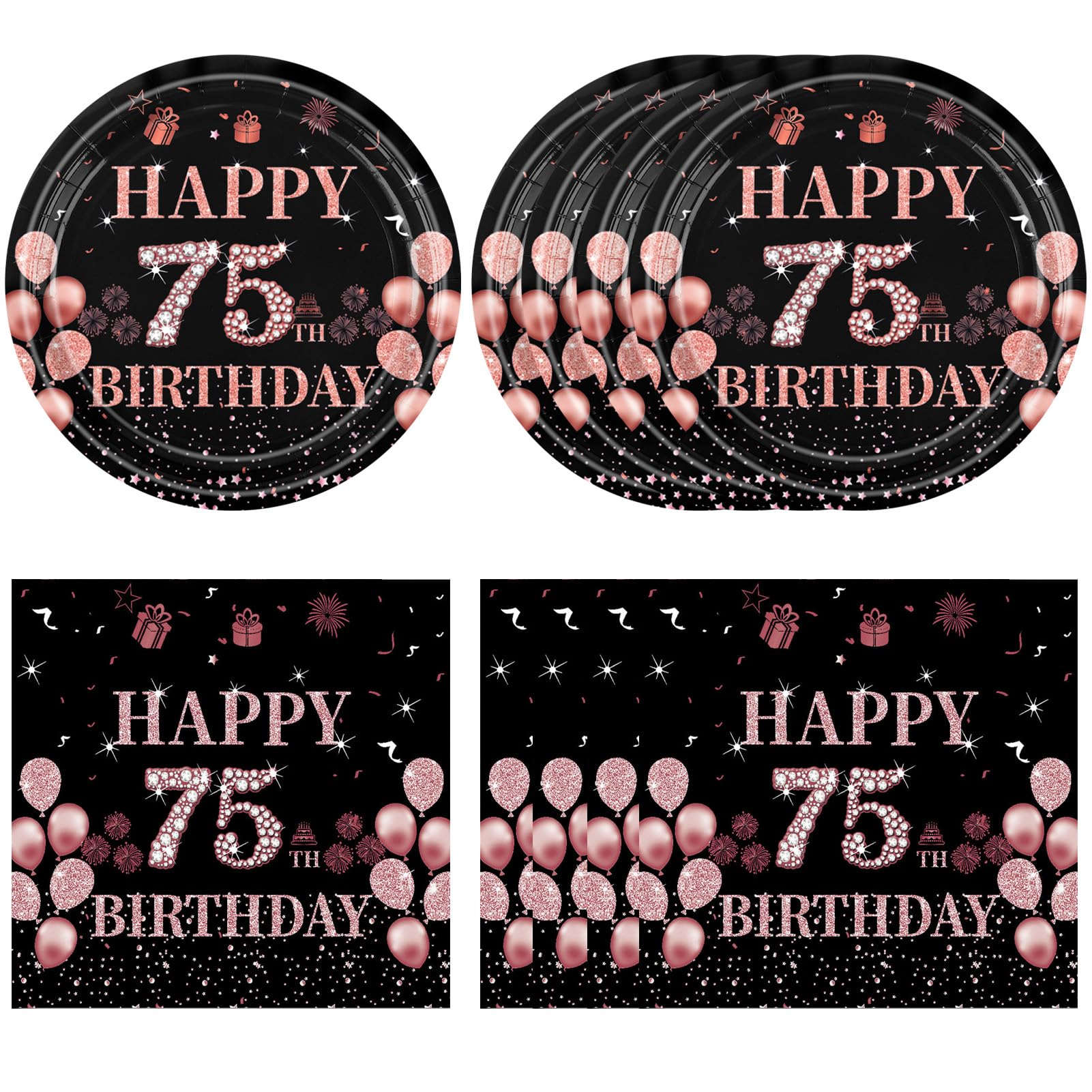 Packaging includes: You will receive Black Rose Gold 75th birthday decorations, These include 20pcs 7" 75th birthday plates and 20pcs 13" 75th birthday napkins. This happy 75th birthday decorations has everything you need to throw a perfect family celebration for mom’s or dad’s birthday! Each set can serve 20 guests.