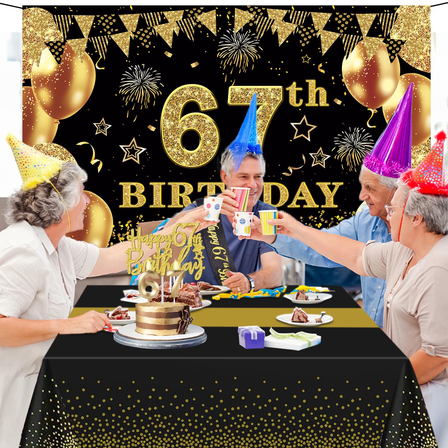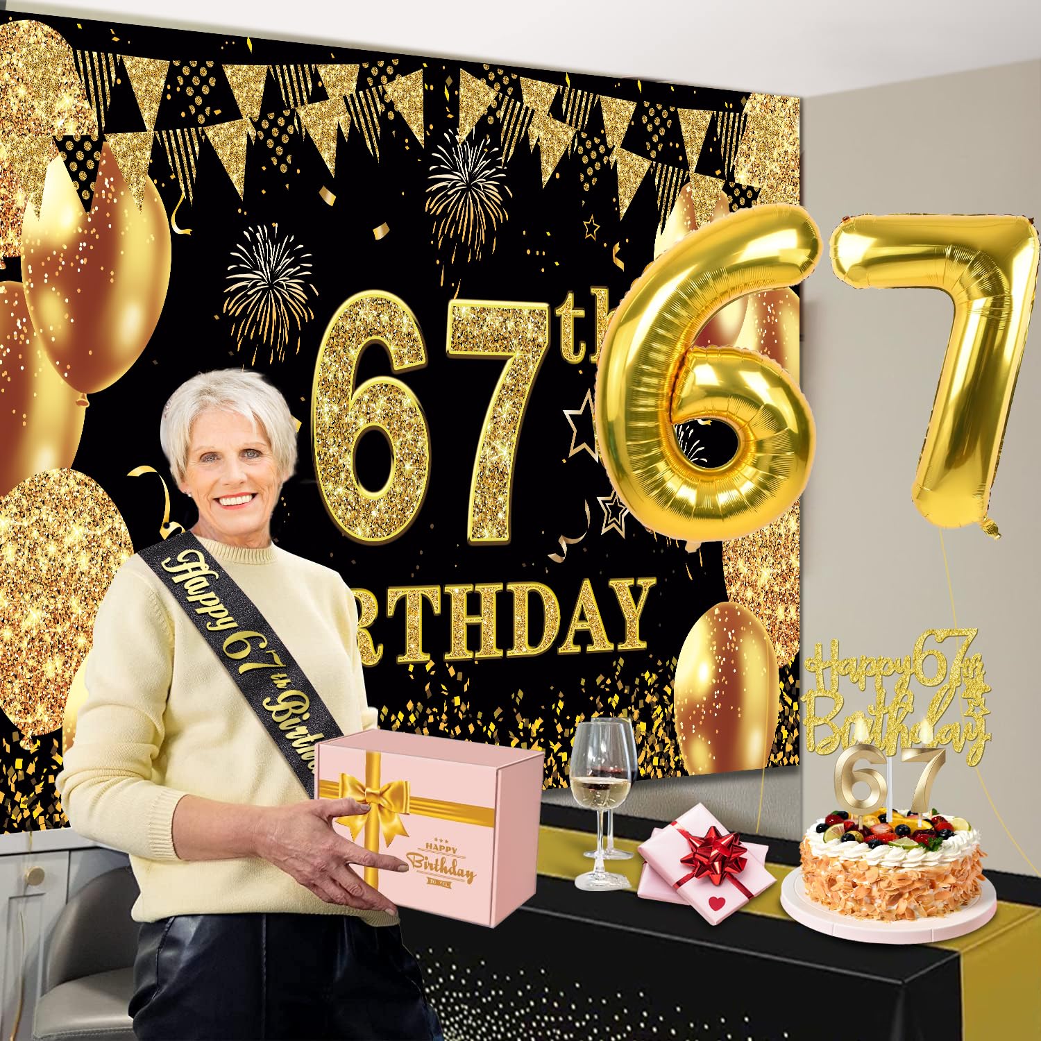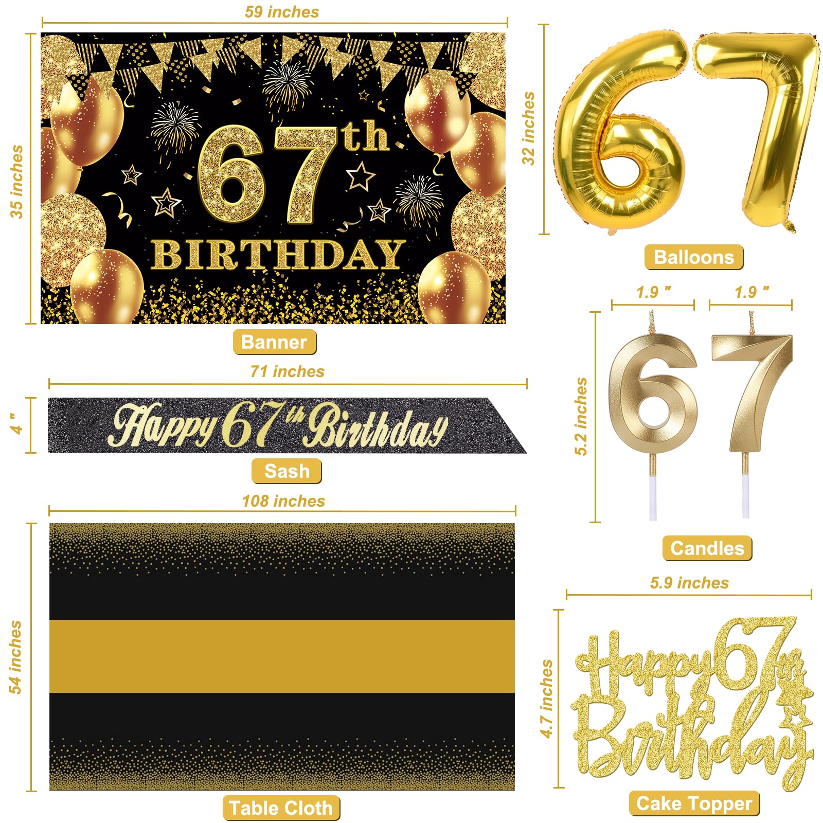 67th Birthday Decorations Kit: Packing coming with Large 67th Birthday Banner x 1pc, Big Gold 67th Birthday Balloons x 1set, Black and Gold Table Cloth x 1pc, Black Glittery with Gold Foil Words Happy 67th Birthday Sash x 1pc, Happy 67th Birthday Cake Topper x 1pc, Gold Number 67 Candles x 1set. This Value Black and Gold Party Decorations Set Meet Your Every Needs and Expects in 67th Birthday Milestone