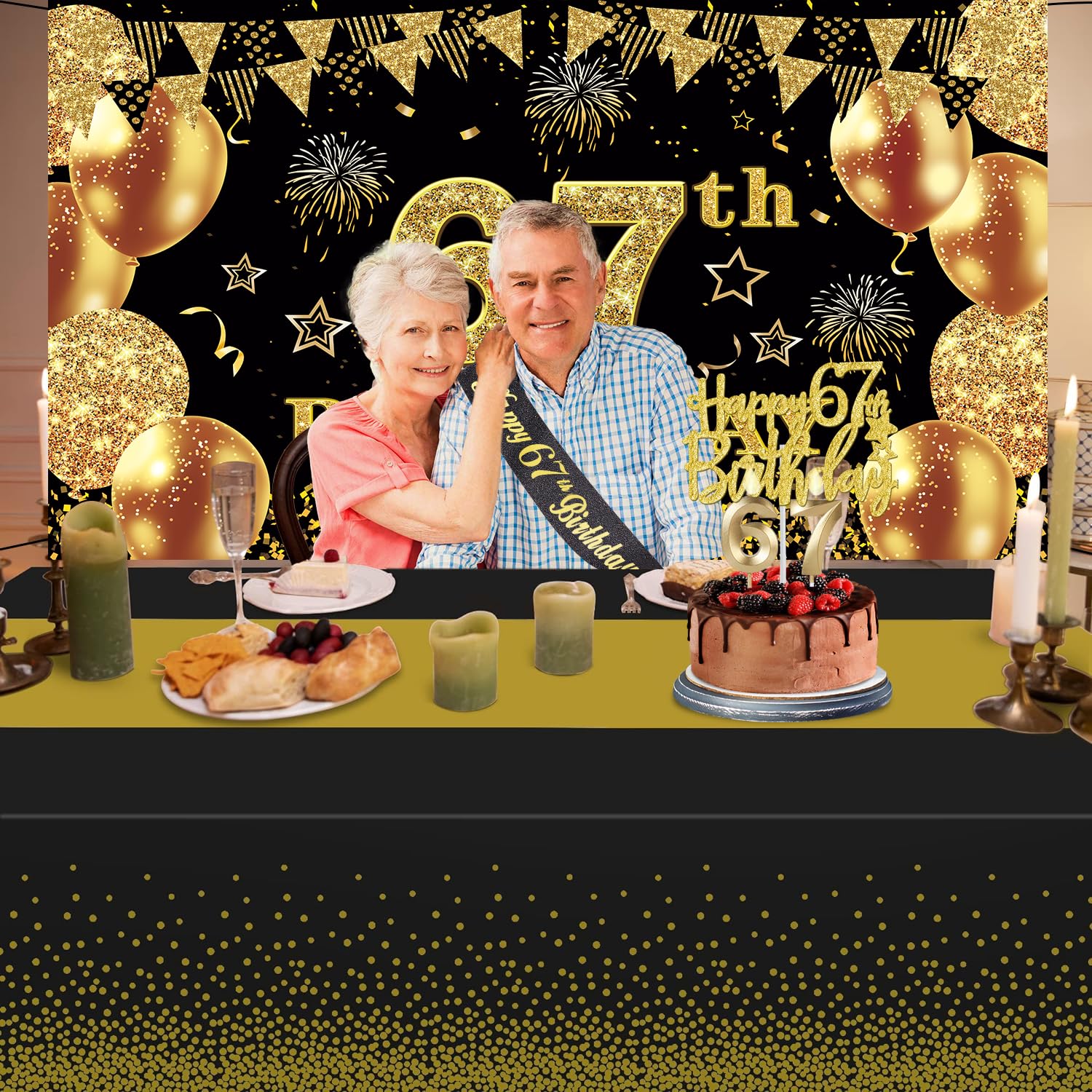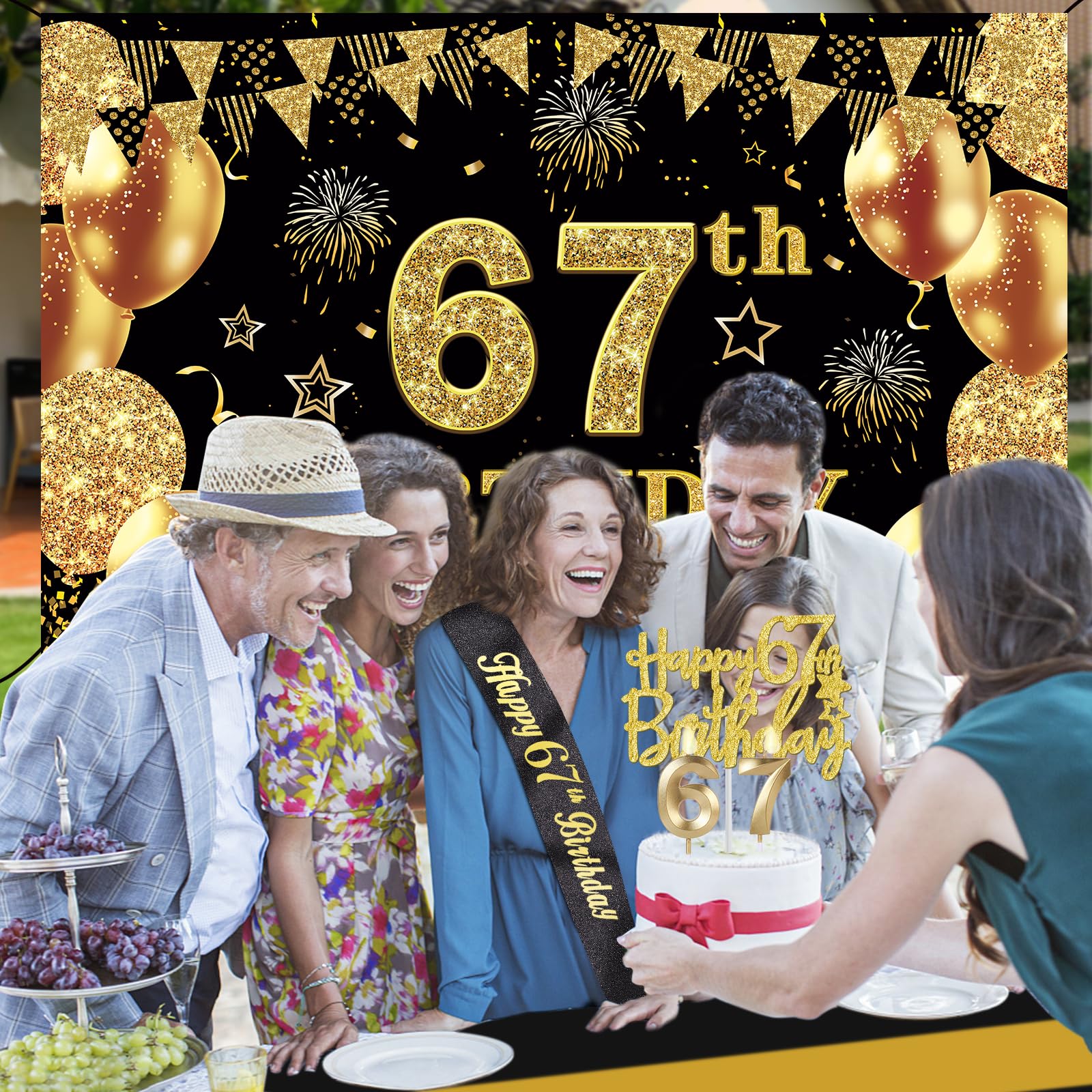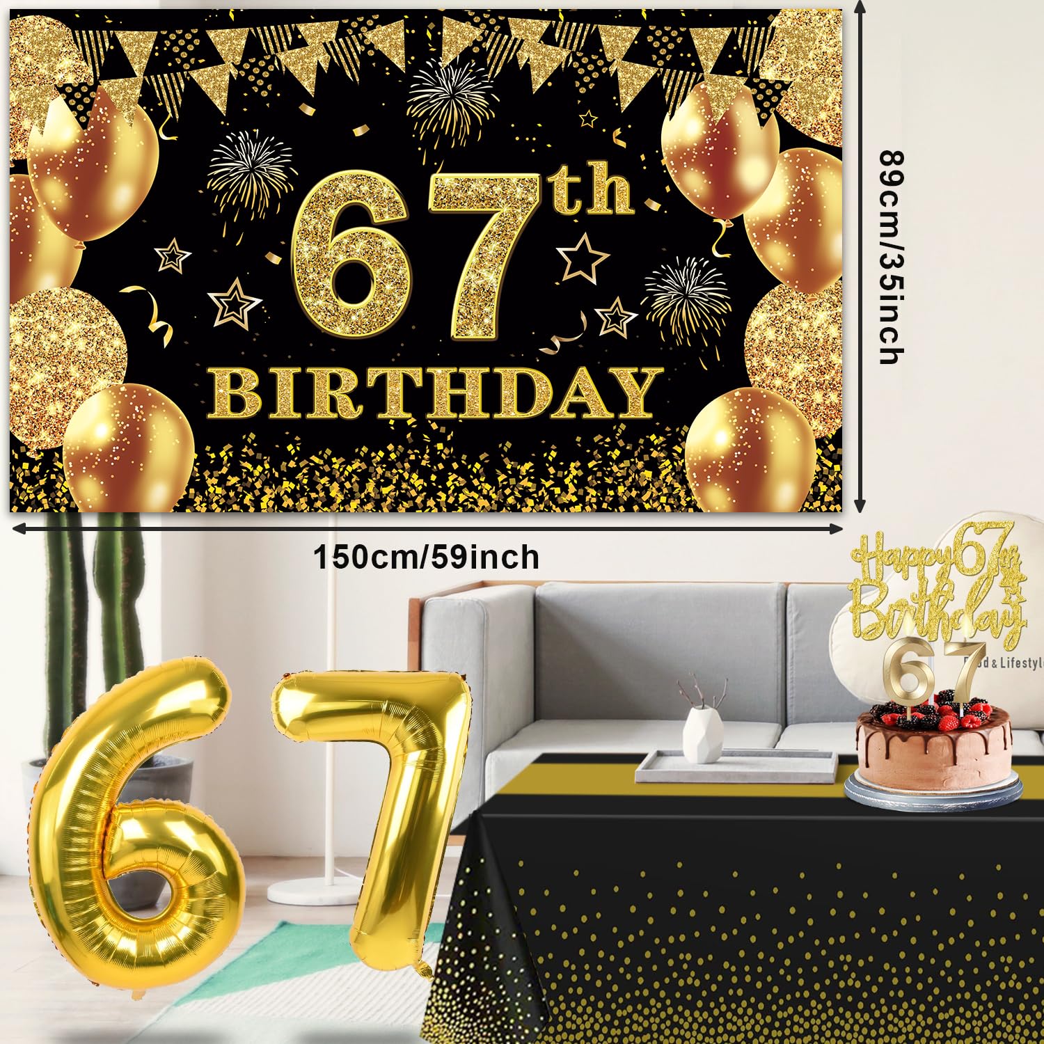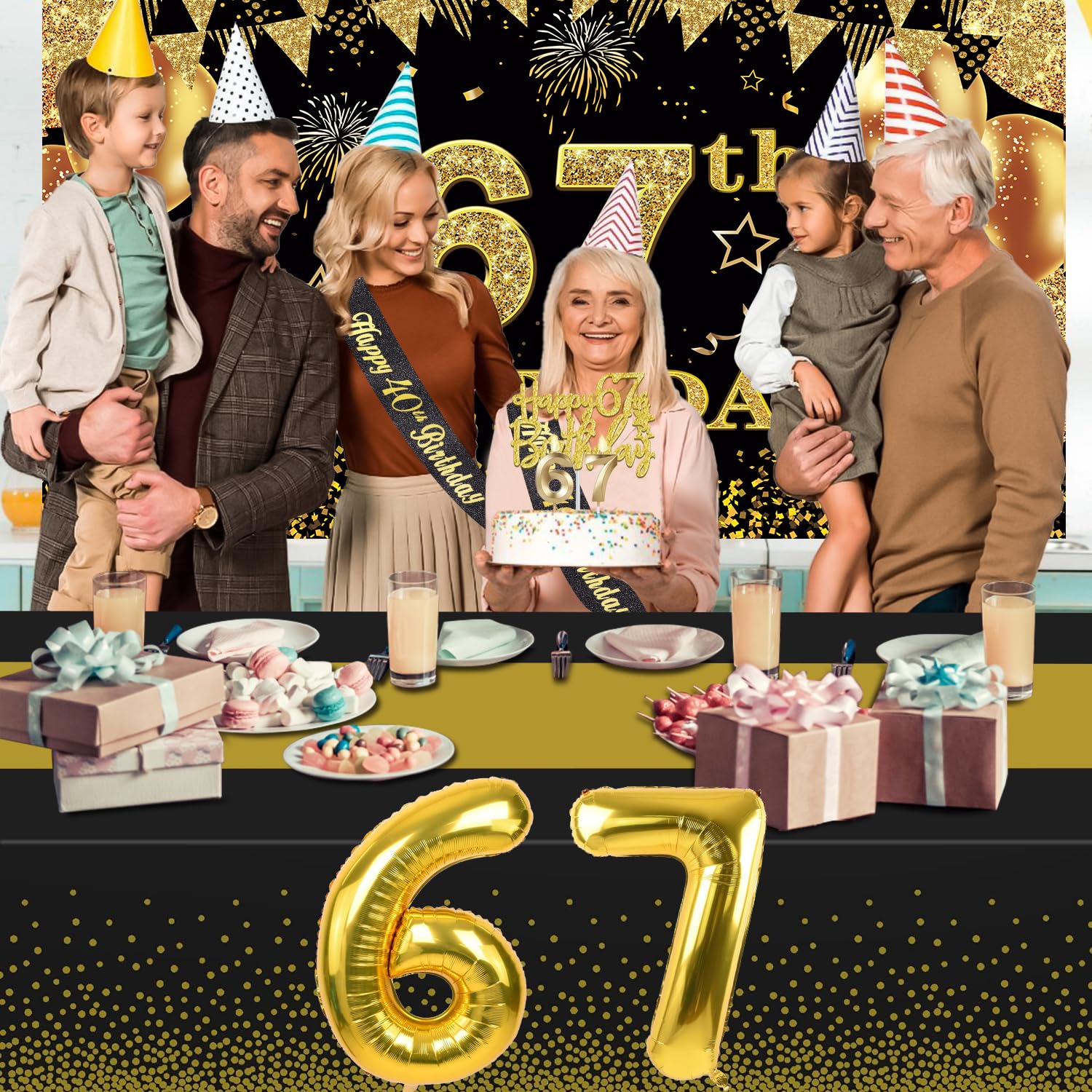 67th Birthday Decorations Kit: Packing coming with Large 67th Birthday Banner x 1pc, Big Gold 67th Birthday Balloons x 1set, Black and Gold Table Cloth x 1pc, Black Glittery with Gold Foil Words Happy 67th Birthday Sash x 1pc, Happy 67th Birthday Cake Topper x 1pc, Gold Number 67 Candles x 1set. This Value Black and Gold Party Decorations Set Meet Your Every Needs and Expects in 67th Birthday Milestone