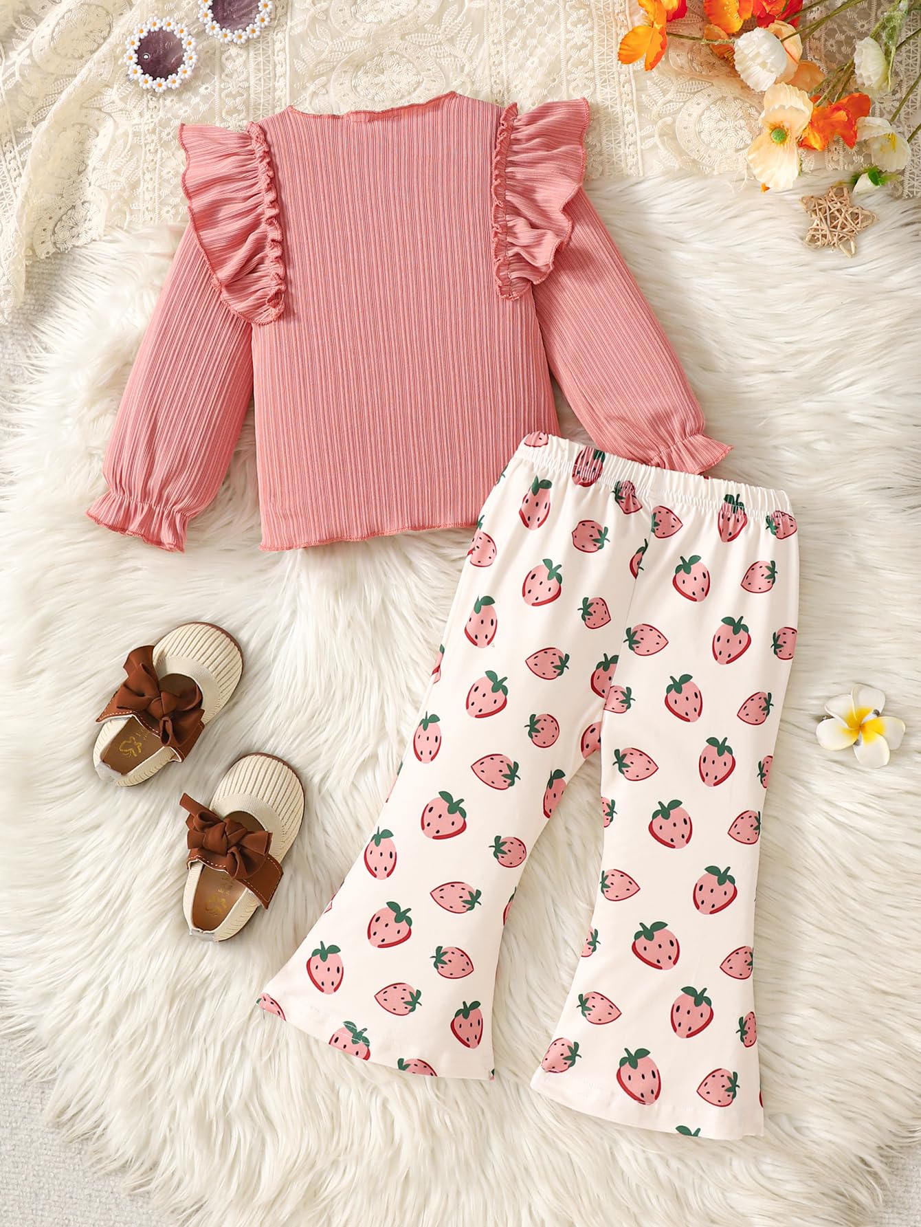Cute and Trendy Clothes: This two piece outfits for girls includes a ruffle shirt with sweet ruffle details along the chest,neckline,and back that add just the right amount of charm without being too fussy,and bell bottom pants with elastic waist. Your little princess will love such a cute outfit!