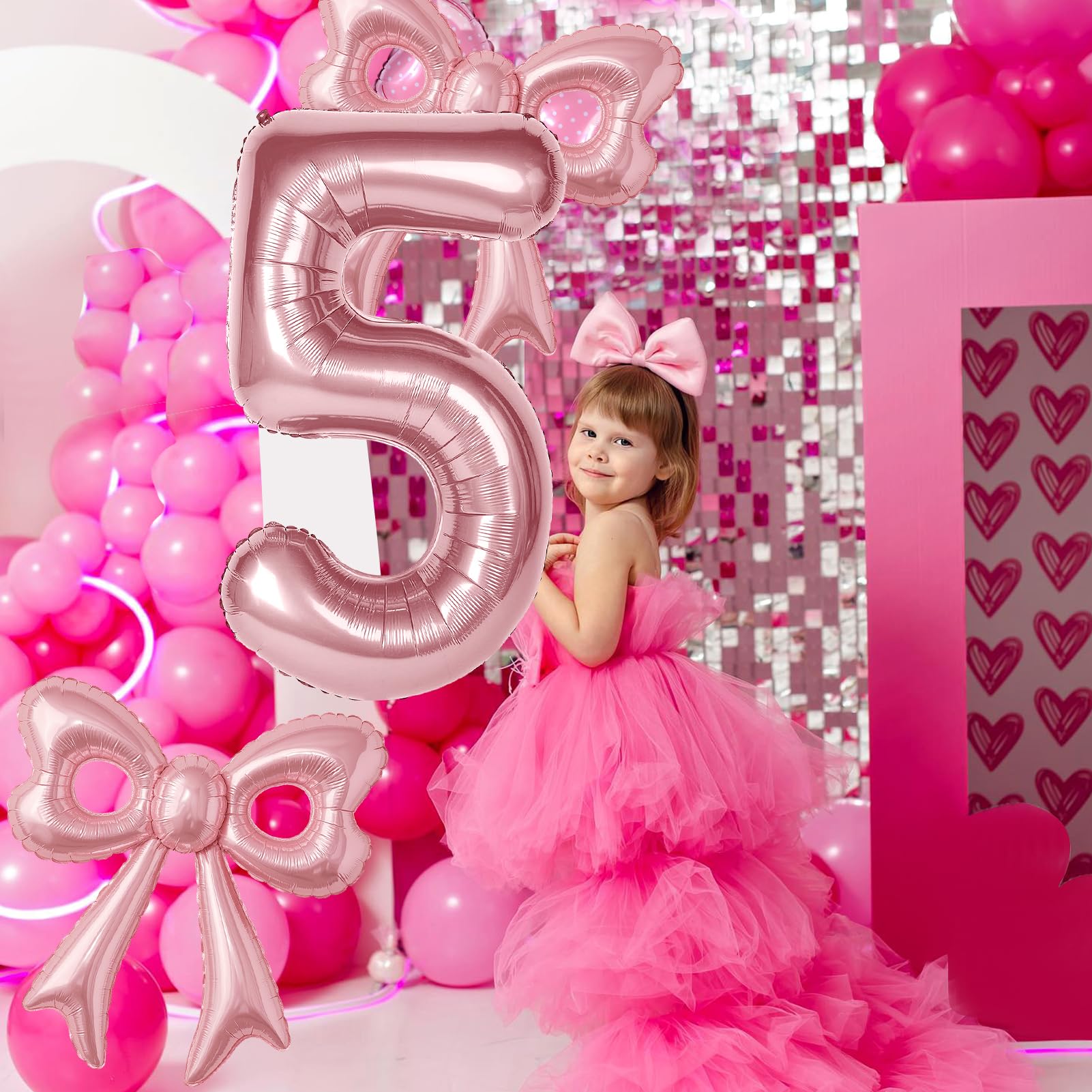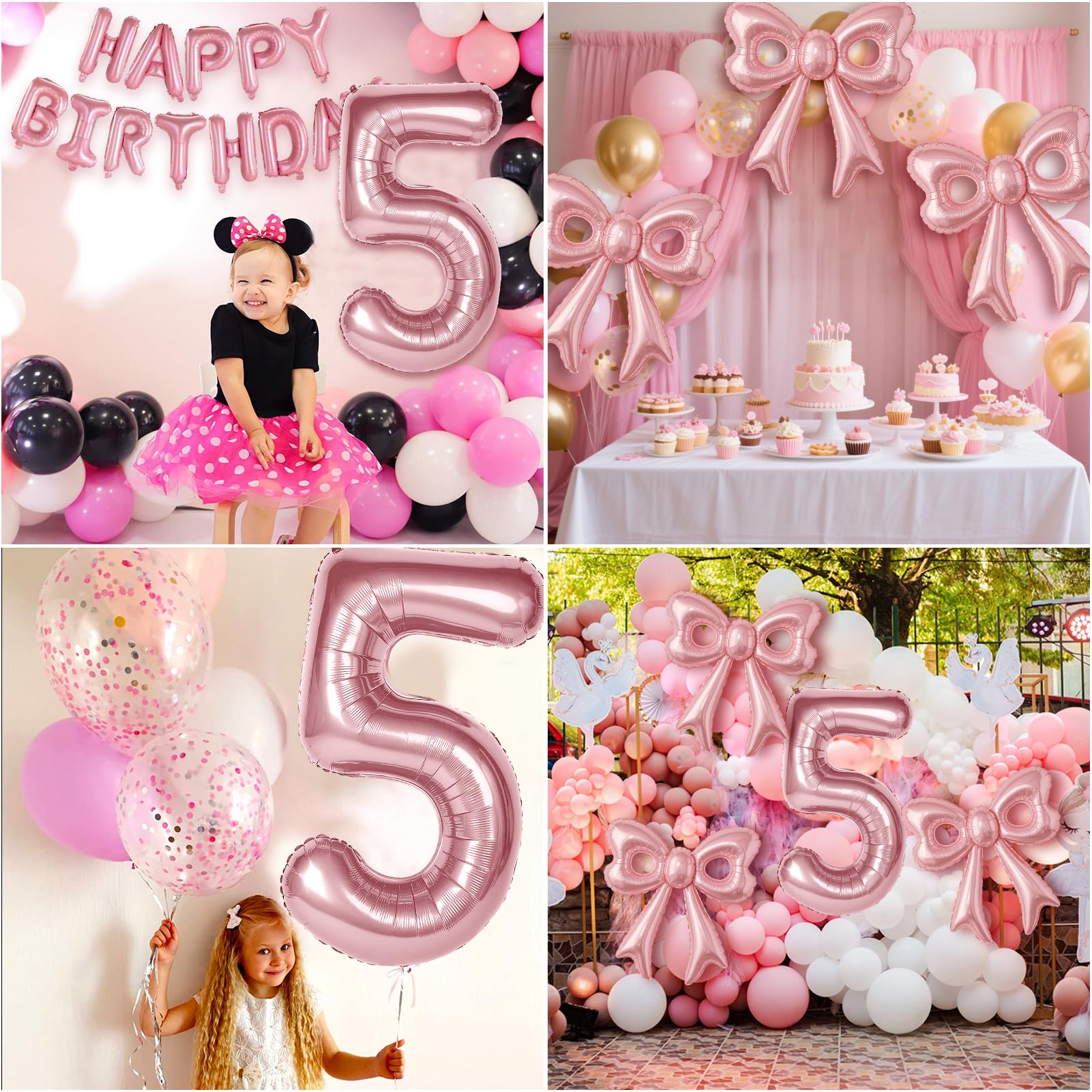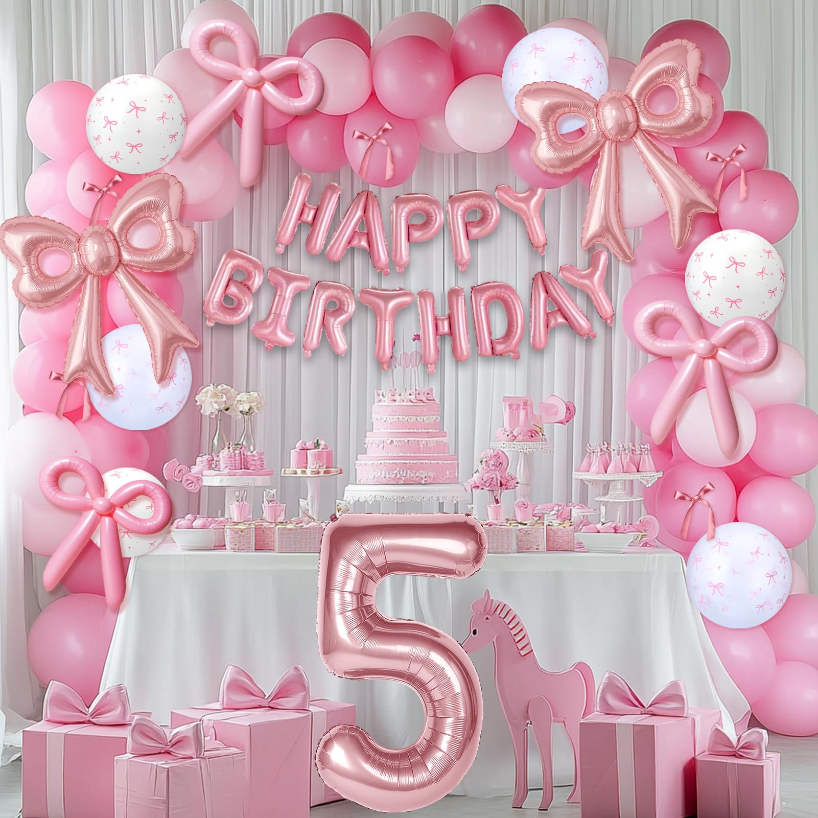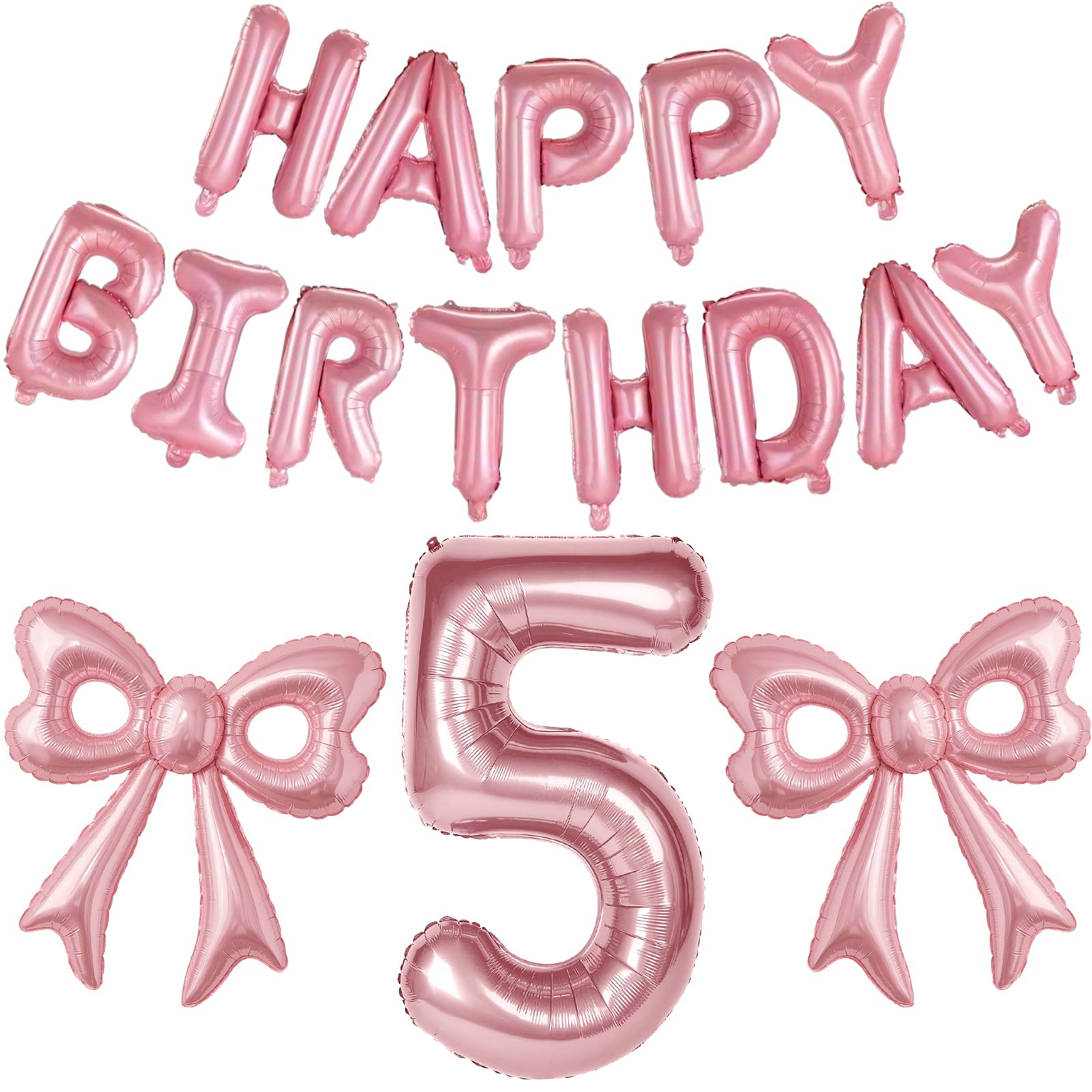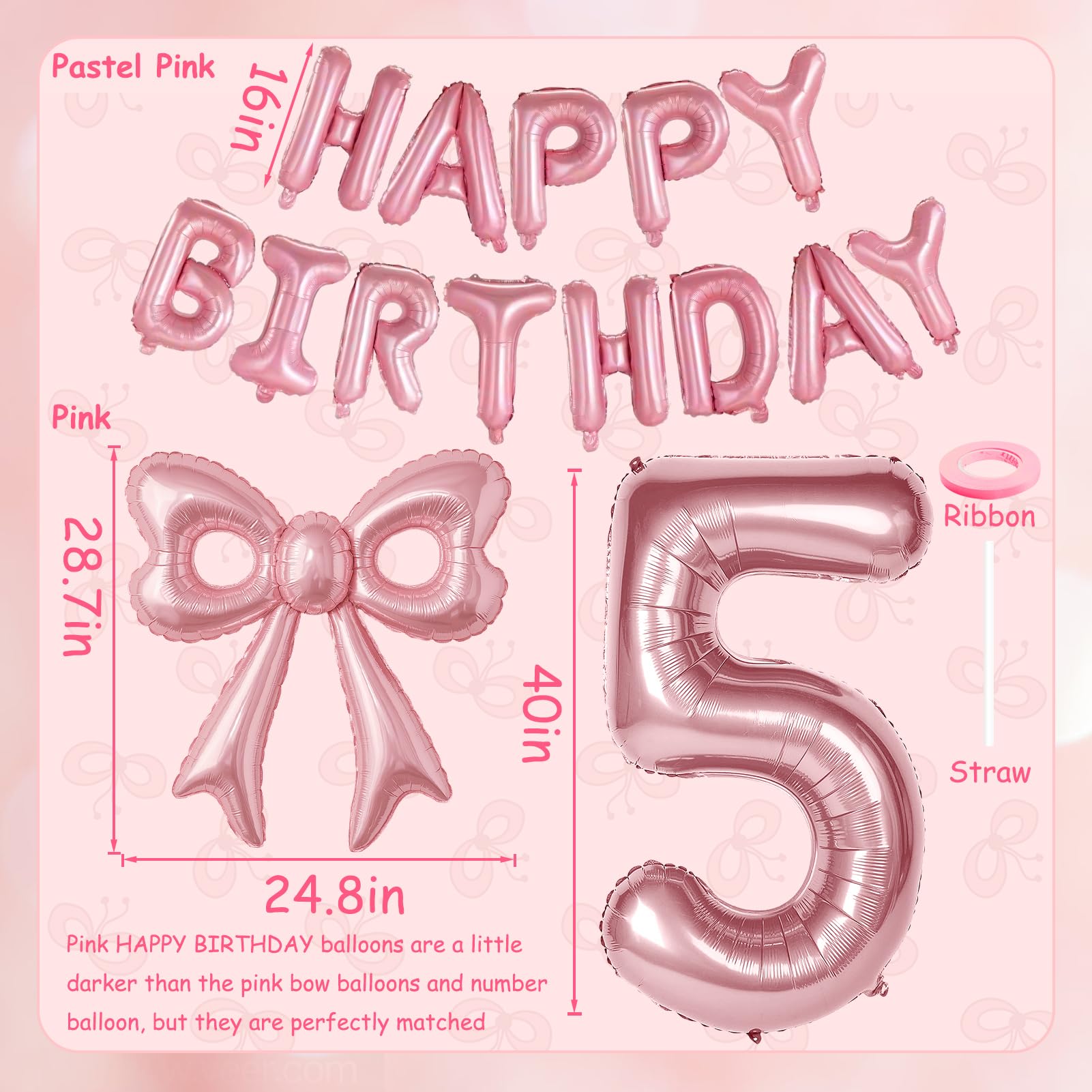 Number Birthday Balloon: Come on baby! Let's go to a pink dream birthday party! You will get 1pcs 40in pink number 5 balloons, 2 pcs pink bow balloons, size: 31.5x 30 inch, 1 pcs 16in HAPPY BIRTHDAY balloon. Package comes with 10m/ 32.8ft ribbon and 1pcs inflation straw. The novel pairing will add some creativity to the decorations of your girl's 5th birthday party.