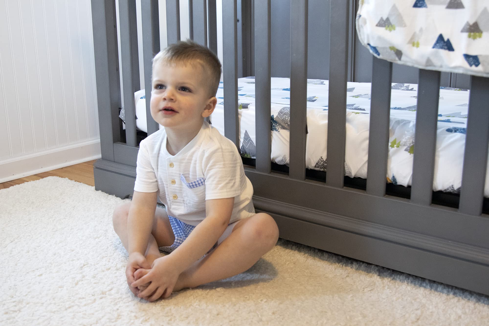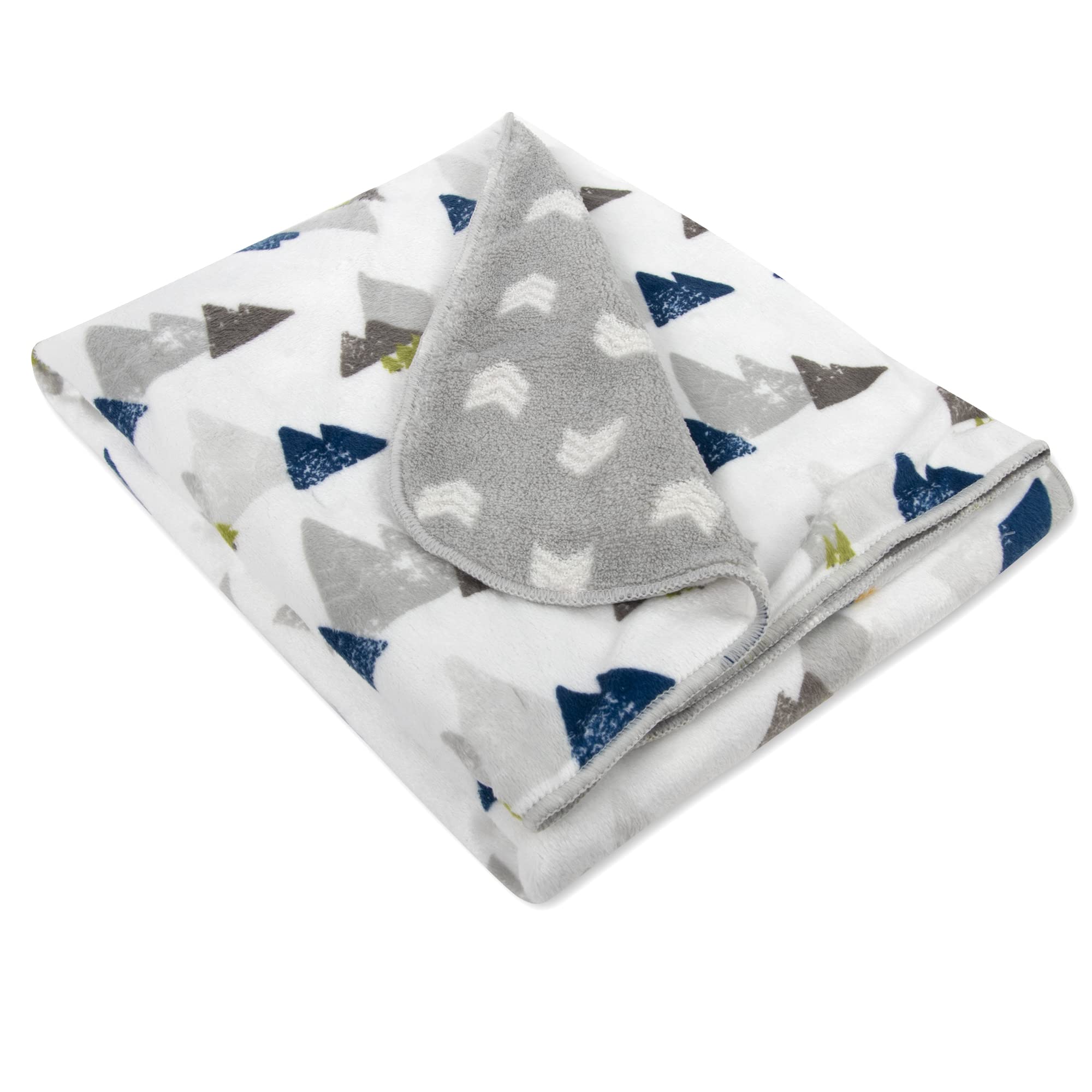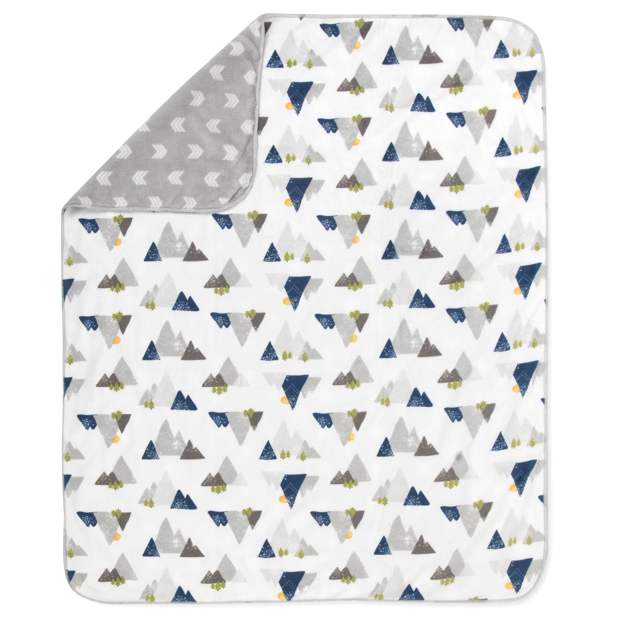 REVERSIBLE BABY BLANKET: Fleece blanket for baby boy or baby girl includes aoutdoor mountain scene on one side, with a smooth, sherpa-soft grey & white arrows reverse side that complements any room theme or décor