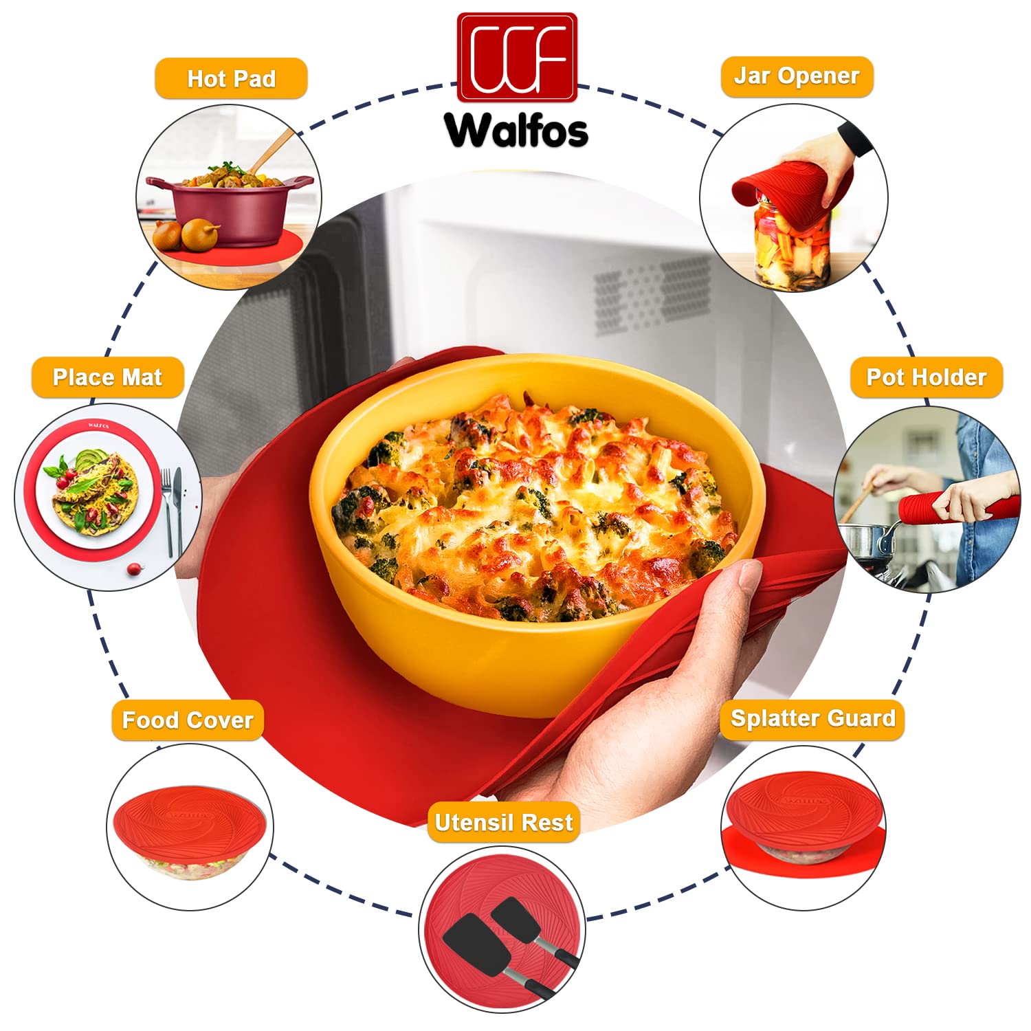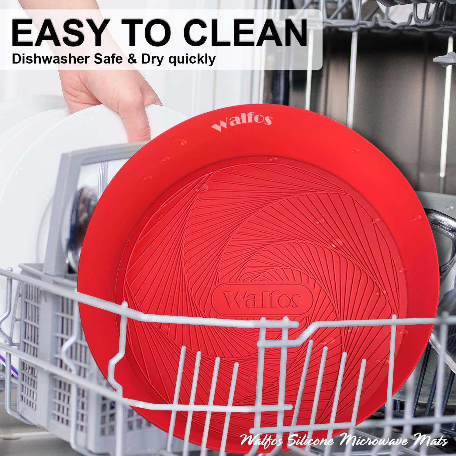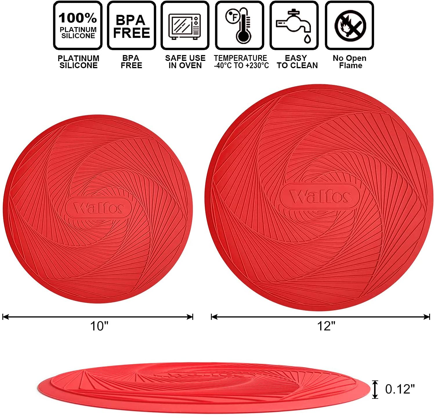 MULTIPURPOSE SILICONE MAT: Walfos Microwave Silicone Mat is perfect to use as microwave splatter cover, hot pads for kitchen, trivets for hot pots and pans, silicone pot holders, place mat, baking mat, drying mat, utensils rest, jar opener, etc. Package Includes: Two Round Microwave Mats (one 10 inch & one 12 inch)